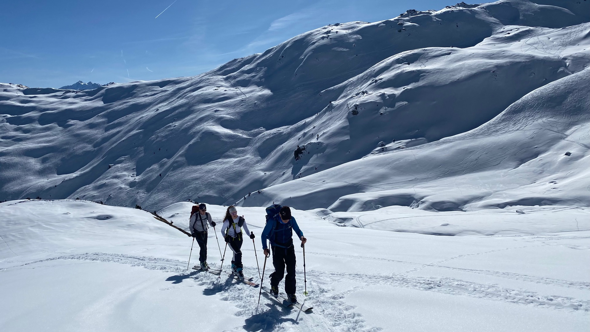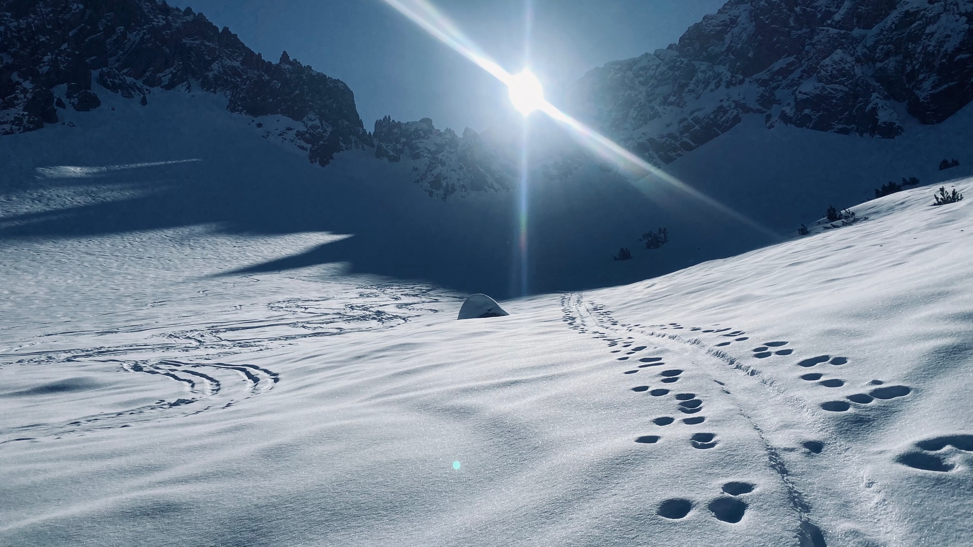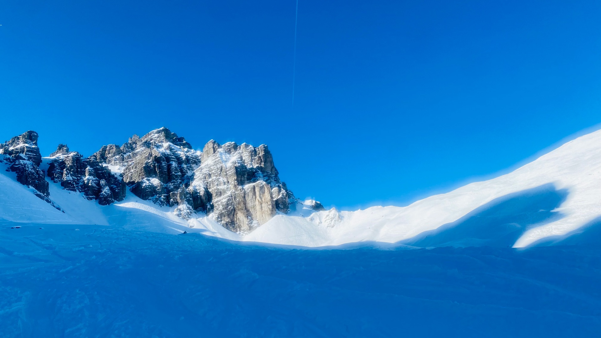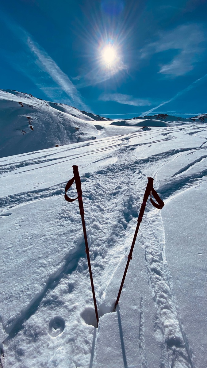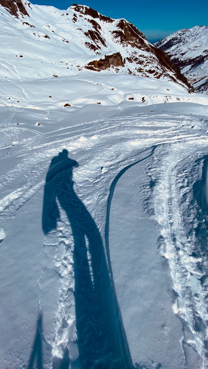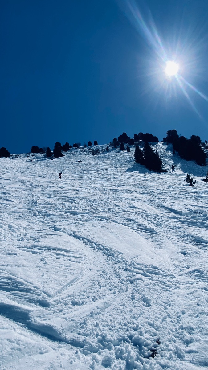 Schneequalität schattseitig meist pulvrig und etwas plattig, sonnenbeschienene Abschnitte oft Bruchharsch.