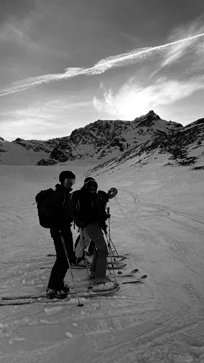 Von St. Sigmund zur Pforzheimer Hütte, 800 hm und flach ansteigend, weiter über Gleirschseen undGleirschferner die steile Scharte hinauf zum Gipfel, teils mit Ski, teils in steiler Stapfspur.