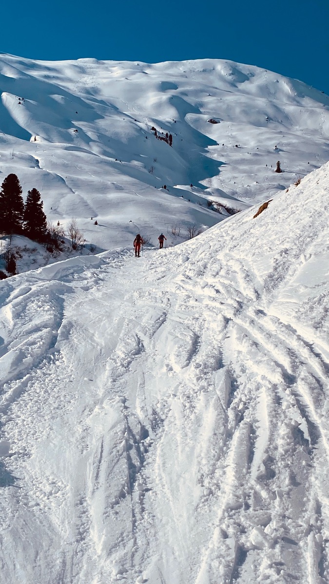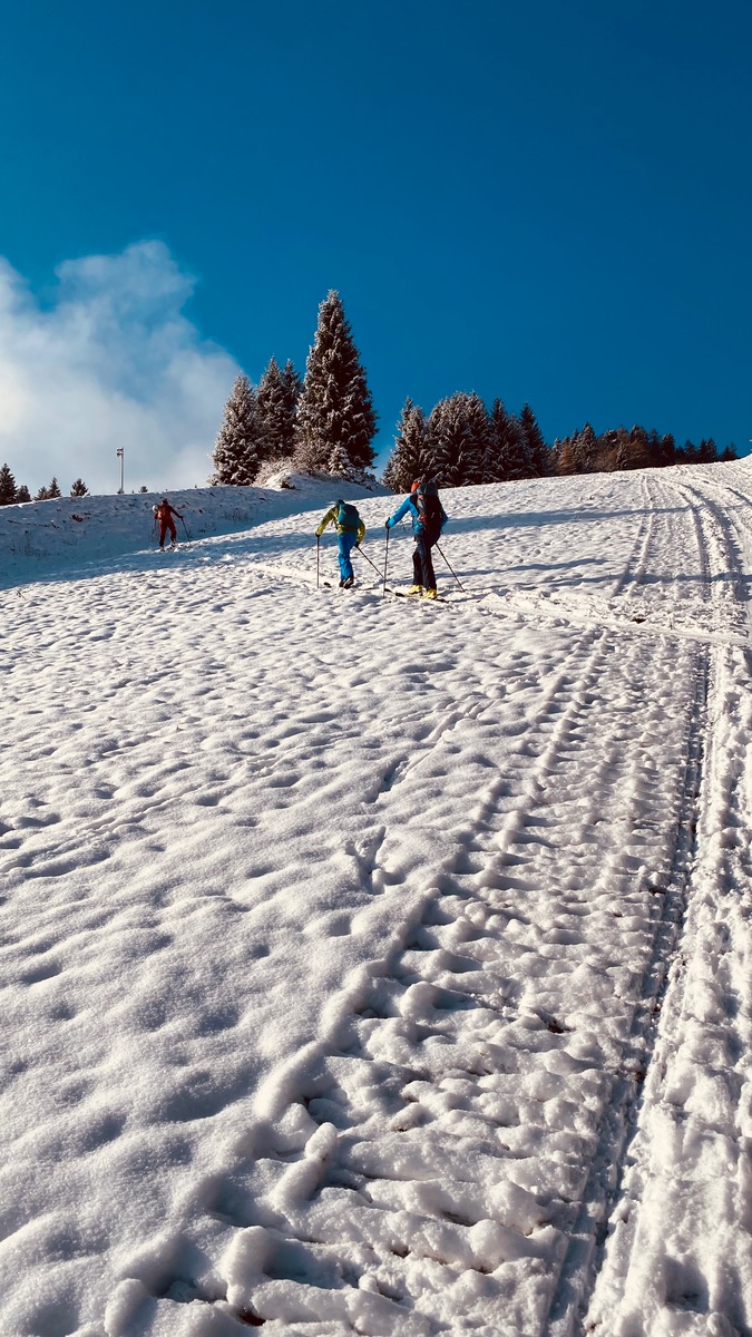 Gestern und heute Pistenskitour in der Christlum, oben 20 cm Pulver auf guter Kunstscbneeunterlage, unten Kunstschnee, der schlecht fahrbar ist, Nordhang zwar wenig Schnee aber ganz gut zum Abfahren