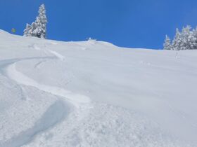 5 cm Neuschnee über Nacht, in den windberuhigten Bereichen liegen ca. 30 cm bester Pulverschnee auf einer harten Altschneeoberfläche. Aber auch sonst geht's im Gelände ganz ordentlich. Es lauern halt überall sharks, welche für die notwendige Spannung sorgen.