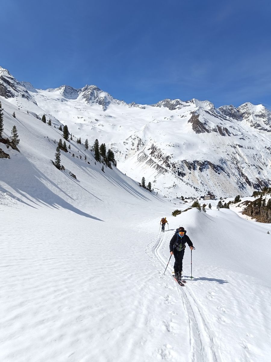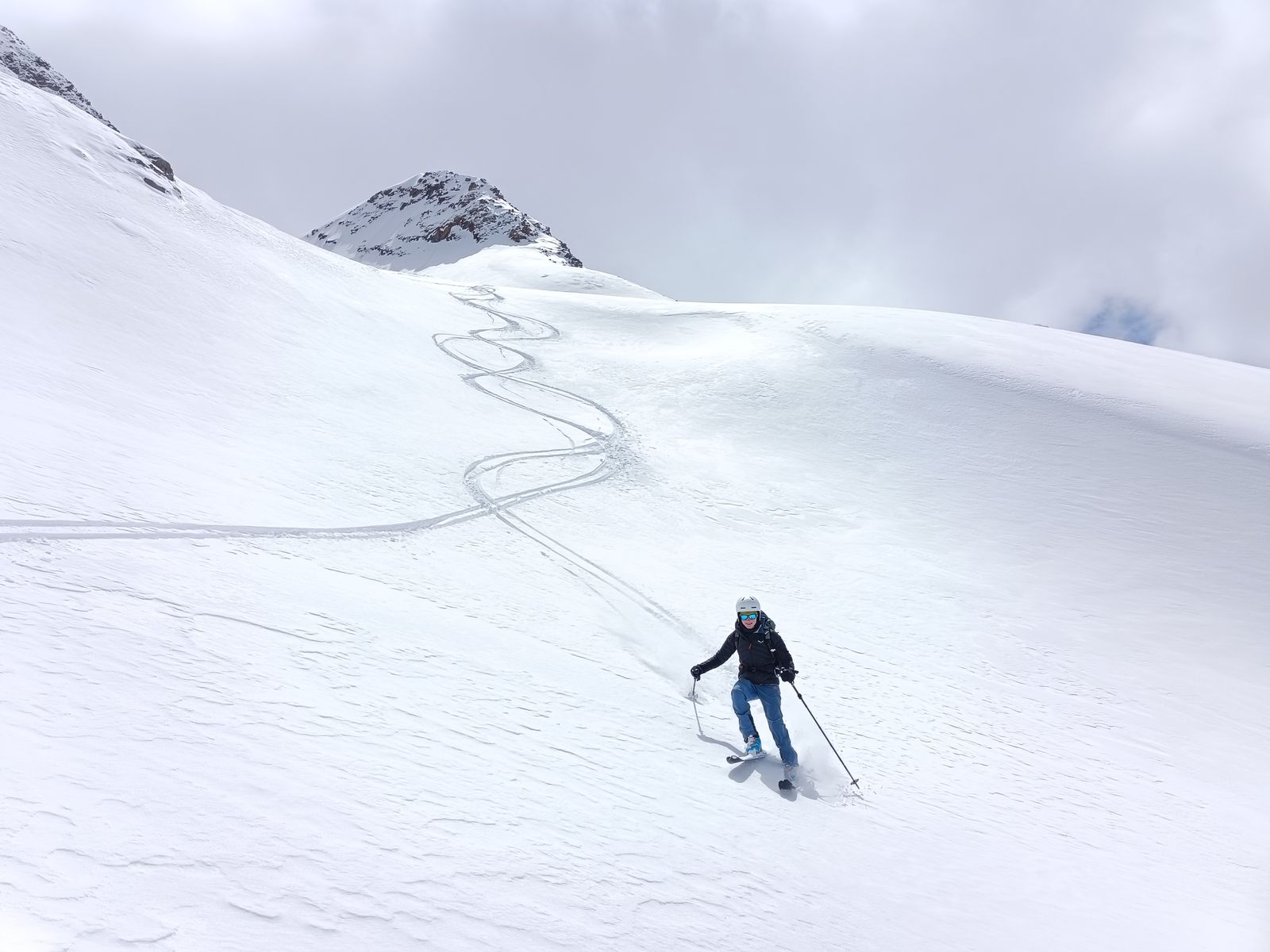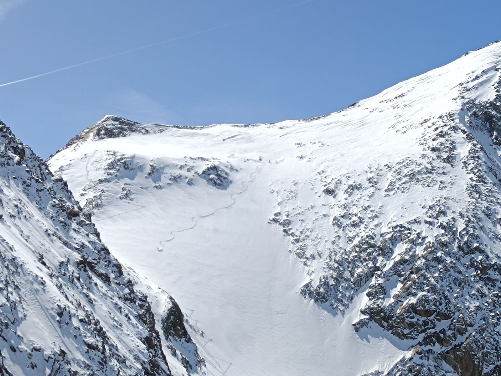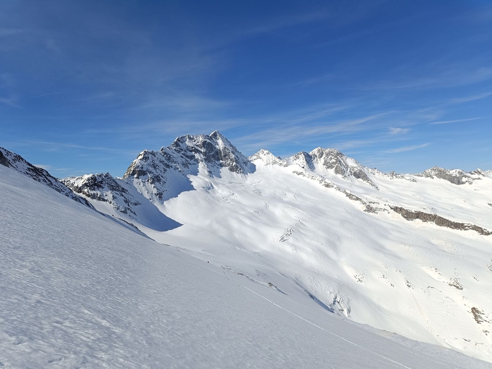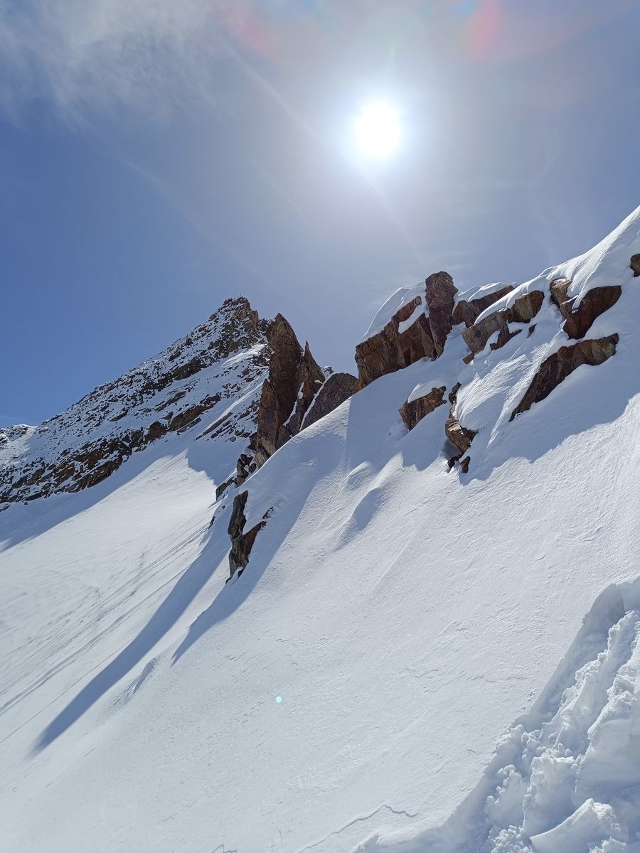Heute haben wir es dann wirklich perfekt erwischt: Während das Gros der Kollegen karawanenartig zu Kuhscheibe und Hinterem Daunkopf pilgerte, sind wir zunächst völlig allein zur Zahmen Leck (nur bis Skidepot). Super Abfahrt um 10 Uhr (ostexponiert) : Oben Pulver, unten Firn. Anschließend ging es über den Sulztalferner via Wütekarsattel zum (Vorgipfel - Hauptgipfel auf dieser Route nicht mehr sinnvoll erreichbar) des Windacher Daunkogels. Großartiges Panorama. Für die Abfahrt ist es bei passenden Verhältnissen sehr lohnend, den Anstiegsweg nur etwa 100 Hm abzufahren und dann direkt in die steile Nordflanke zu stechen. Haben heute komischer Weise aber nur wir gemacht. Die Abfahrt (13.15 Uhr) war schlicht berauschend: den ganzen Gletscher Pulver und darunter Edelfirn, wo man es beim Carven so richtig krachen lassen kann.