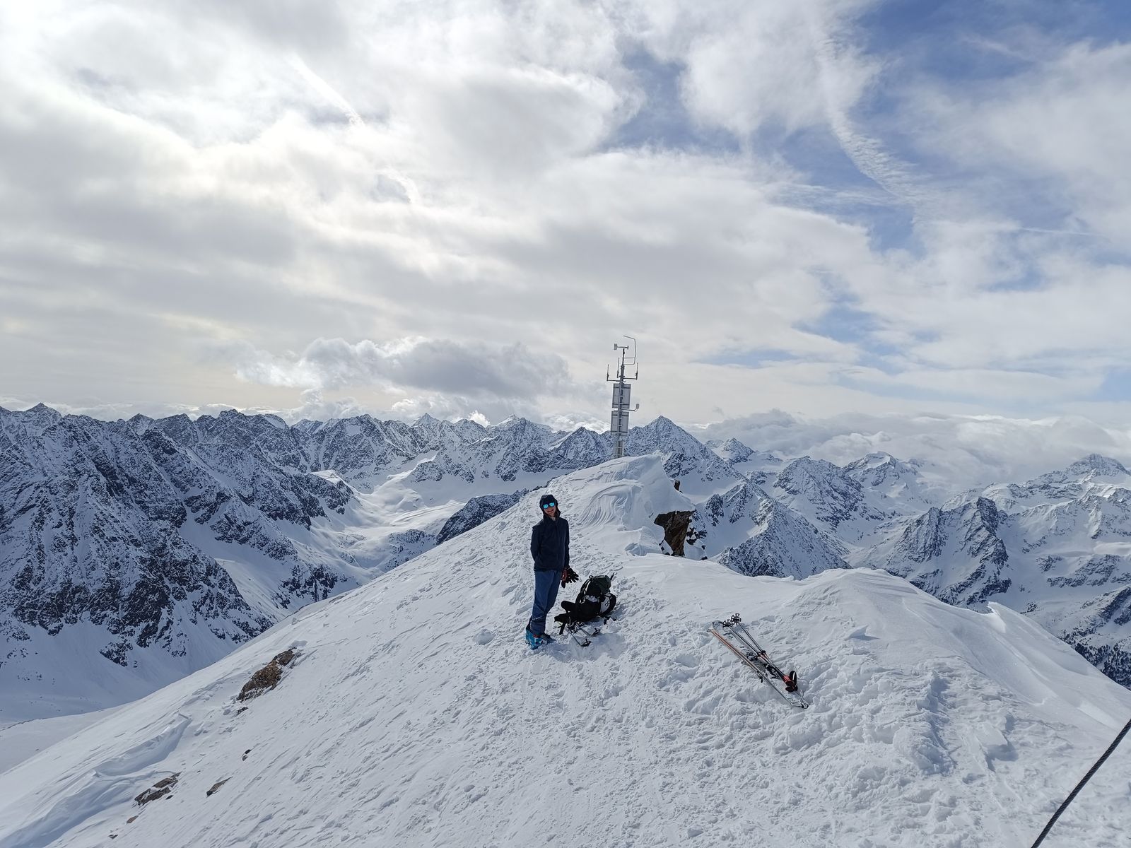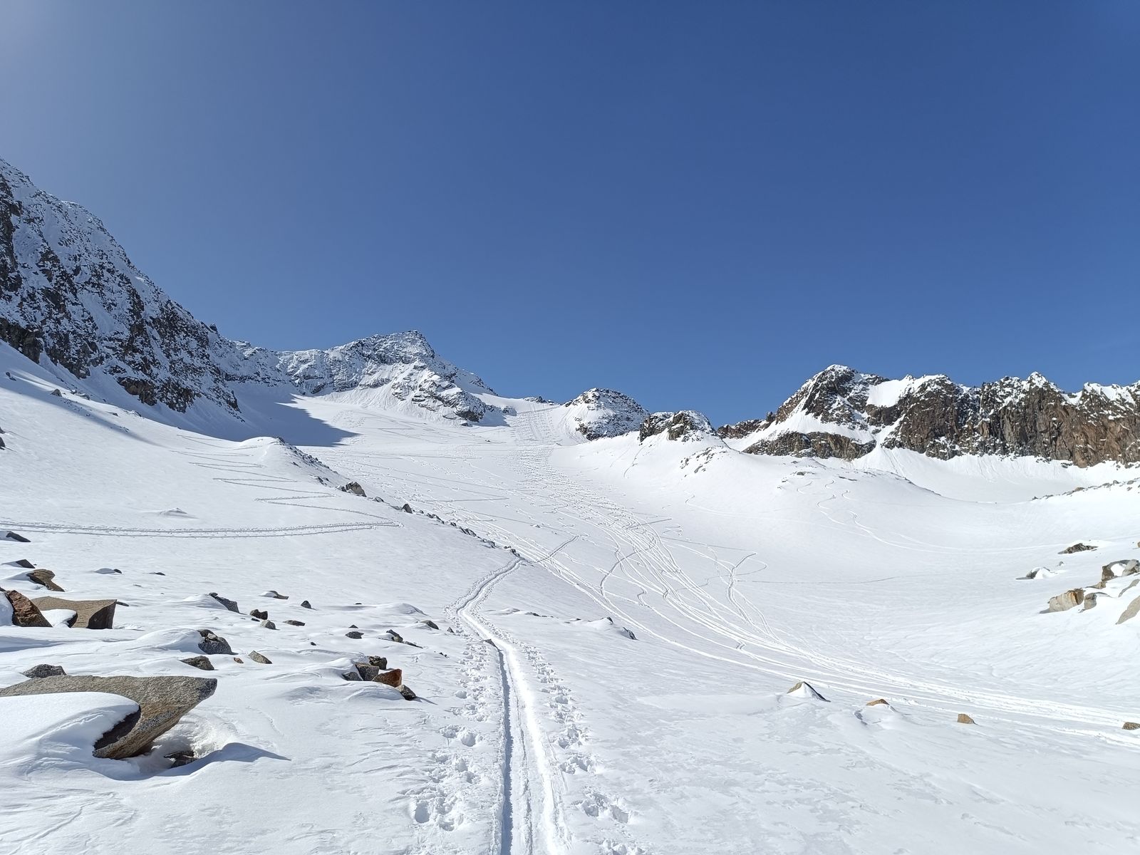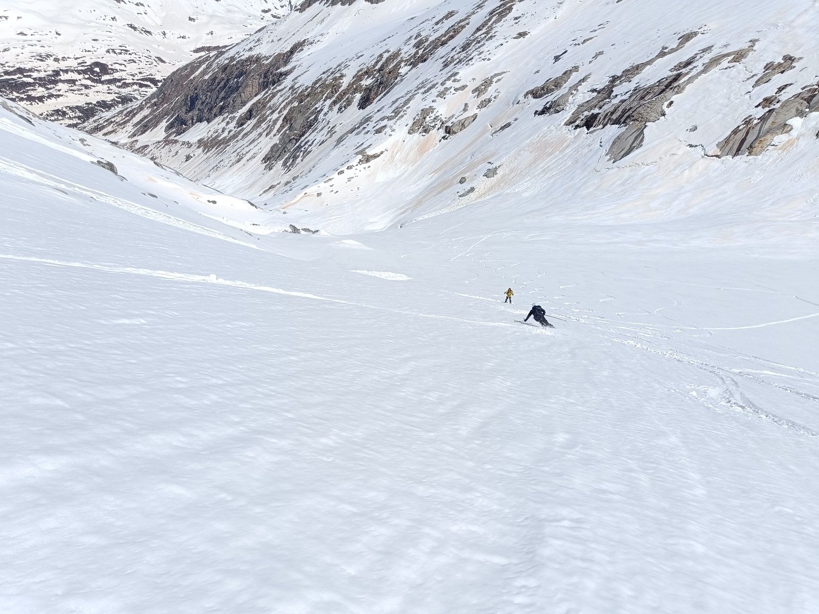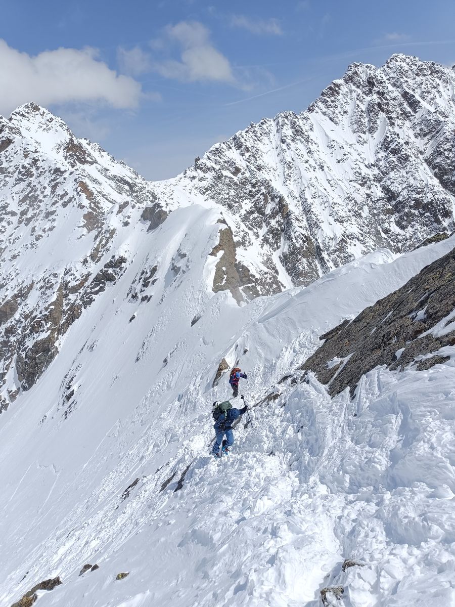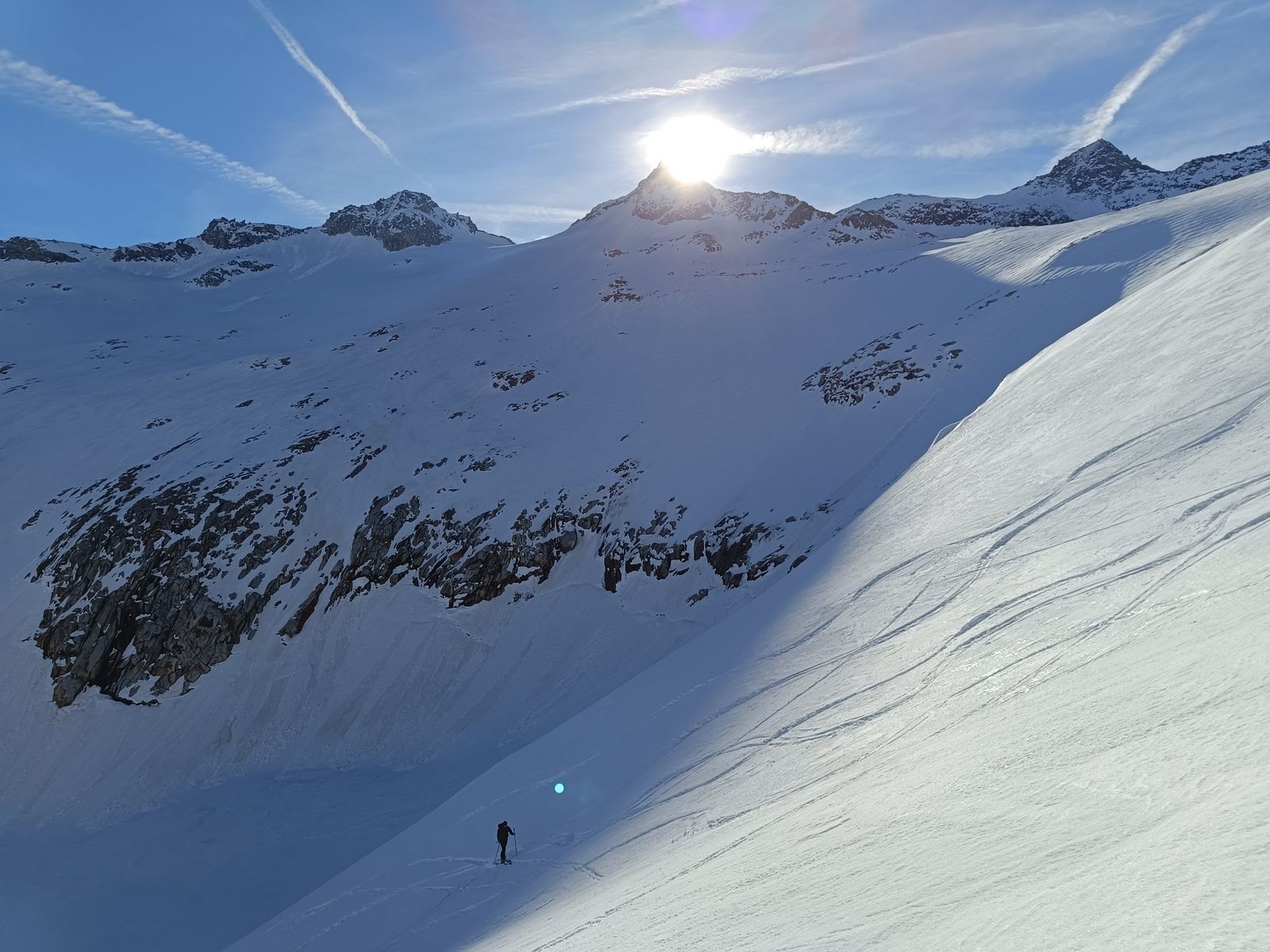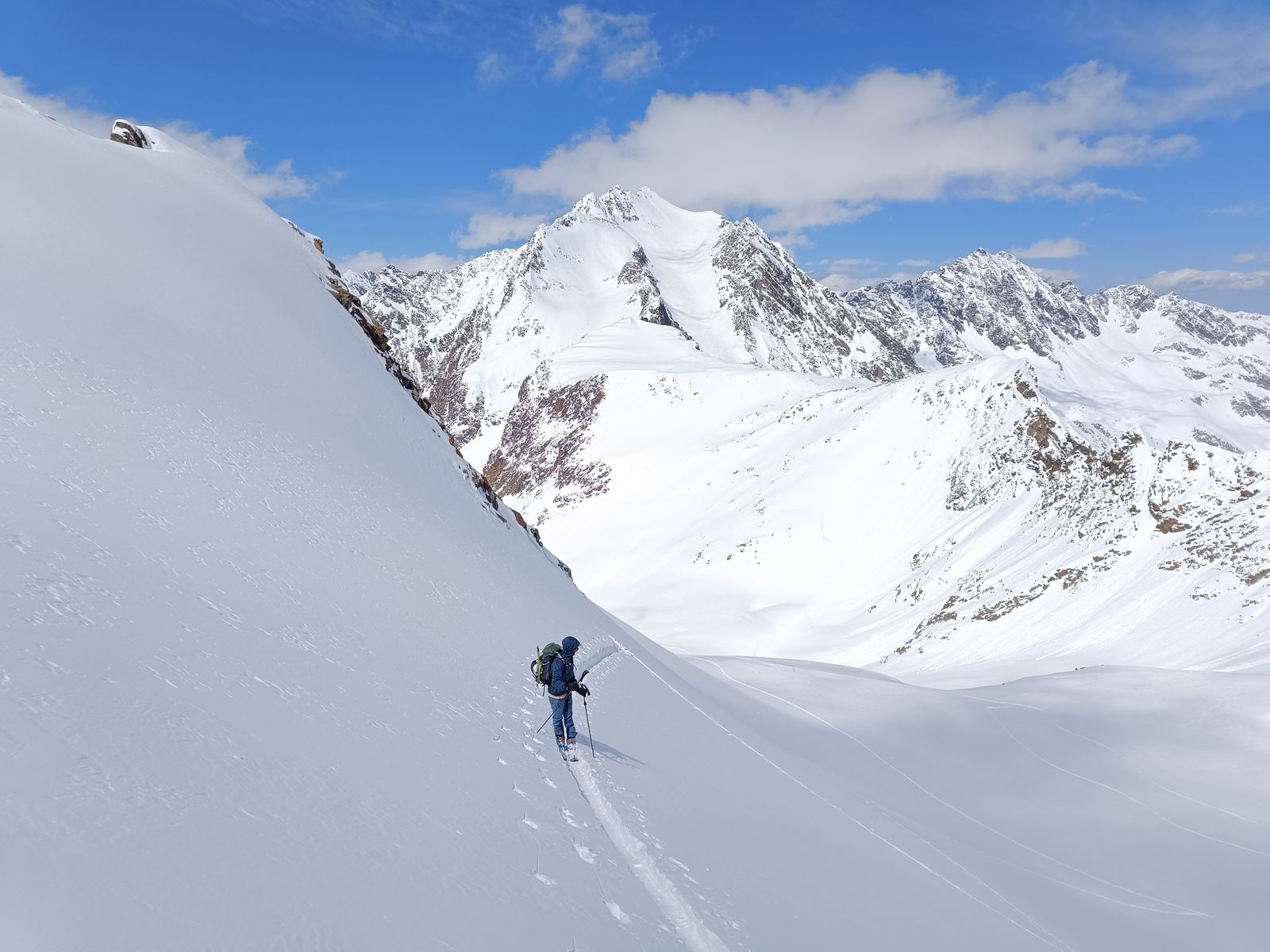Heute haben wir es dann wirklich perfekt erwischt: Während das Gros der Kollegen karawanenartig zu Kuhscheibe und Hinterem Daunkopf pilgerte, sind wir zunächst völlig allein zur Zahmen Leck (nur bis Skidepot). Super Abfahrt um 10 Uhr (ostexponiert) : Oben Pulver, unten Firn. Anschließend ging es über den Sulztalferner via Wütekarsattel zum (Vorgipfel - Hauptgipfel auf dieser Route nicht mehr sinnvoll erreichbar) des Windacher Daunkogels. Großartiges Panorama. Für die Abfahrt ist es bei passenden Verhältnissen sehr lohnend, den Anstiegsweg nur etwa 100 Hm abzufahren und dann direkt in die steile Nordflanke zu stechen. Haben heute komischer Weise aber nur wir gemacht. Die Abfahrt (13.15 Uhr) war schlicht berauschend: den ganzen Gletscher Pulver und darunter Edelfirn, wo man es beim Carven so richtig krachen lassen kann.