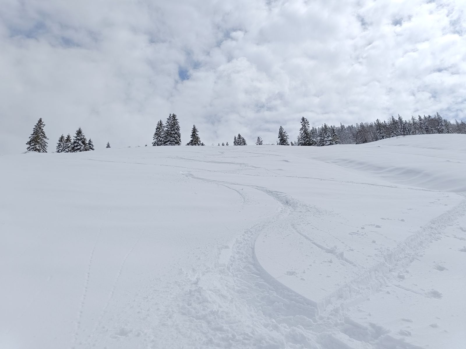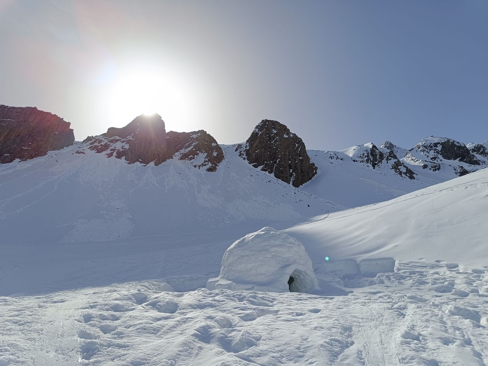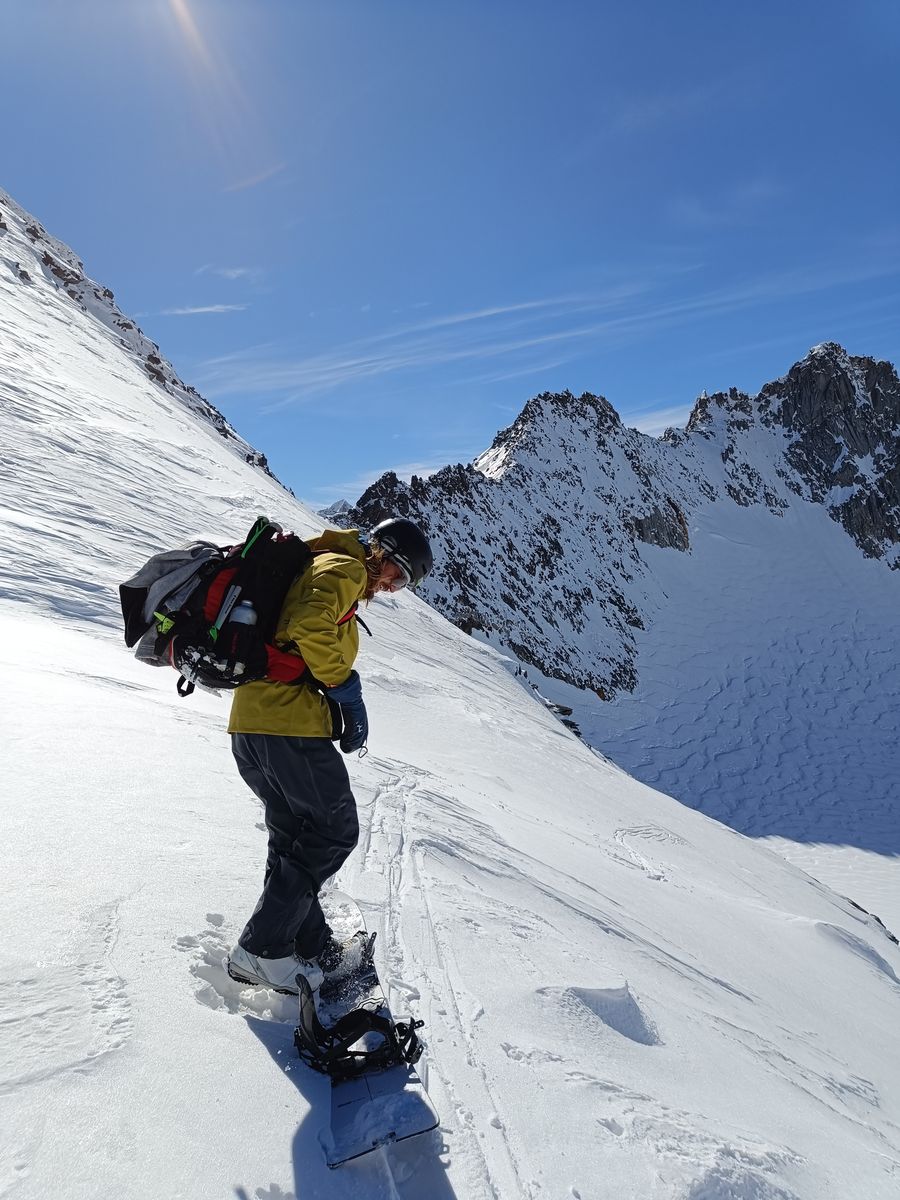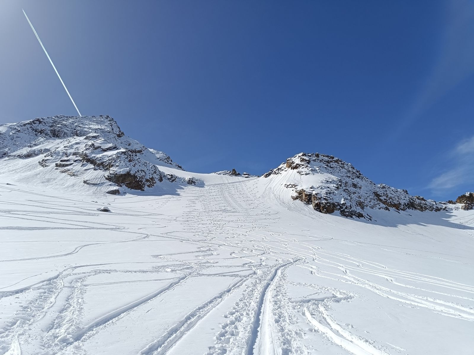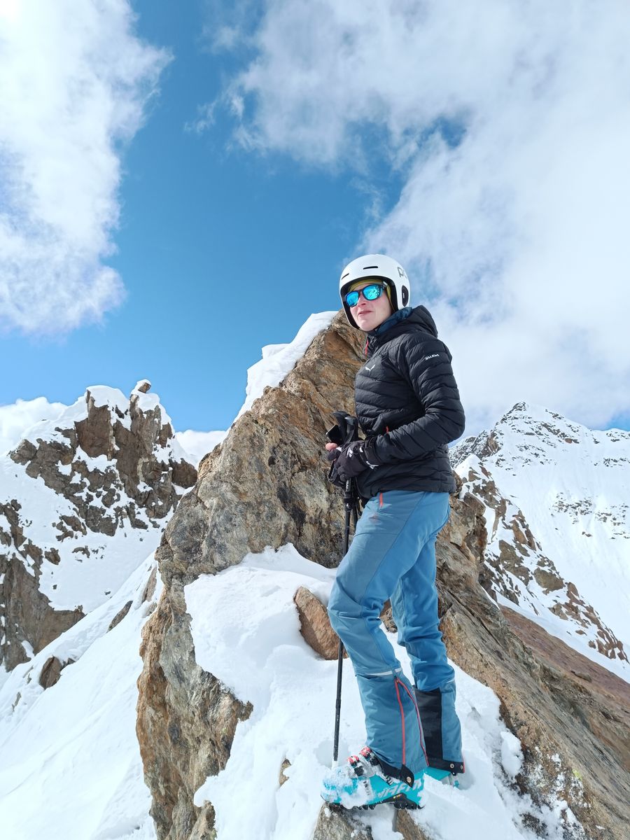 Heute haben wir es dann wirklich perfekt erwischt: Während das Gros der Kollegen karawanenartig zu Kuhscheibe und Hinterem Daunkopf pilgerte, sind wir zunächst völlig allein zur Zahmen Leck (nur bis Skidepot). Super Abfahrt um 10 Uhr (ostexponiert) : Oben Pulver, unten Firn. Anschließend ging es über den Sulztalferner via Wütekarsattel zum (Vorgipfel - Hauptgipfel auf dieser Route nicht mehr sinnvoll erreichbar) des Windacher Daunkogels. Großartiges Panorama. Für die Abfahrt ist es bei passenden Verhältnissen sehr lohnend, den Anstiegsweg nur etwa 100 Hm abzufahren und dann direkt in die steile Nordflanke zu stechen. Haben heute komischer Weise aber nur wir gemacht. Die Abfahrt (13.15 Uhr) war schlicht berauschend: den ganzen Gletscher Pulver und darunter Edelfirn, wo man es beim Carven so richtig krachen lassen kann.