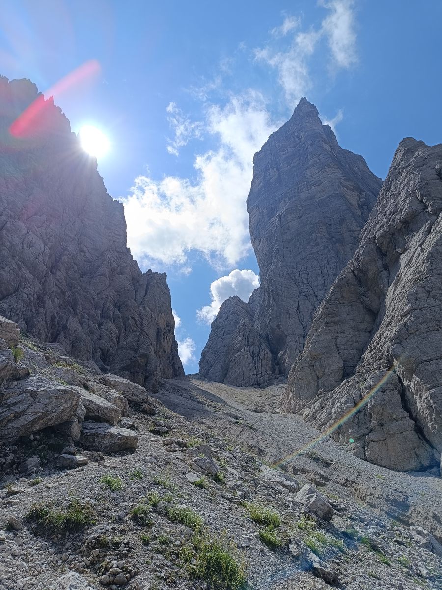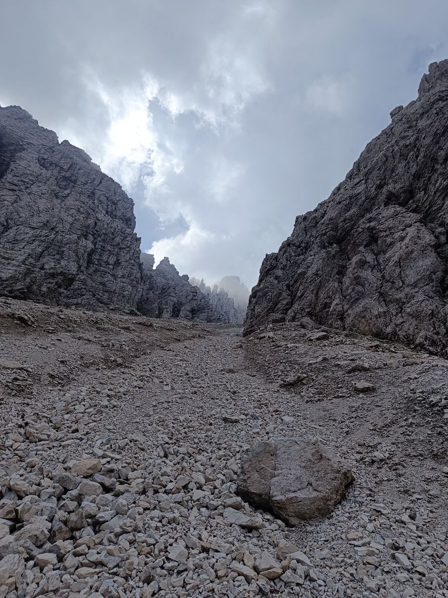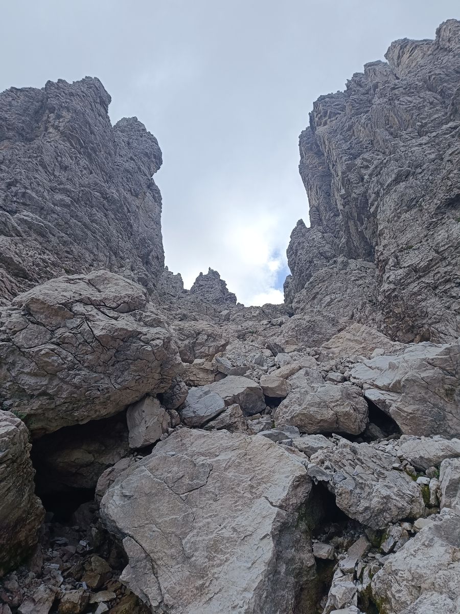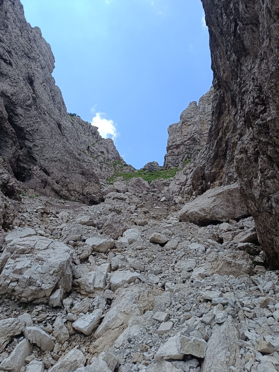 Gefahreneinschätzung: in den Karen wirklich extreme Steinschlaggefahr - Helm Pflicht. Was mir bei den wenigen Leuten, die ich getroffen habe, auch aufgefallen ist, ist, dass viele überfordert schienen. Wie zum Beispiel drei kreideweiße Italiener, die mir von der Forcella Cason entgegenkamen oder auch die drei jungen Burschen ("bruttissima"). Wir sind fast zusammen von der Scharte gestartet und als ich eine Stunde später in der Monfalconi-Scharte war, sind sie immer noch nicht unten gewesen - vermutlich haben sie umgedreht.