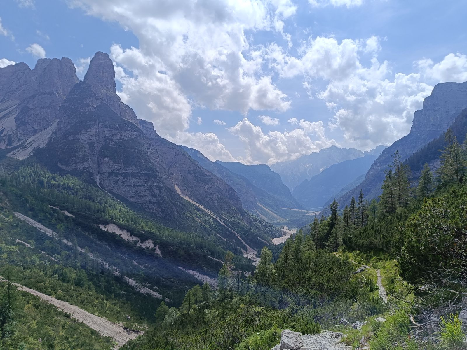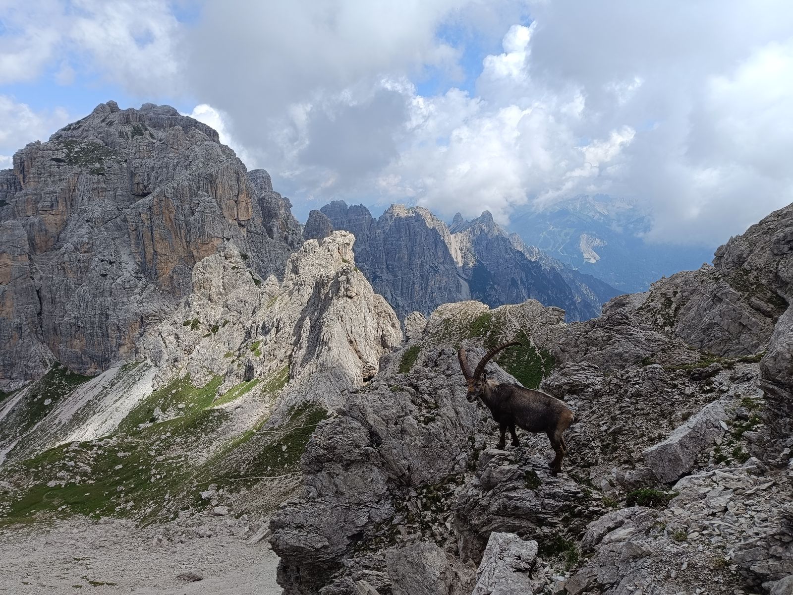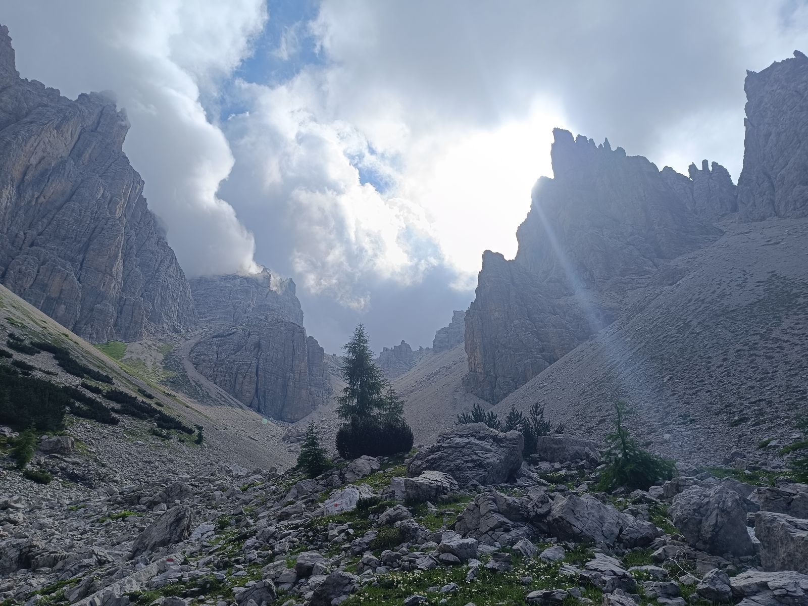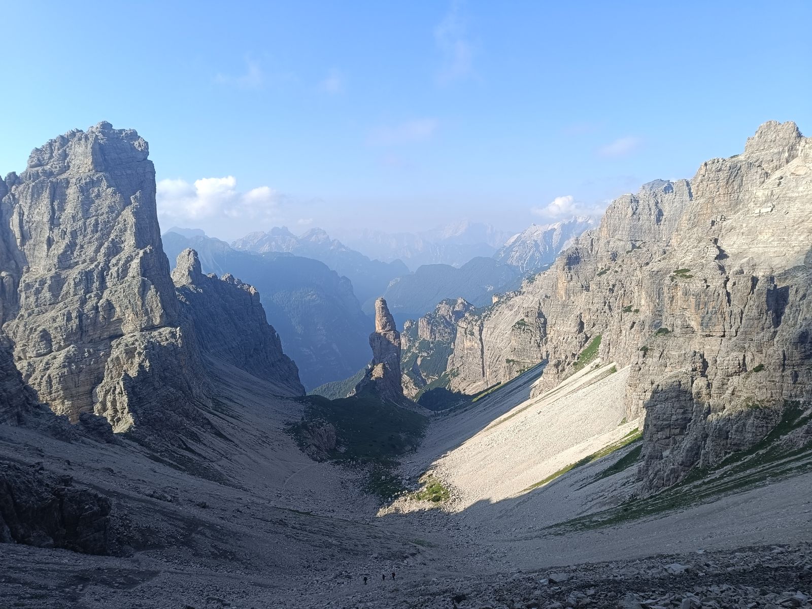Was man aber nicht versäumen sollte, ist von der Cason-Scharte auf Steigspuren wenige Meter zu einer etwas höheren Scharte aufzusteigen, da es dort einen unglaublichen Blick ins wilde Herz der Monfalconi-Gruppe gibt. Ich stand da und war einfach gebannt: Zwischen gewaltigen, zerrissenen Felswänden zieht hier ein brutal steiles Kar hinab... Ich brauchte doch ein paar Minuten, um zu realisieren, dass es genau das Kar war, durch das ich am späten Vormittag runter bin... Gut, dass ich diesen Blick erst später hatte.