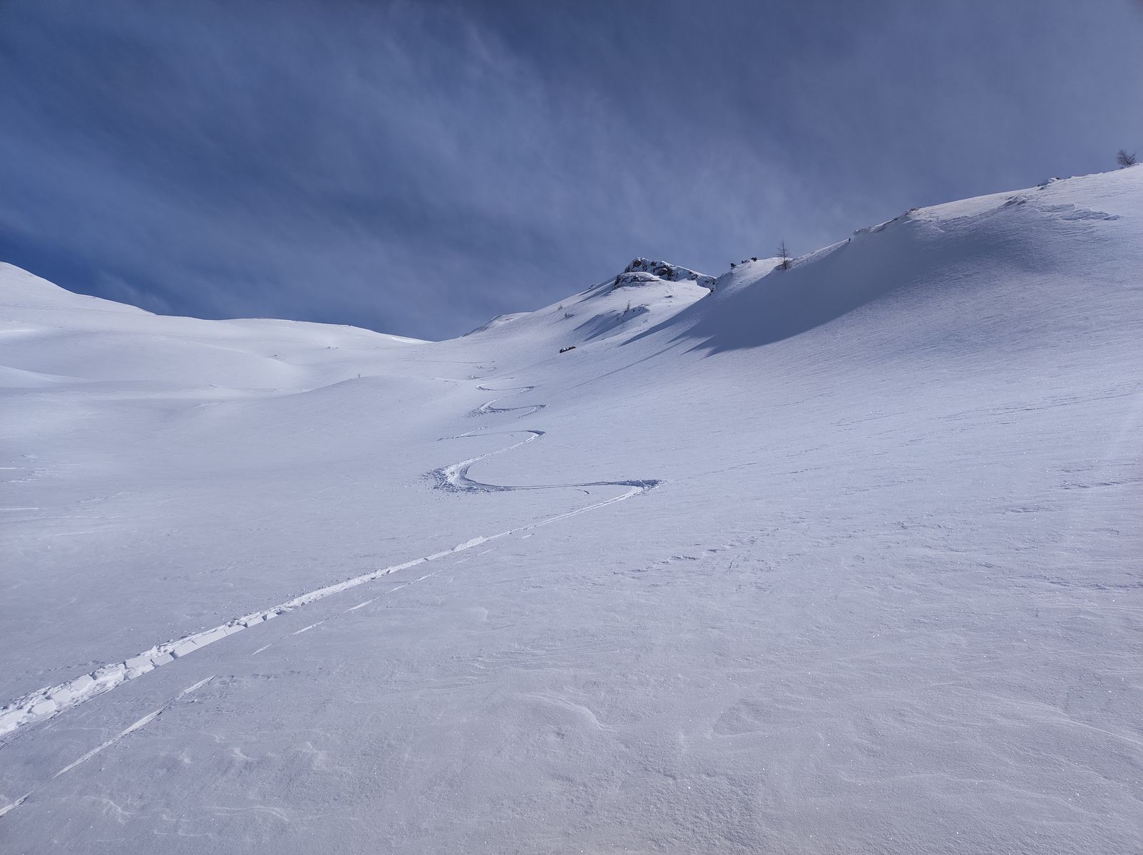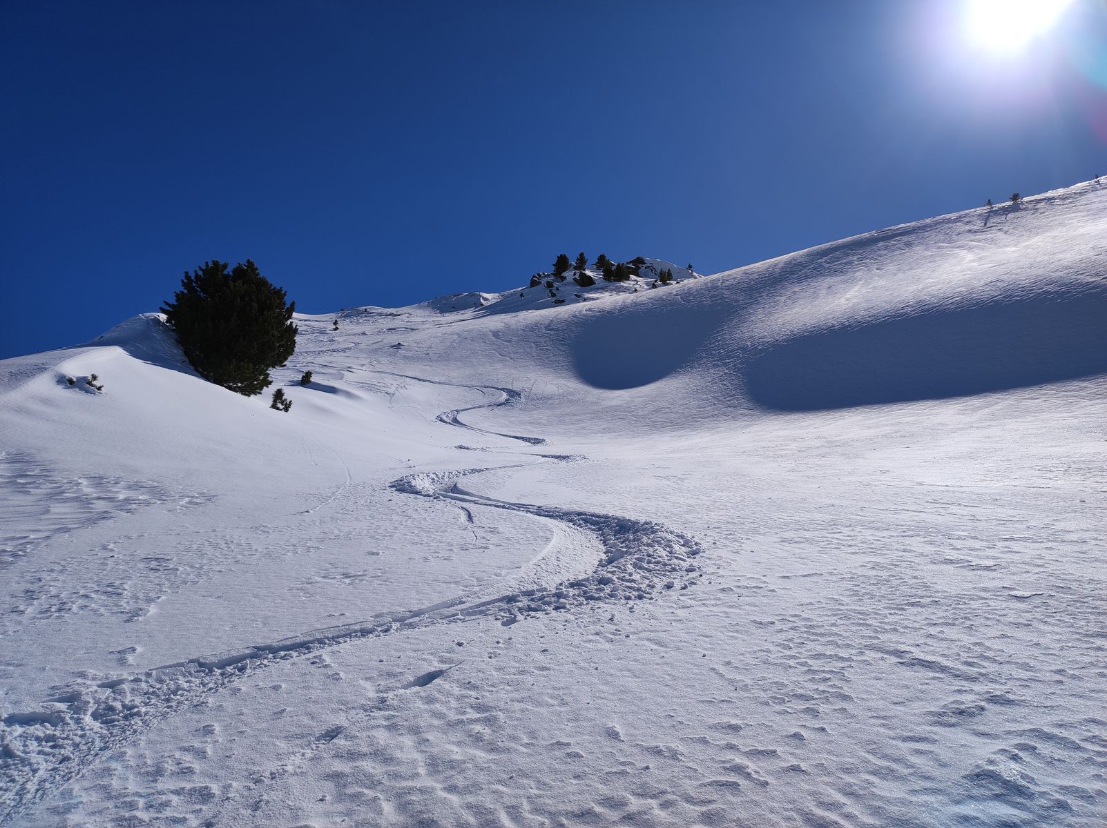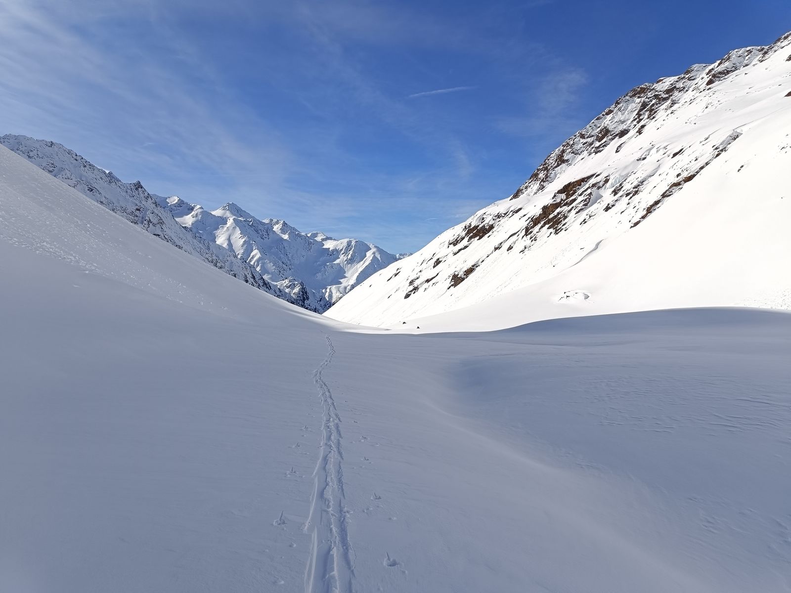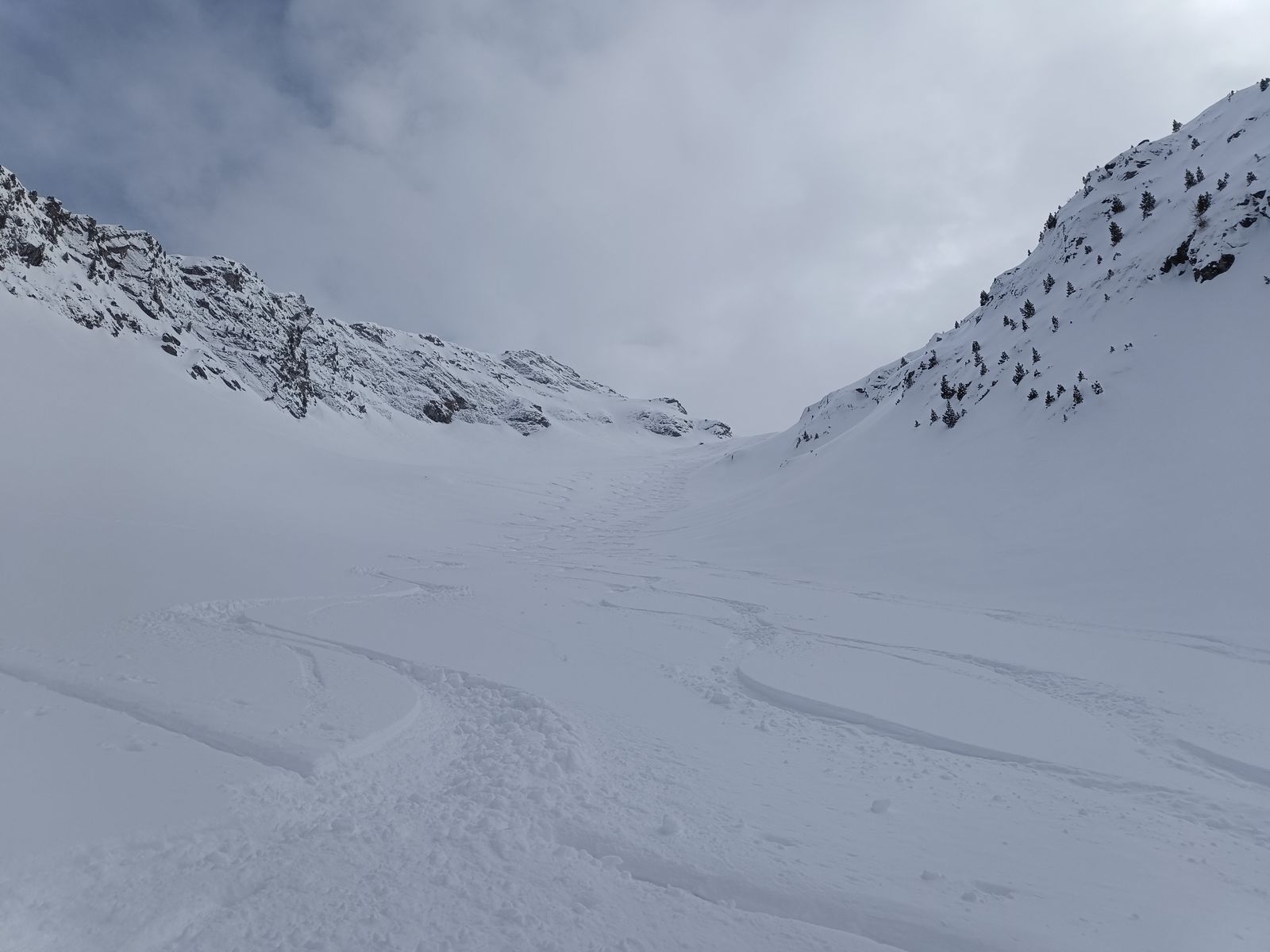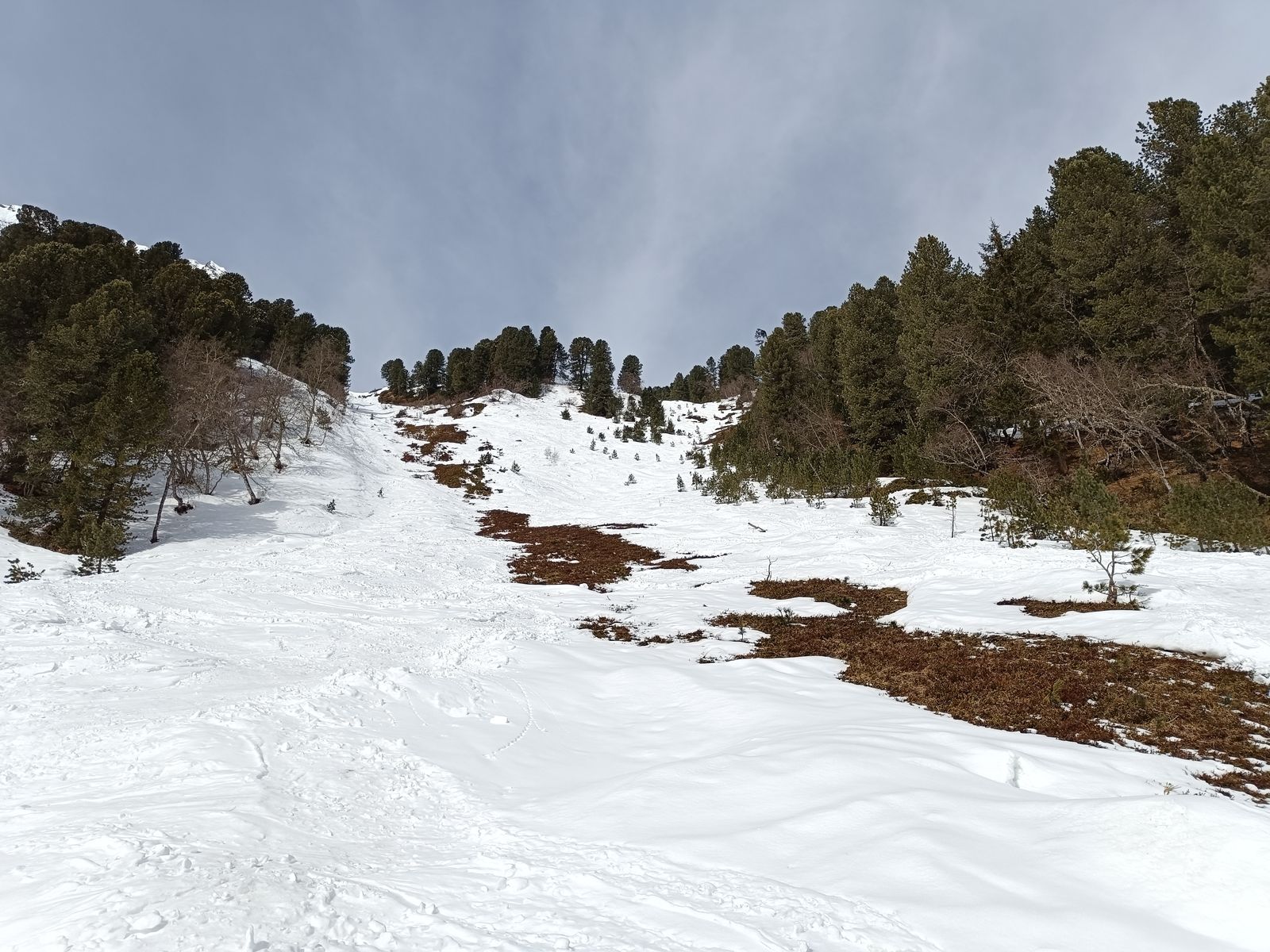 Da die Latschen sehr gut eingeschneit sind, bieten sich in den unteren Hängen wahnsinnig viele Variationsmöglichkeiten. Die 2. Abfahrt habe ich so gewählt, dass ich unmittelbar in der Grube unter dem Steinernen Törl rauskomme. Da bin ich dann hoch und links des Törls auf eine alte Aufstiegsspur zum Streichkopf gestoßen, der ich gefolgt bin. Toll auf einem sicheren Rücken angelegt! Die folgende Abfahrt war die beste des Tages und führte mich durch die herrliche Riesenmulde bis kurz oberhalb der Dalfazer Alm.