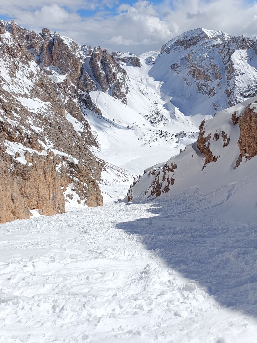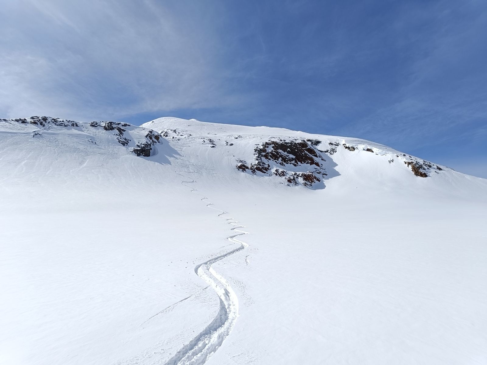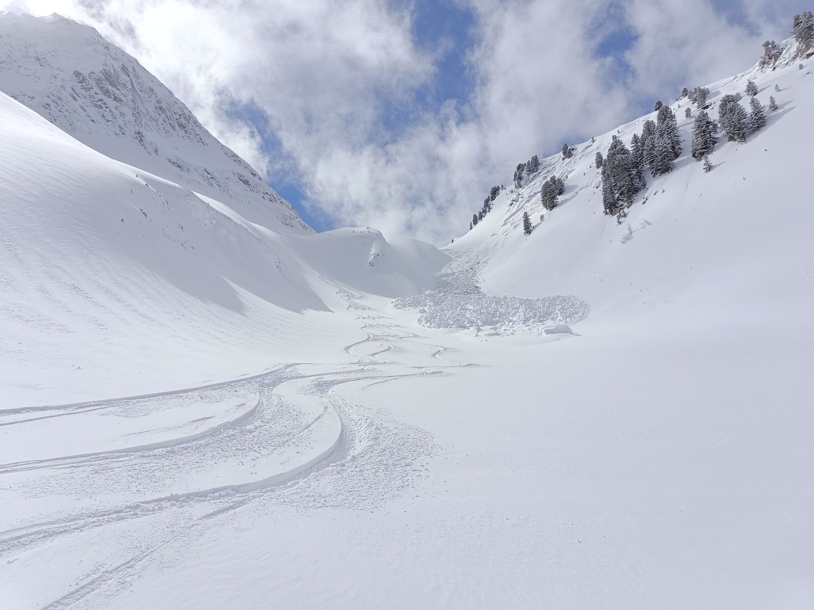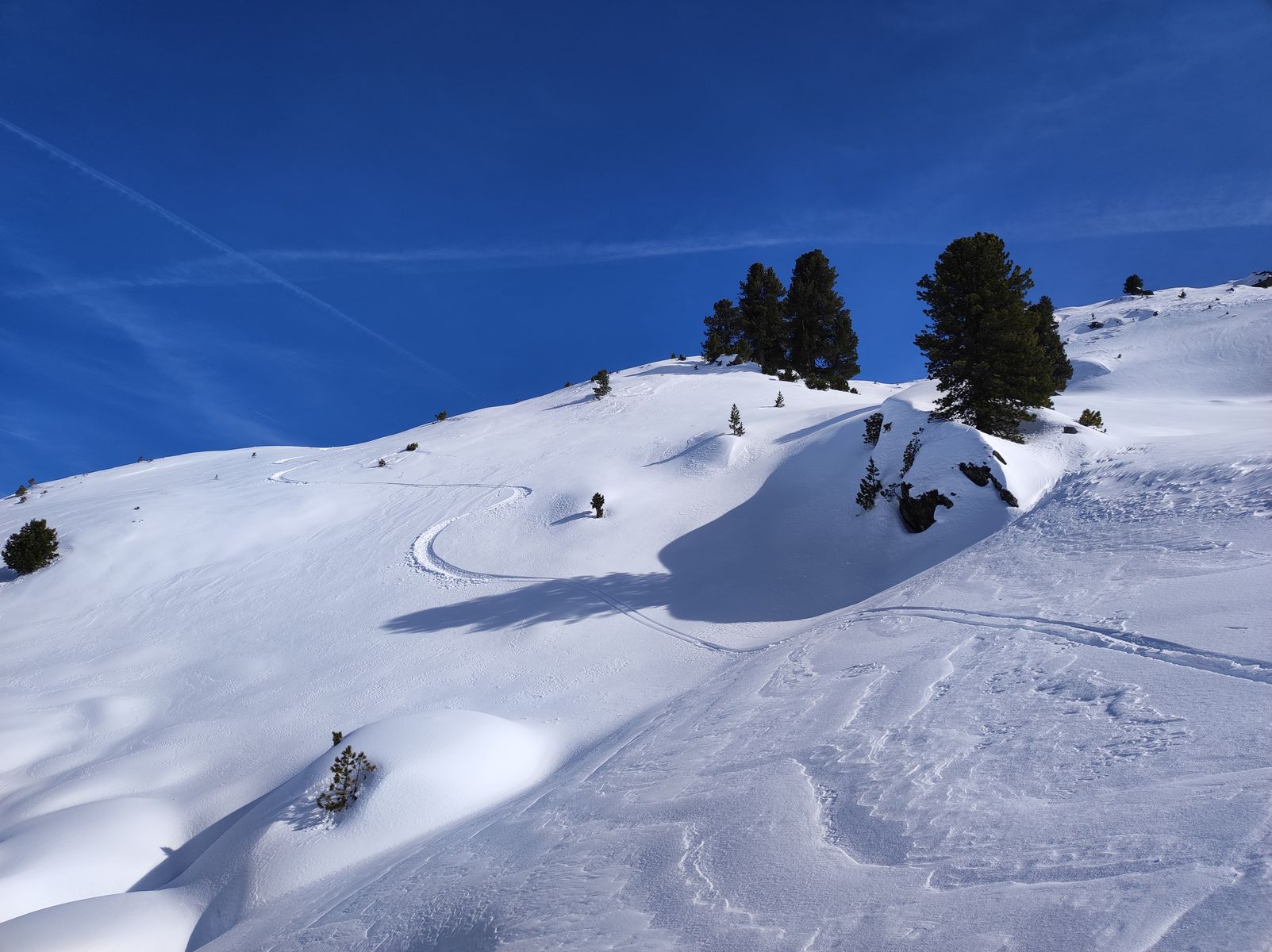 Da die Latschen sehr gut eingeschneit sind, bieten sich in den unteren Hängen wahnsinnig viele Variationsmöglichkeiten. Die 2. Abfahrt habe ich so gewählt, dass ich unmittelbar in der Grube unter dem Steinernen Törl rauskomme. Da bin ich dann hoch und links des Törls auf eine alte Aufstiegsspur zum Streichkopf gestoßen, der ich gefolgt bin. Toll auf einem sicheren Rücken angelegt! Die folgende Abfahrt war die beste des Tages und führte mich durch die herrliche Riesenmulde bis kurz oberhalb der Dalfazer Alm.