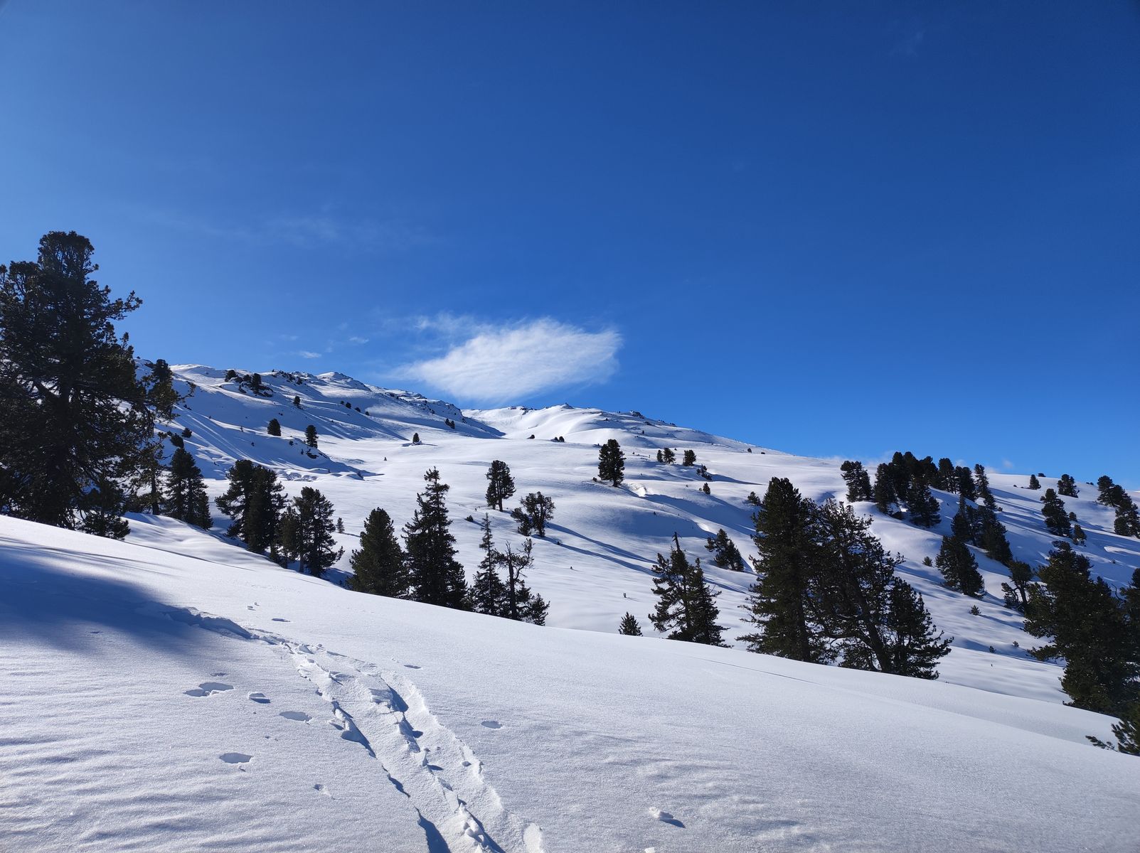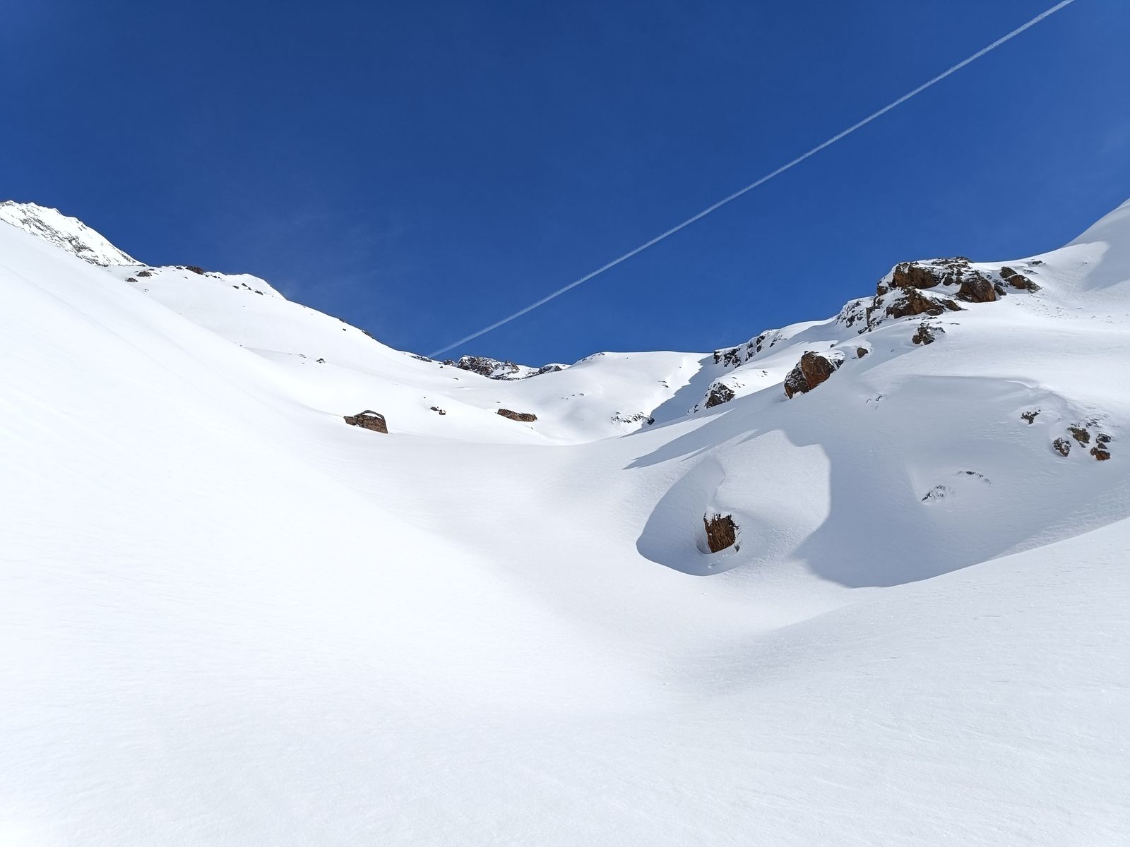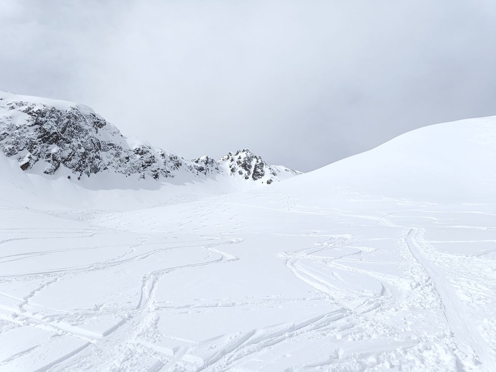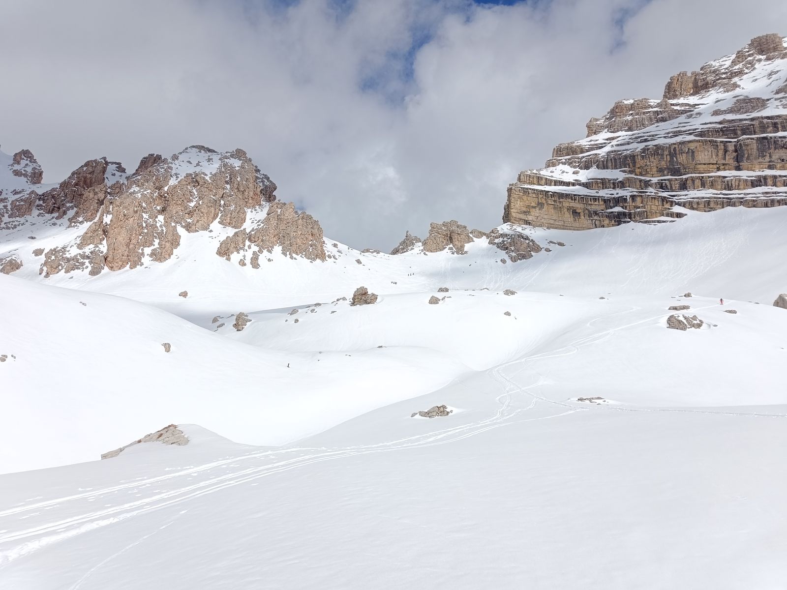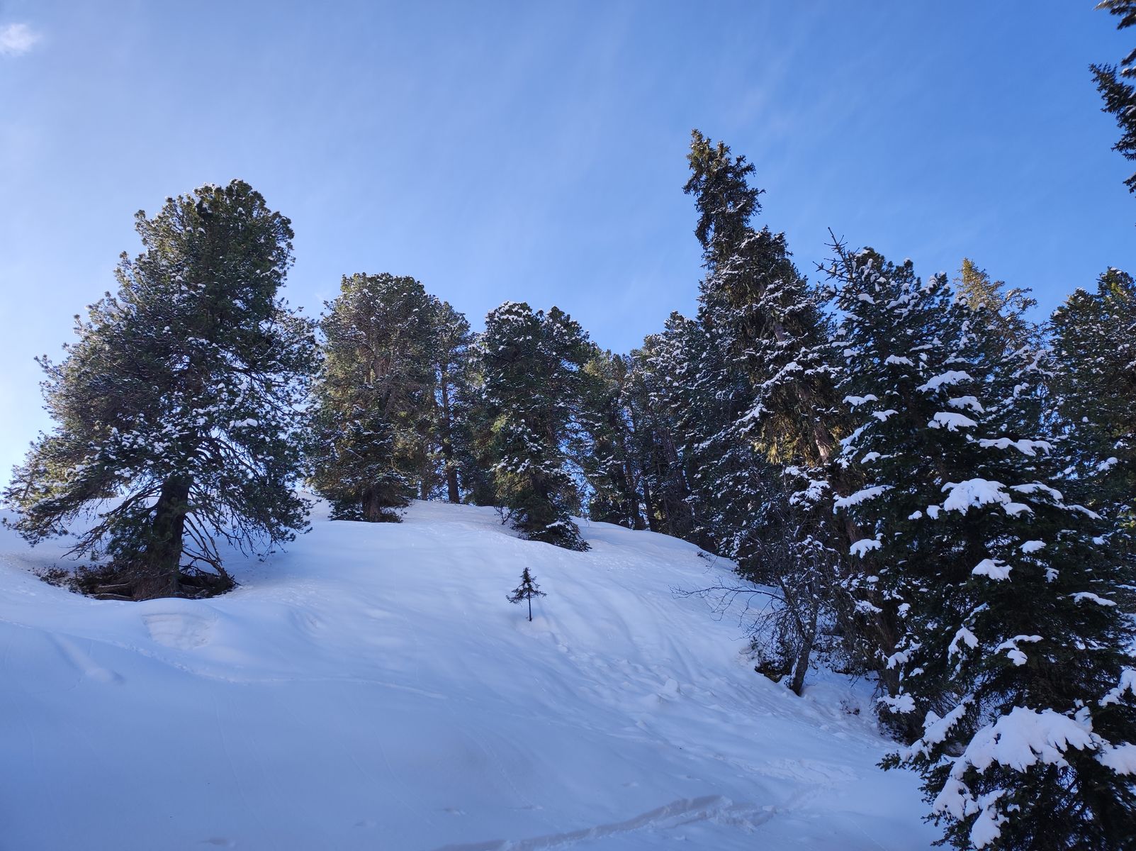 Da die Latschen sehr gut eingeschneit sind, bieten sich in den unteren Hängen wahnsinnig viele Variationsmöglichkeiten. Die 2. Abfahrt habe ich so gewählt, dass ich unmittelbar in der Grube unter dem Steinernen Törl rauskomme. Da bin ich dann hoch und links des Törls auf eine alte Aufstiegsspur zum Streichkopf gestoßen, der ich gefolgt bin. Toll auf einem sicheren Rücken angelegt! Die folgende Abfahrt war die beste des Tages und führte mich durch die herrliche Riesenmulde bis kurz oberhalb der Dalfazer Alm.