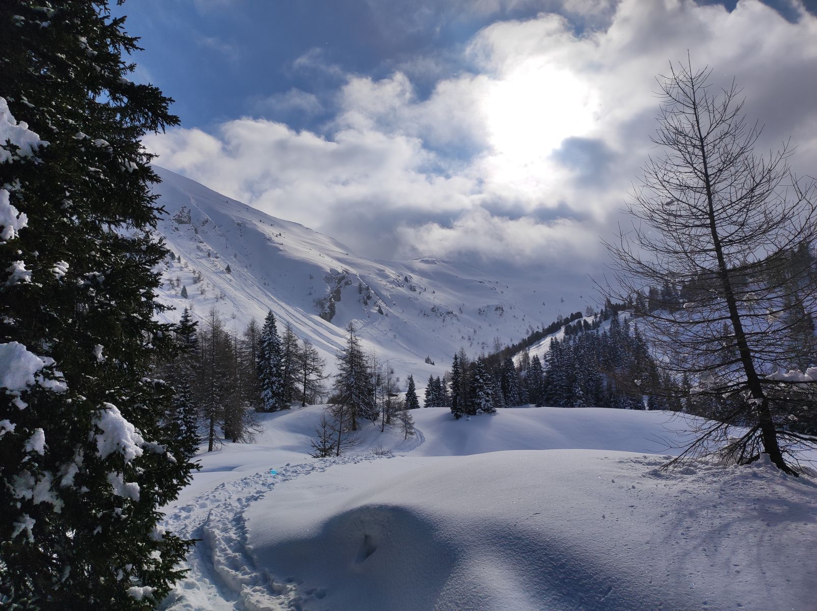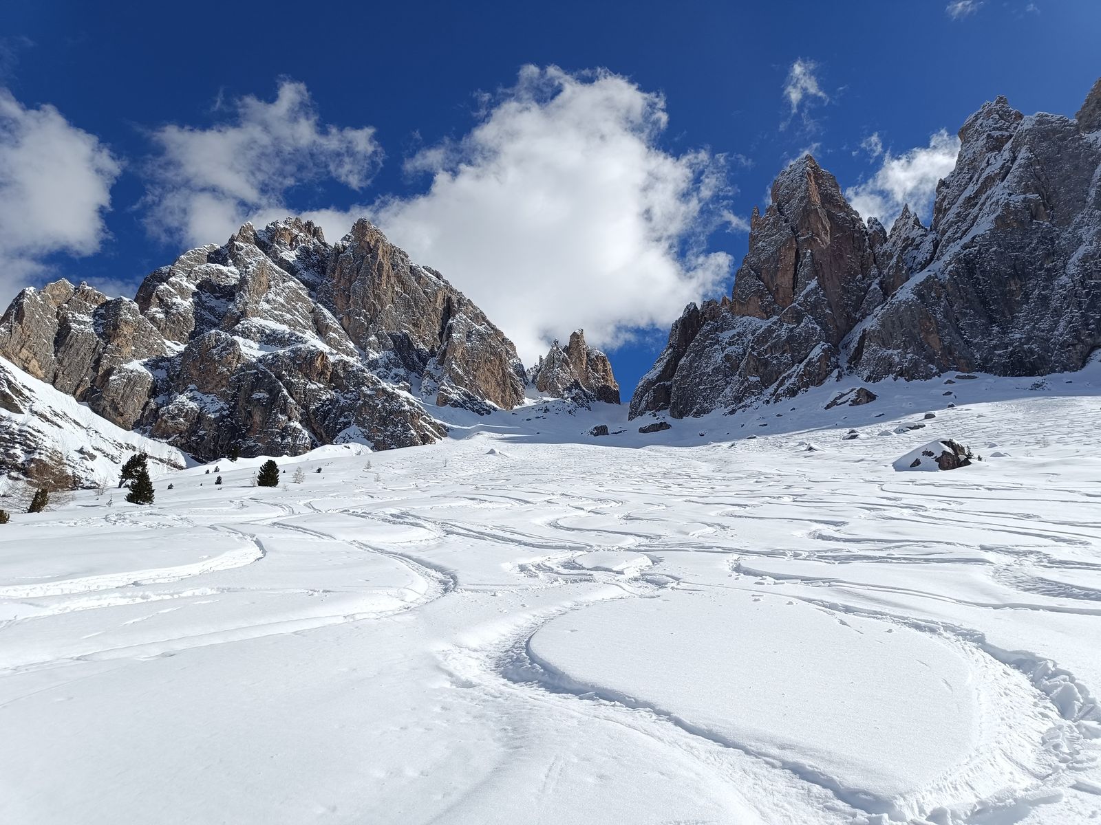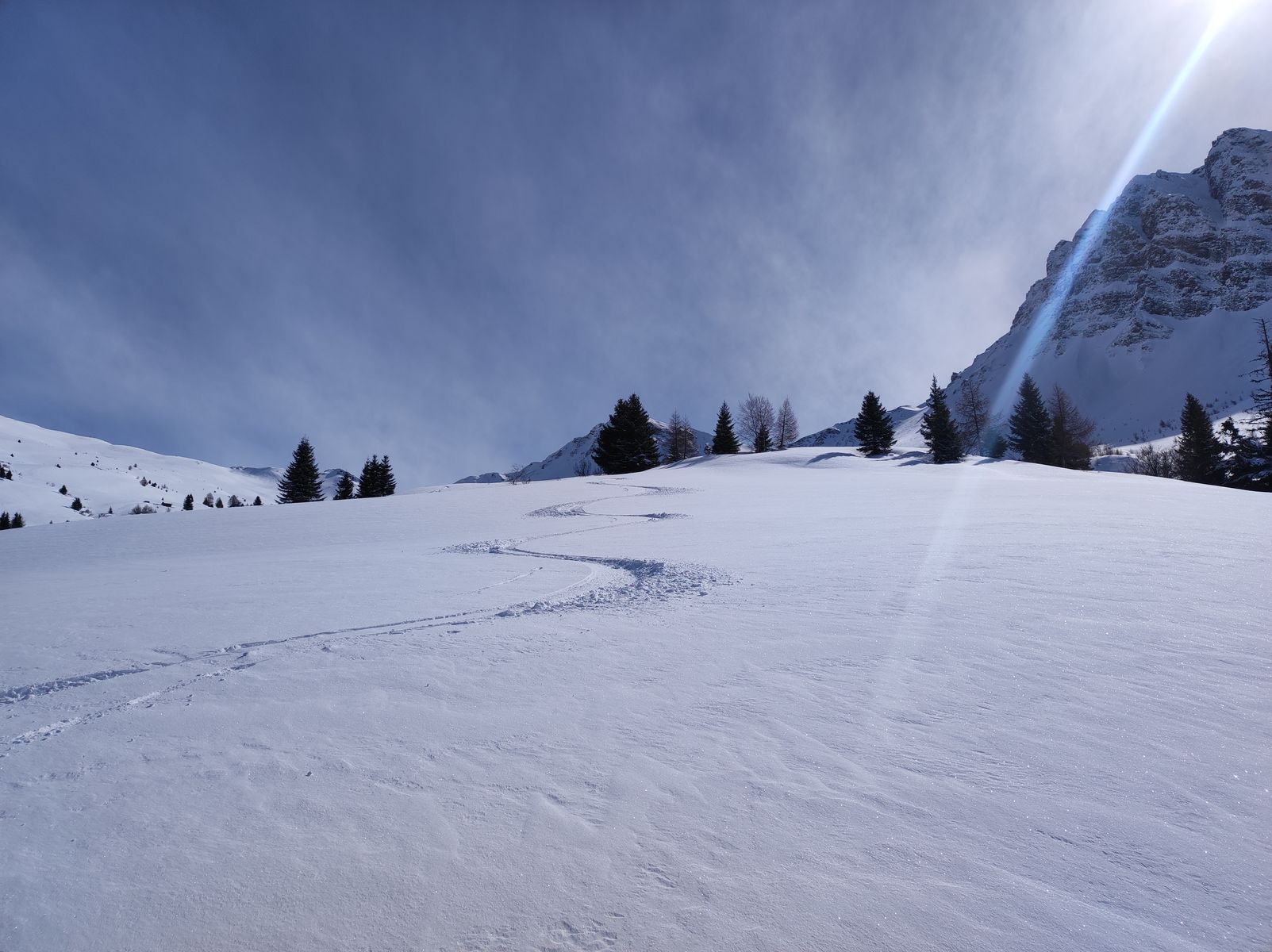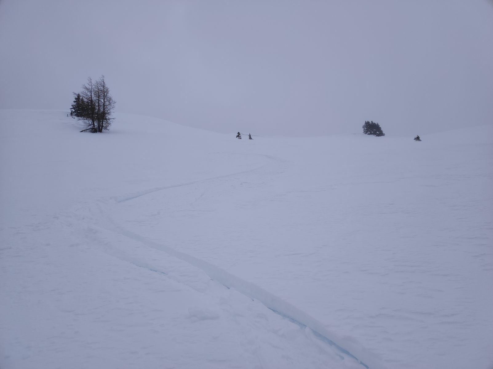 Da die Latschen sehr gut eingeschneit sind, bieten sich in den unteren Hängen wahnsinnig viele Variationsmöglichkeiten. Die 2. Abfahrt habe ich so gewählt, dass ich unmittelbar in der Grube unter dem Steinernen Törl rauskomme. Da bin ich dann hoch und links des Törls auf eine alte Aufstiegsspur zum Streichkopf gestoßen, der ich gefolgt bin. Toll auf einem sicheren Rücken angelegt! Die folgende Abfahrt war die beste des Tages und führte mich durch die herrliche Riesenmulde bis kurz oberhalb der Dalfazer Alm.