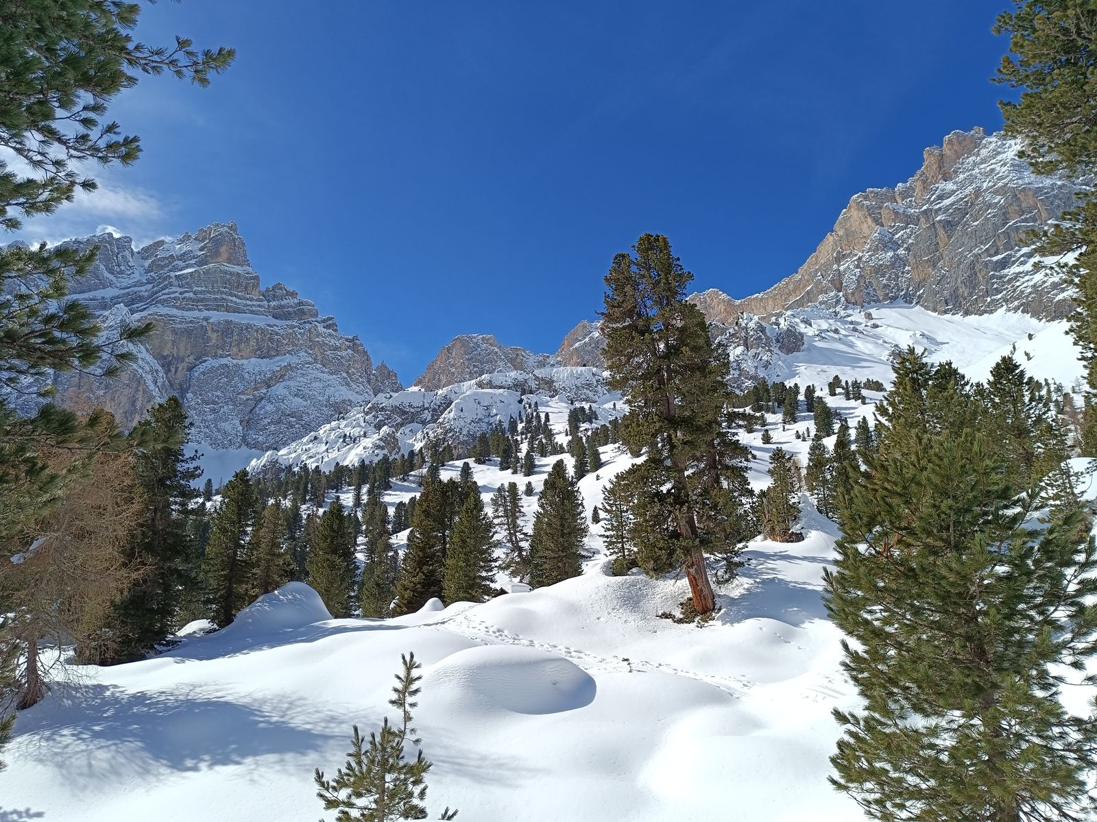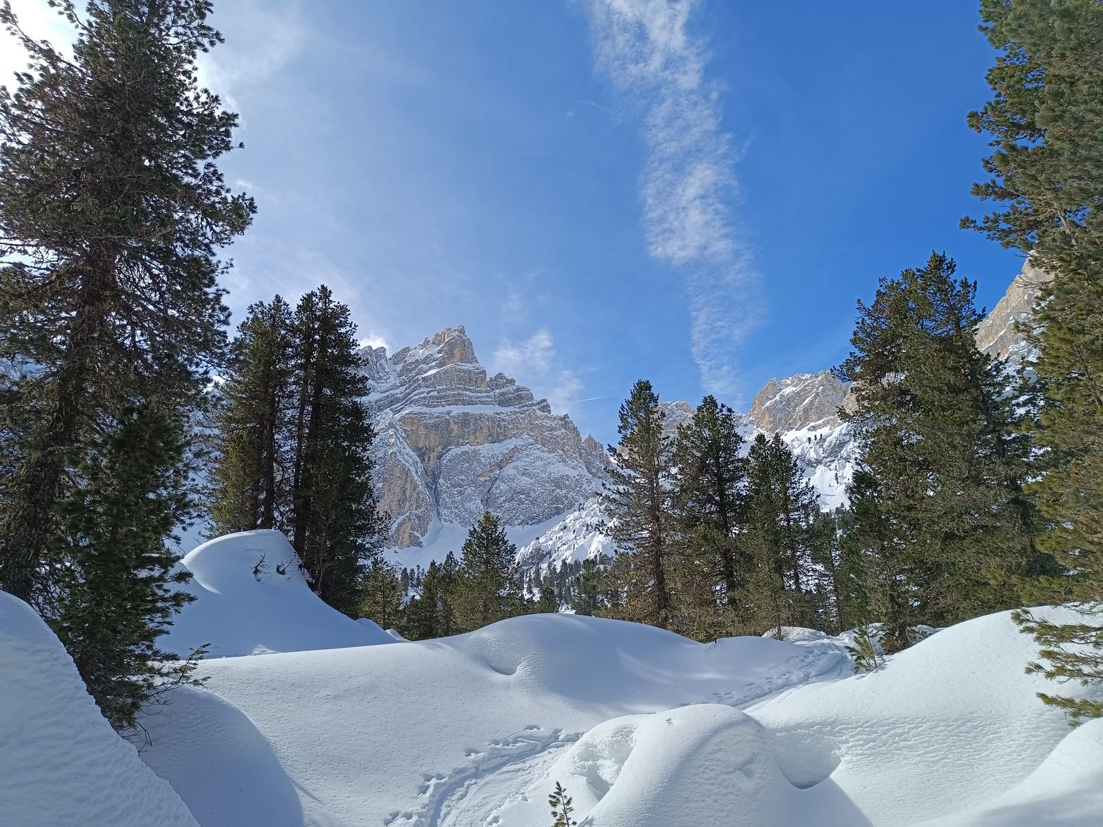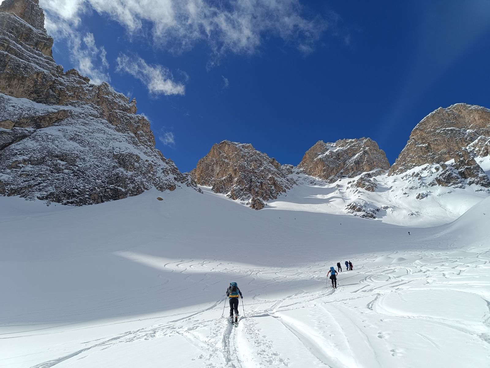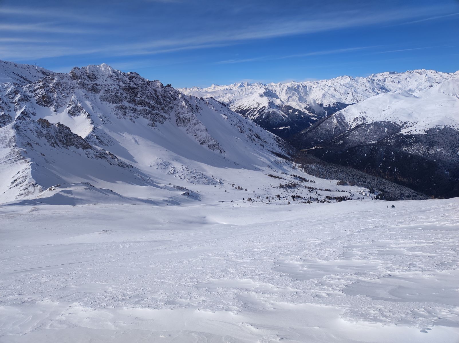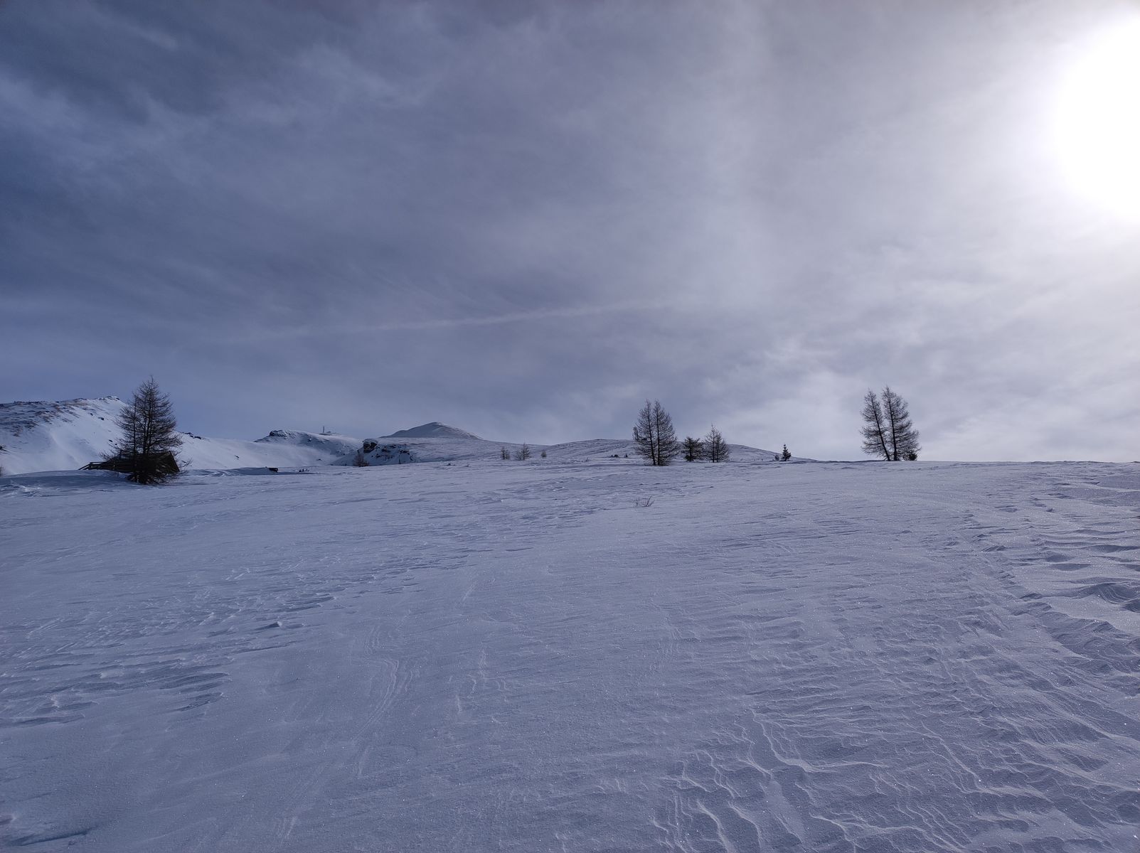 Da die Latschen sehr gut eingeschneit sind, bieten sich in den unteren Hängen wahnsinnig viele Variationsmöglichkeiten. Die 2. Abfahrt habe ich so gewählt, dass ich unmittelbar in der Grube unter dem Steinernen Törl rauskomme. Da bin ich dann hoch und links des Törls auf eine alte Aufstiegsspur zum Streichkopf gestoßen, der ich gefolgt bin. Toll auf einem sicheren Rücken angelegt! Die folgende Abfahrt war die beste des Tages und führte mich durch die herrliche Riesenmulde bis kurz oberhalb der Dalfazer Alm.