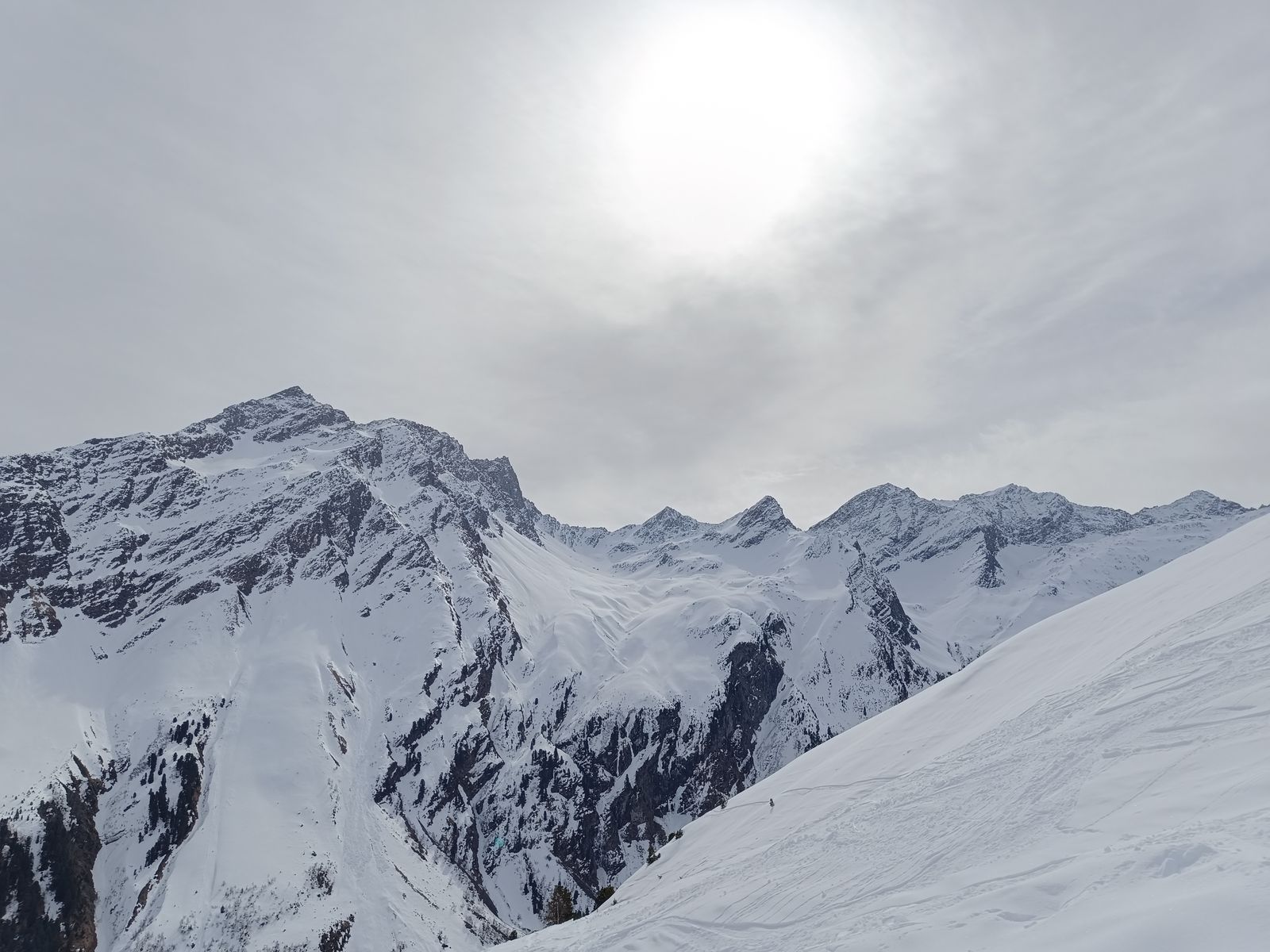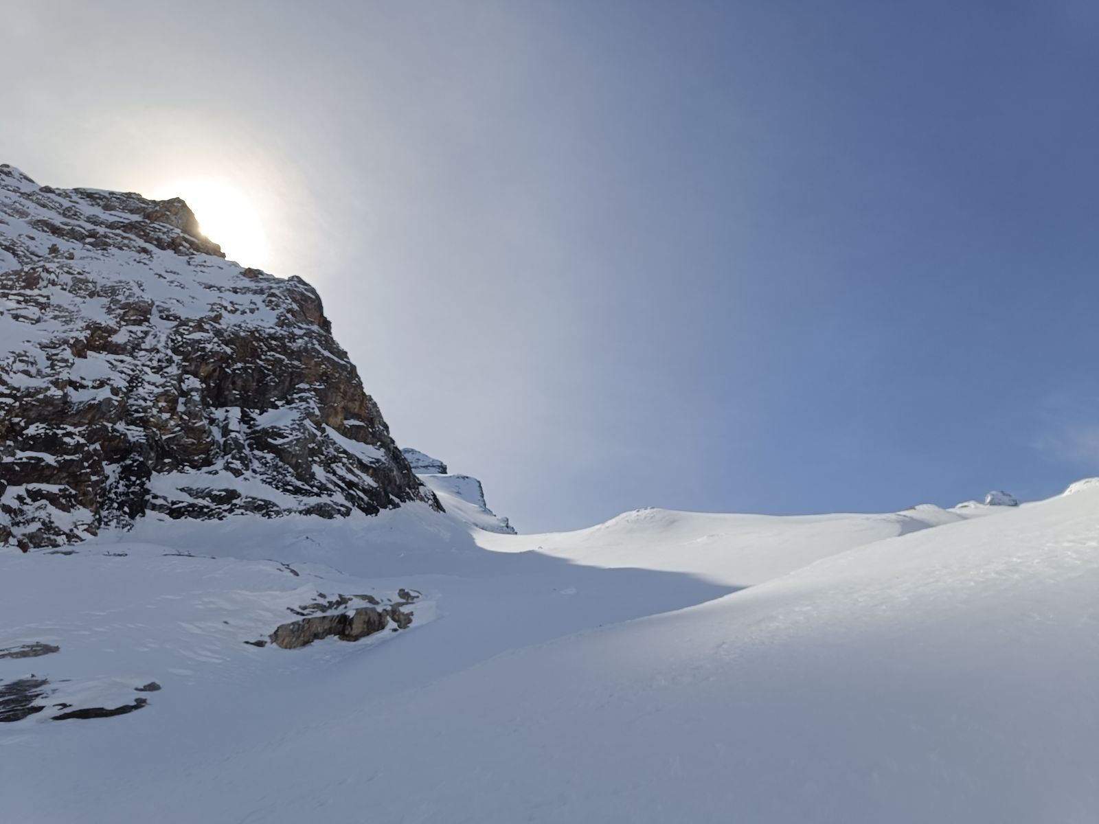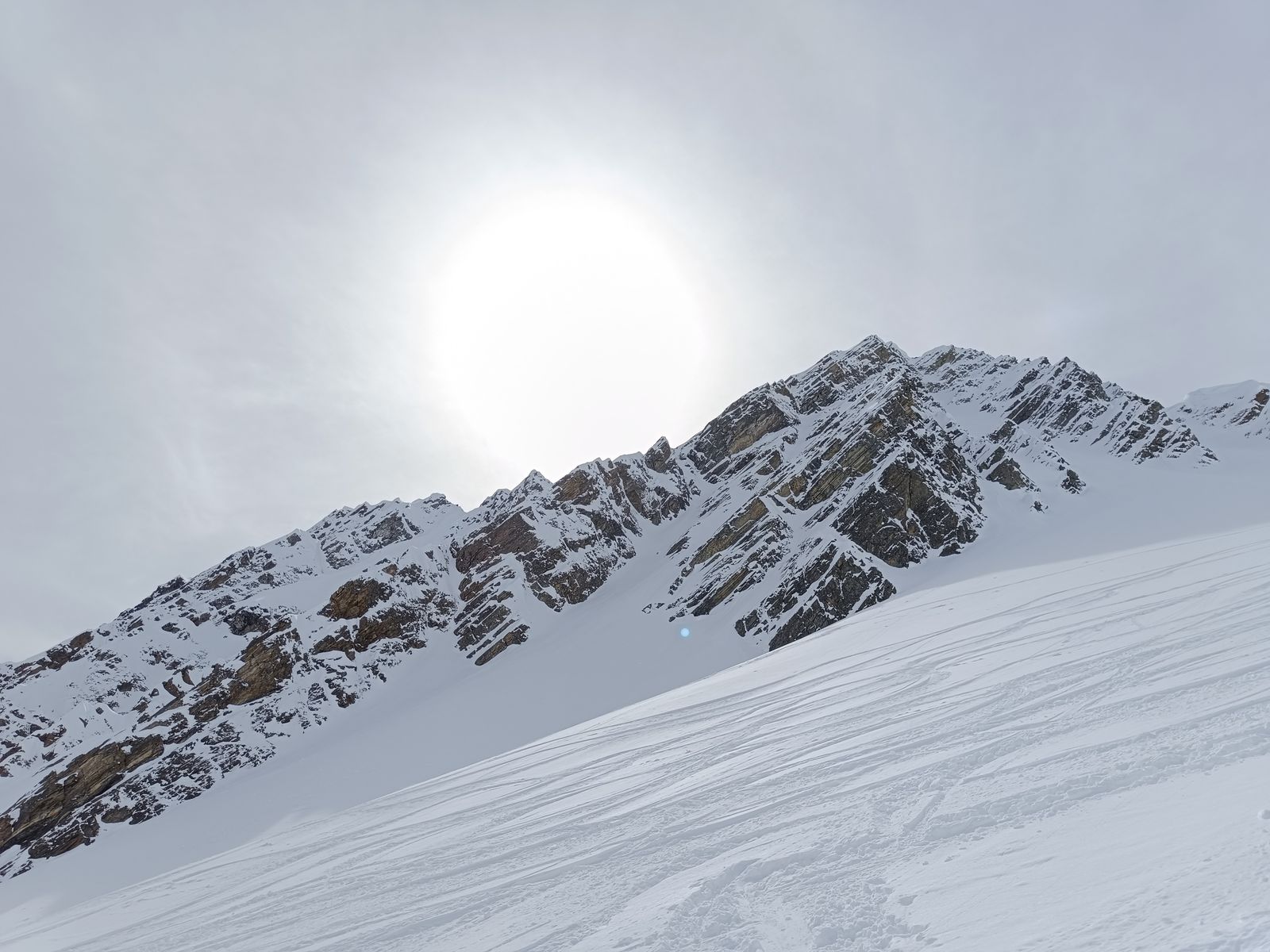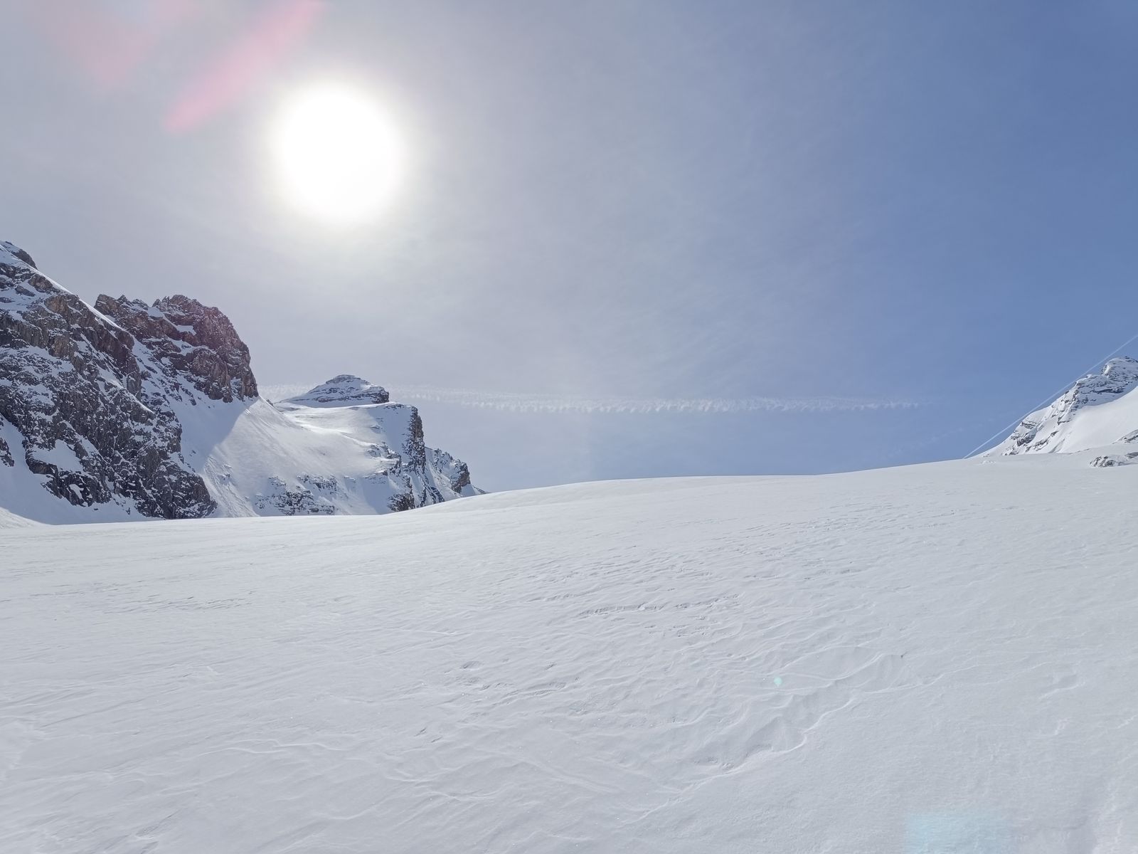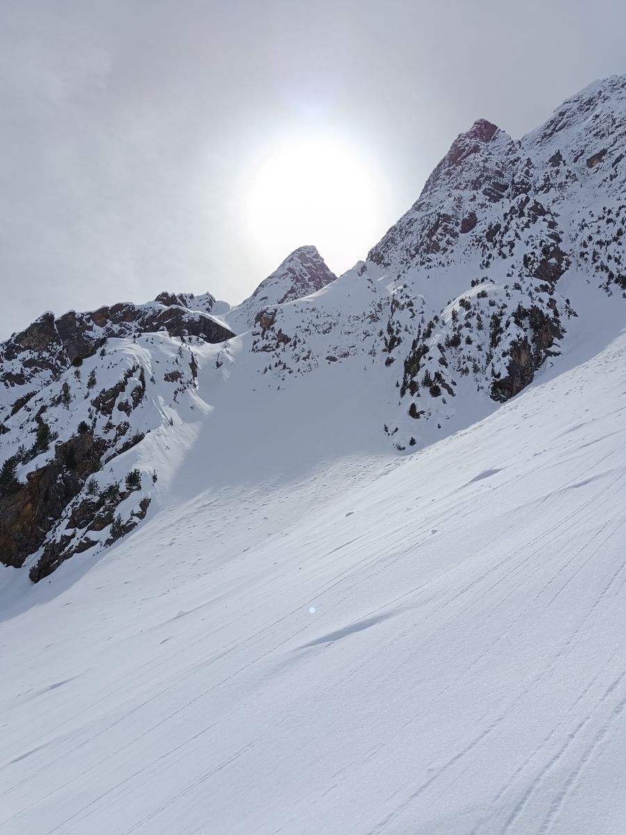 Lawinengefahr: null. Man möge sich da nicht von dem kleinen Lockerschneerutsch auf einem der Bilder irritieren lassen. Allerdings sind manche Hänge auch 35 Grad + steil, sodass bei schlechtem Timing die Gefahr besteht, Nassschneerutsche auszulösen.
