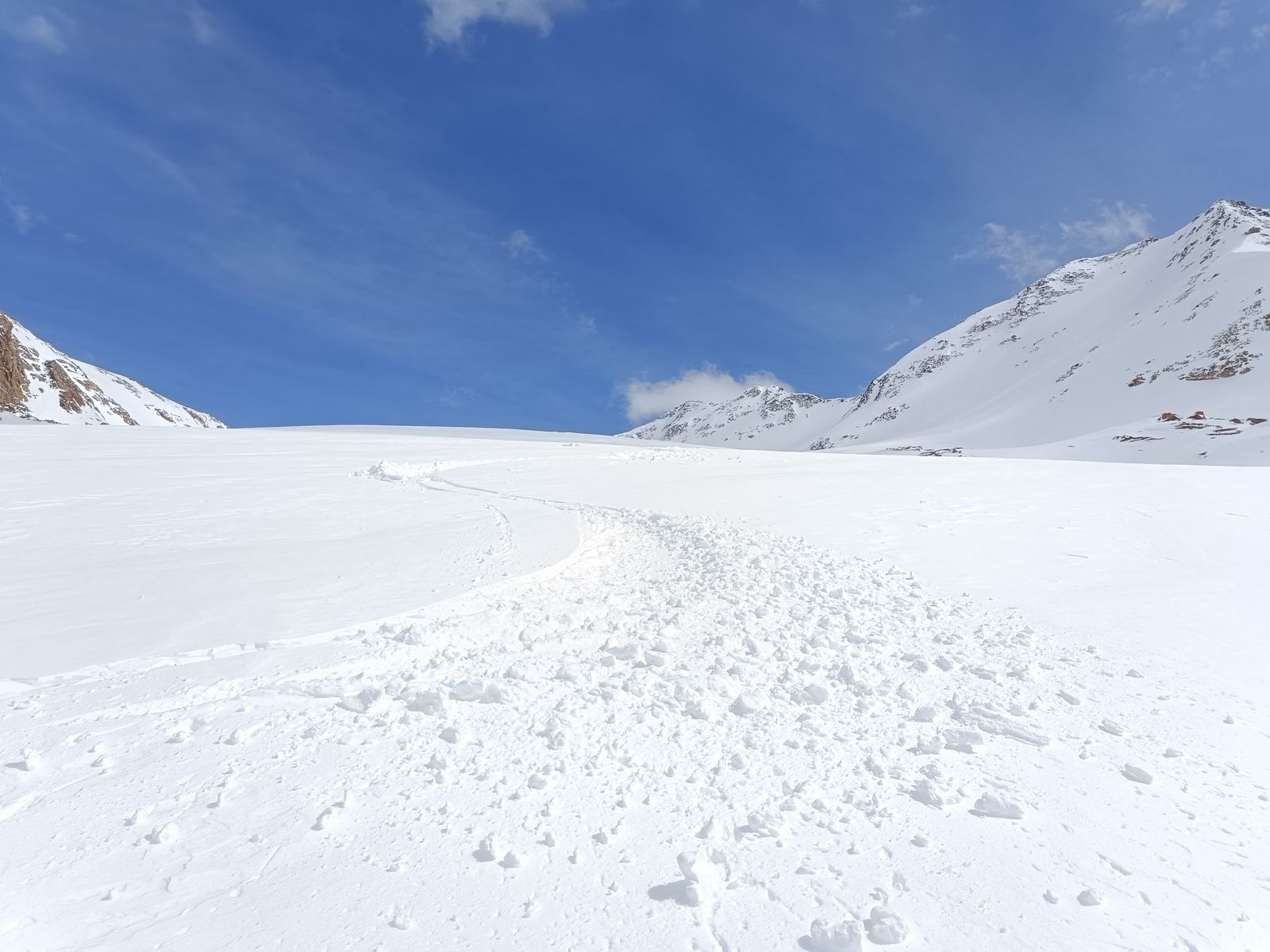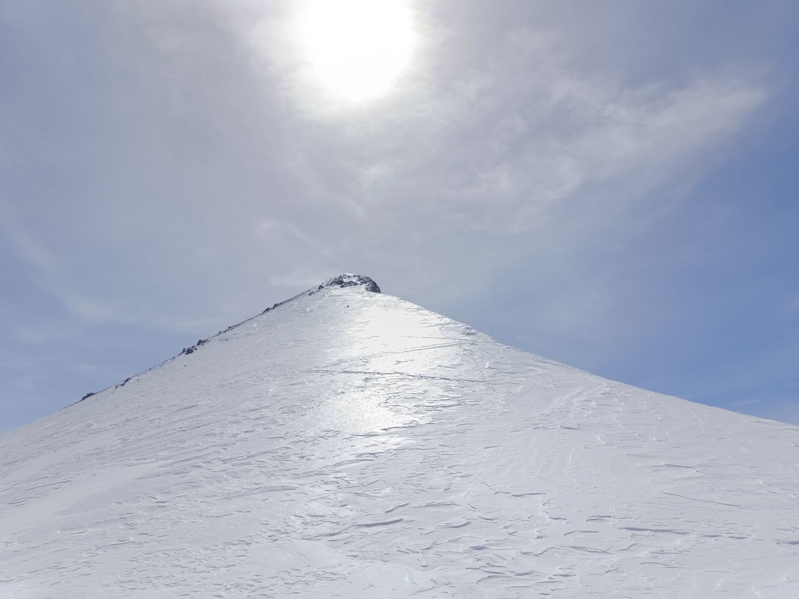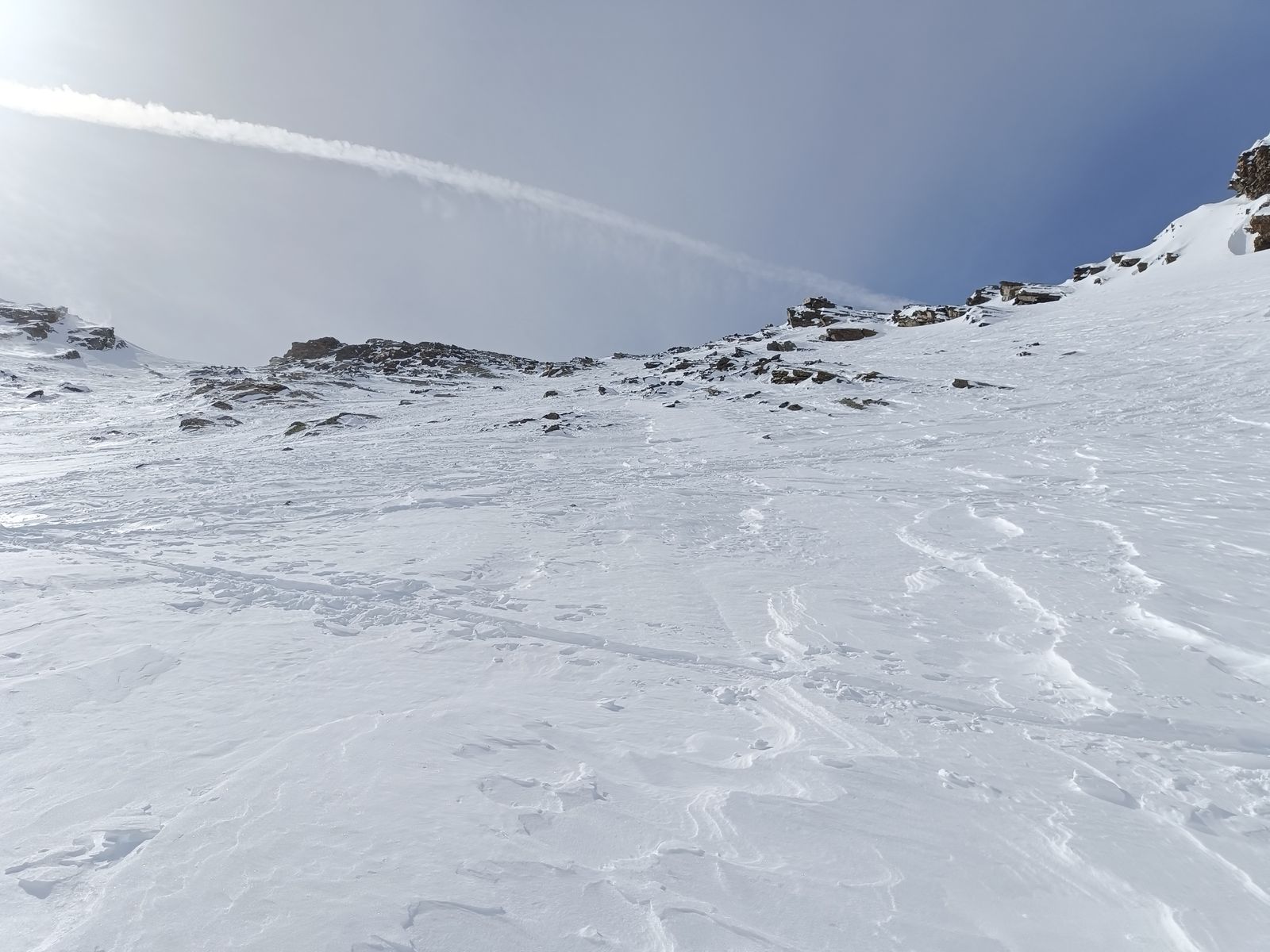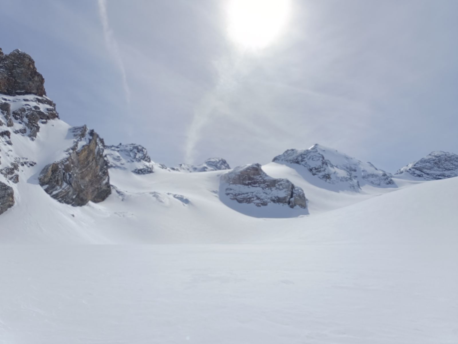 Lawinengefahr: null. Man möge sich da nicht von dem kleinen Lockerschneerutsch auf einem der Bilder irritieren lassen. Allerdings sind manche Hänge auch 35 Grad + steil, sodass bei schlechtem Timing die Gefahr besteht, Nassschneerutsche auszulösen.