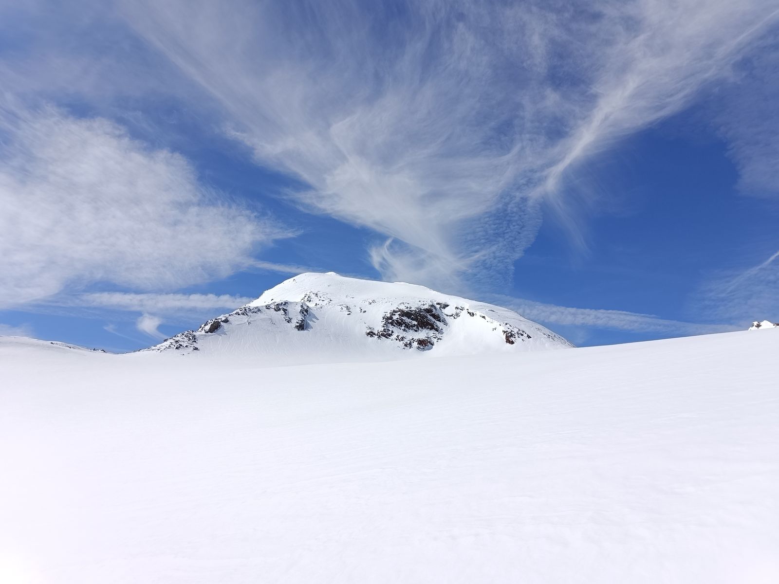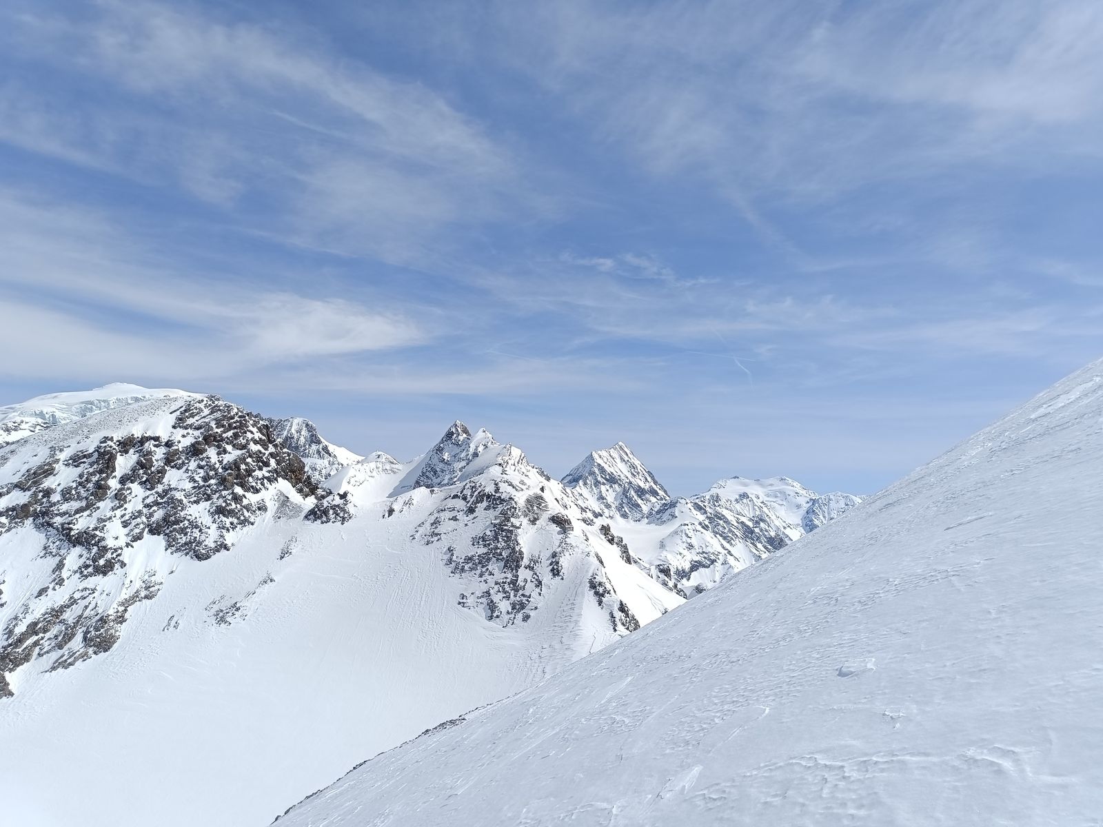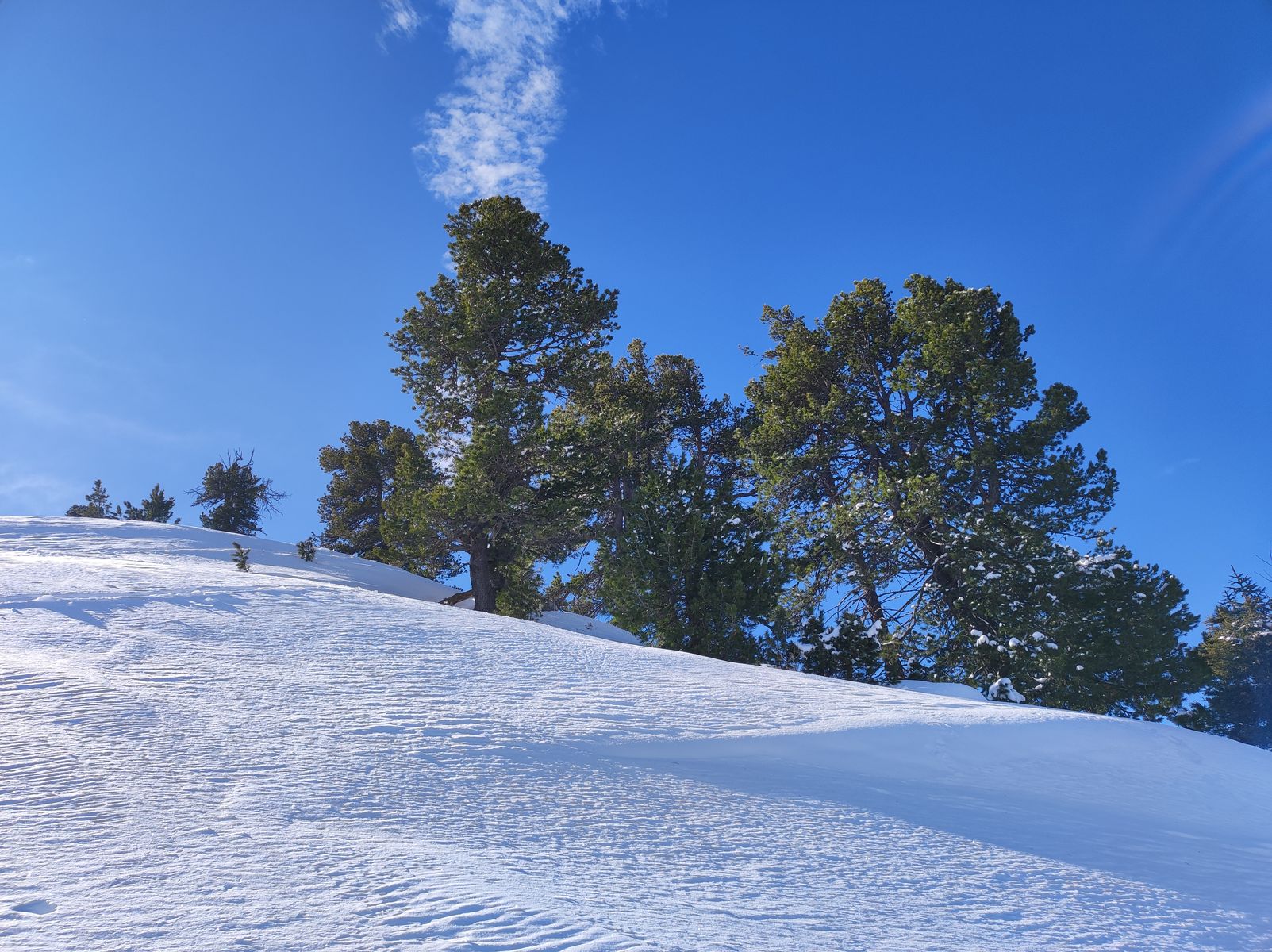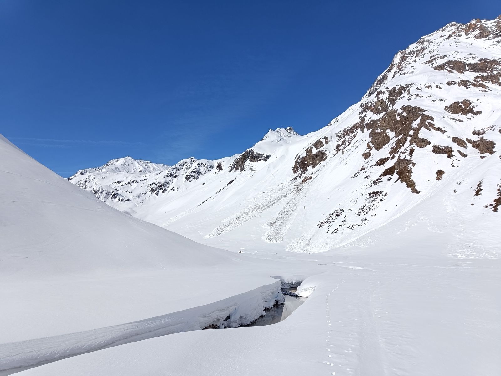 Lawinengefahr: null. Man möge sich da nicht von dem kleinen Lockerschneerutsch auf einem der Bilder irritieren lassen. Allerdings sind manche Hänge auch 35 Grad + steil, sodass bei schlechtem Timing die Gefahr besteht, Nassschneerutsche auszulösen.