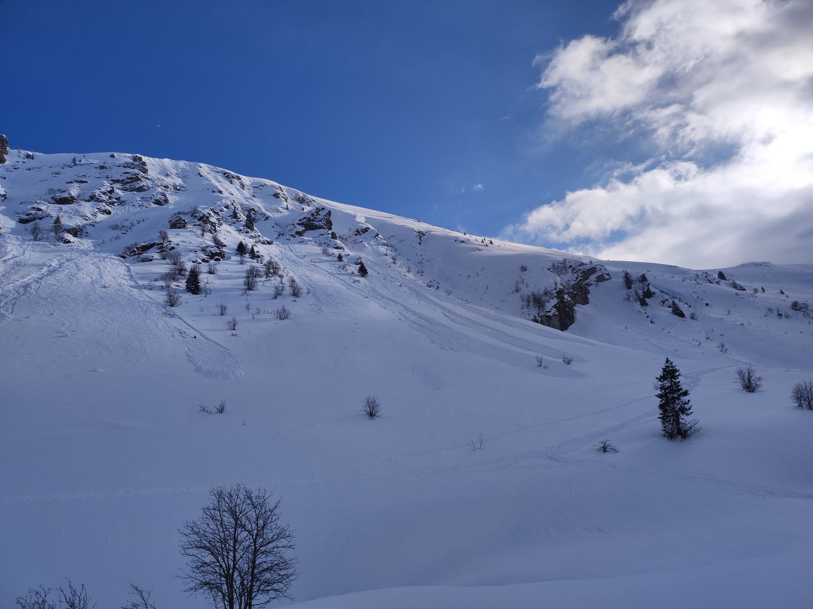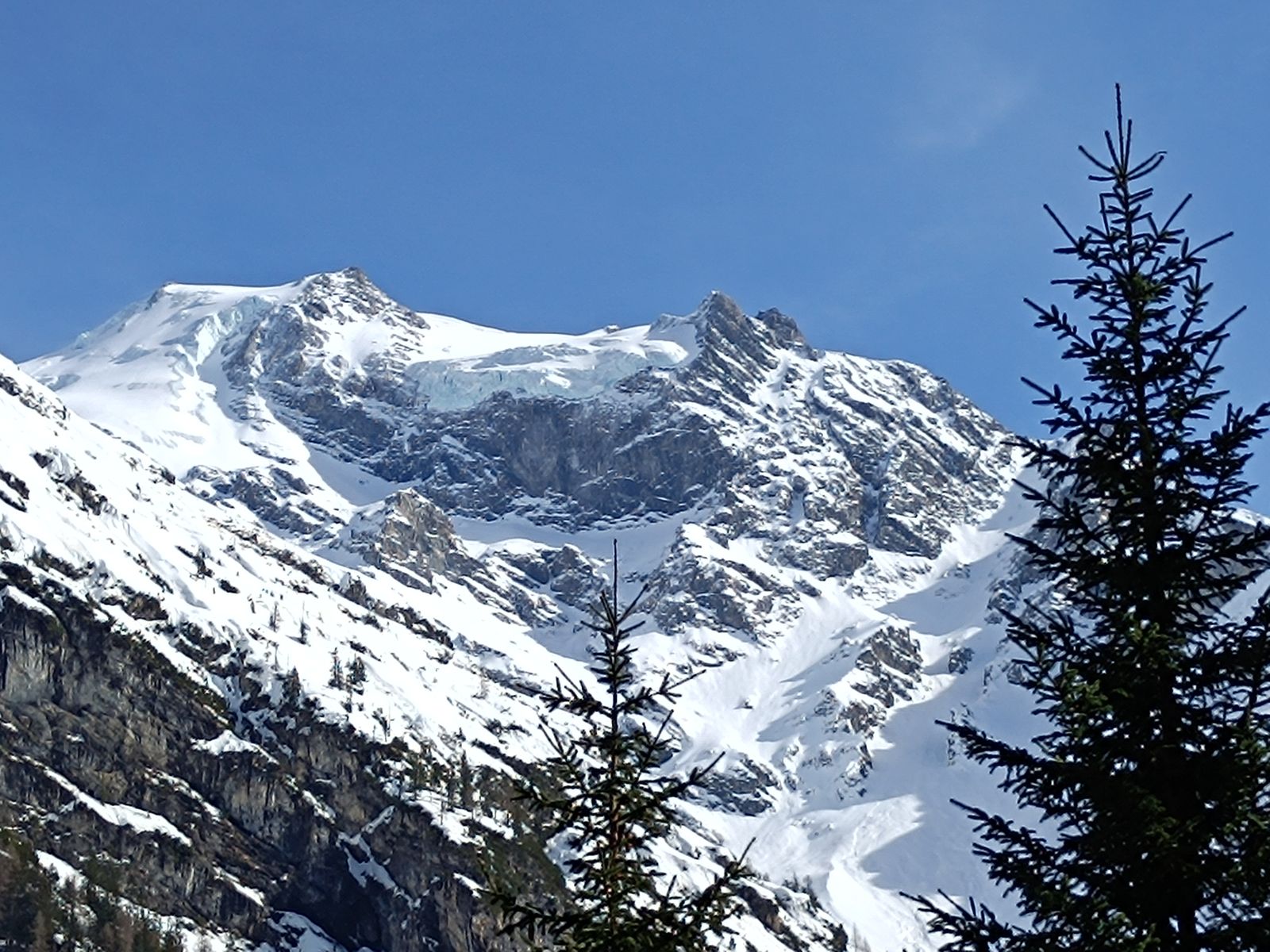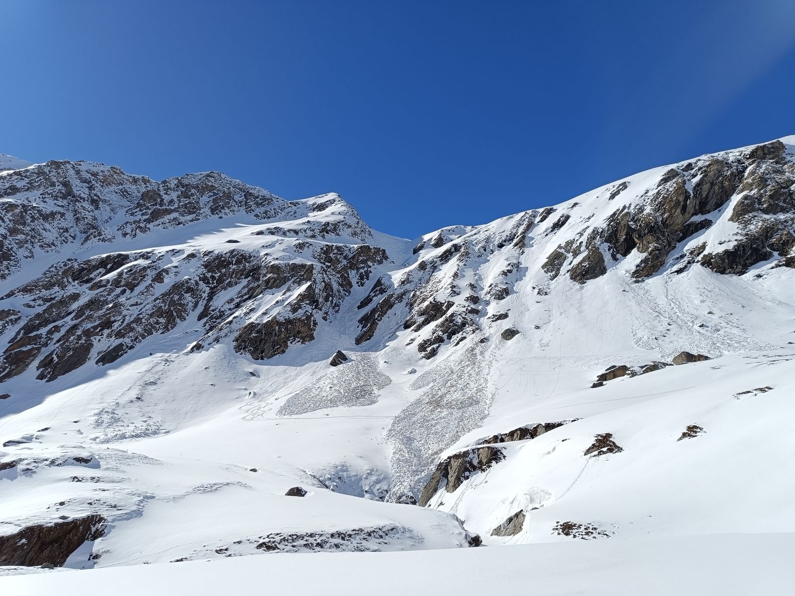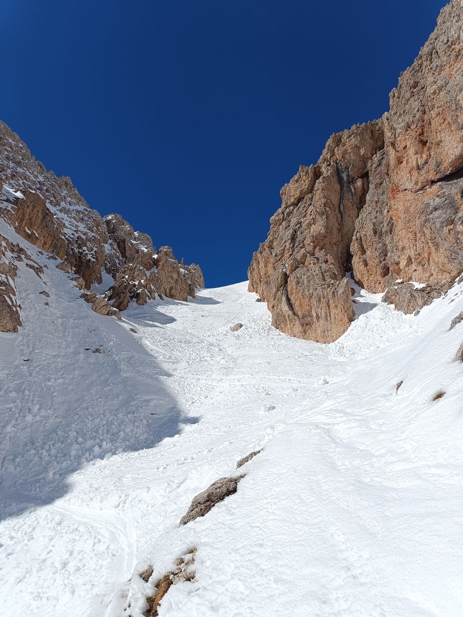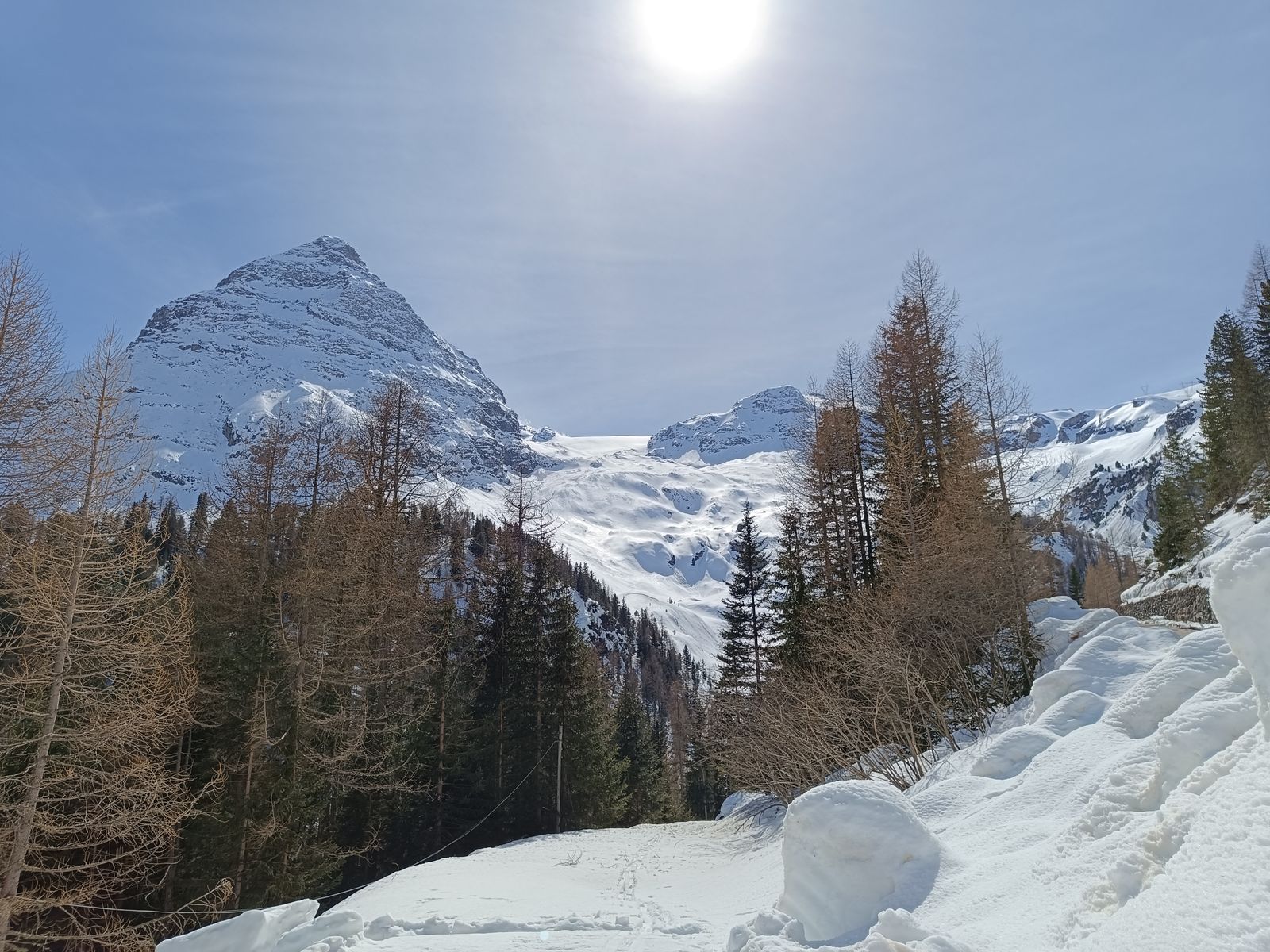 Lawinengefahr: null. Man möge sich da nicht von dem kleinen Lockerschneerutsch auf einem der Bilder irritieren lassen. Allerdings sind manche Hänge auch 35 Grad + steil, sodass bei schlechtem Timing die Gefahr besteht, Nassschneerutsche auszulösen.