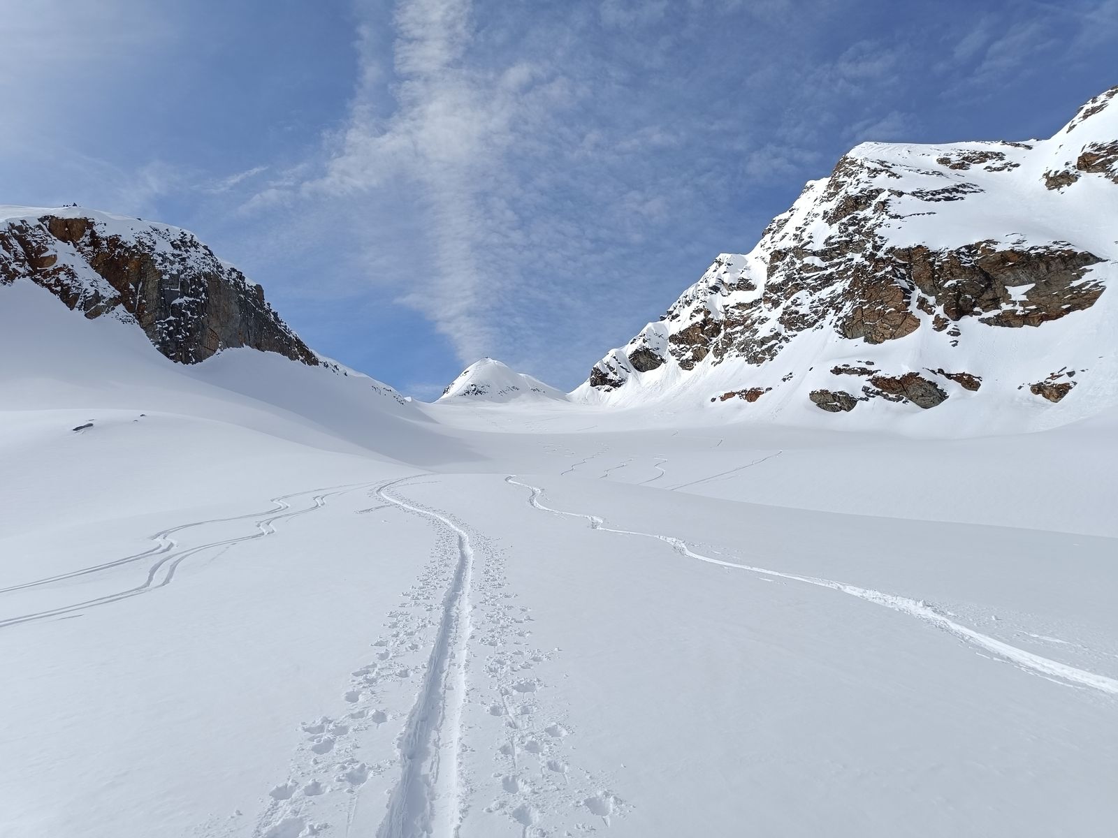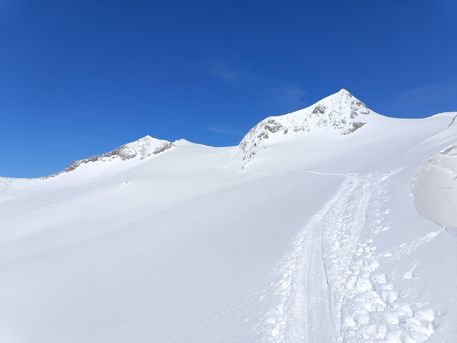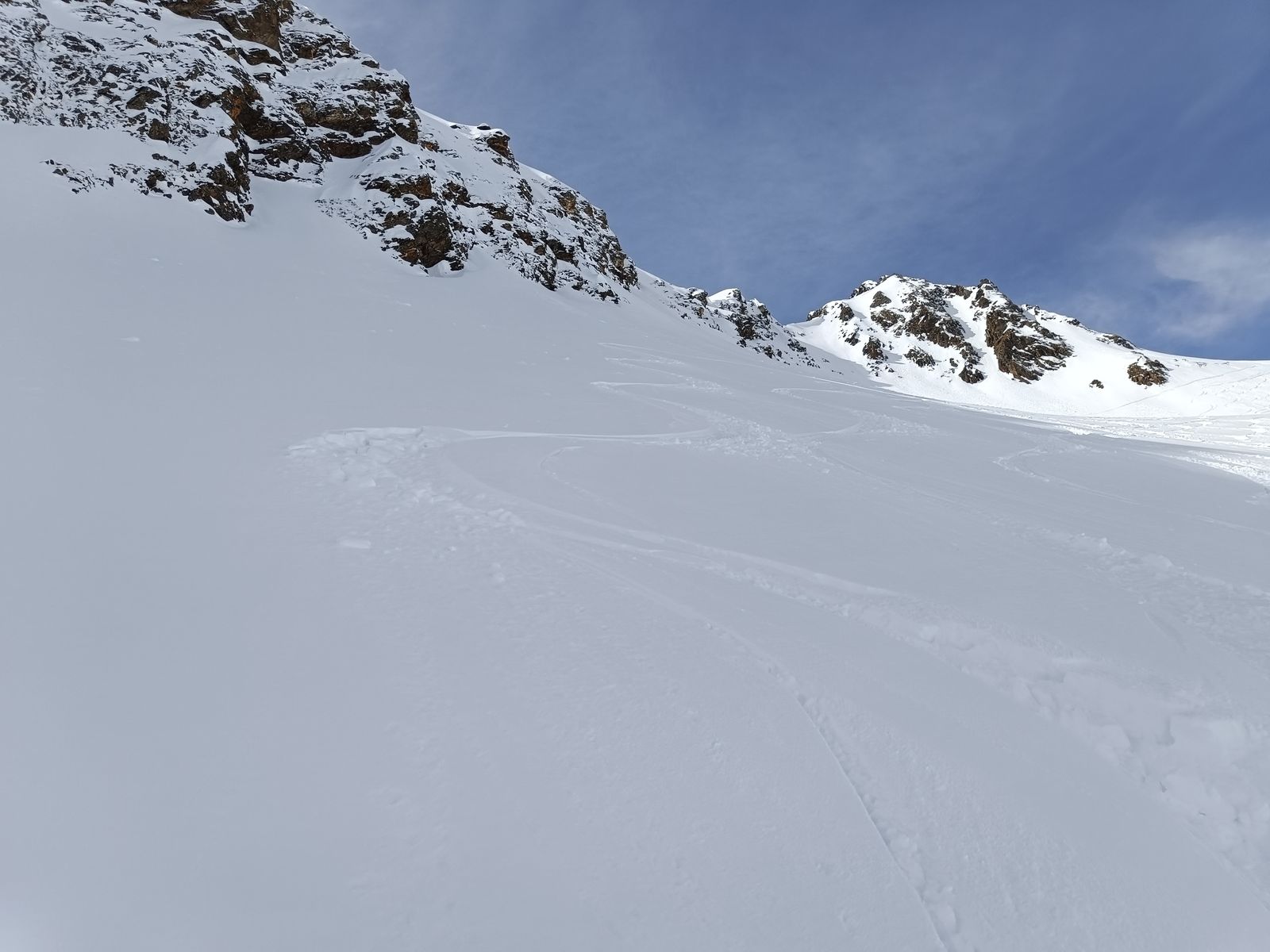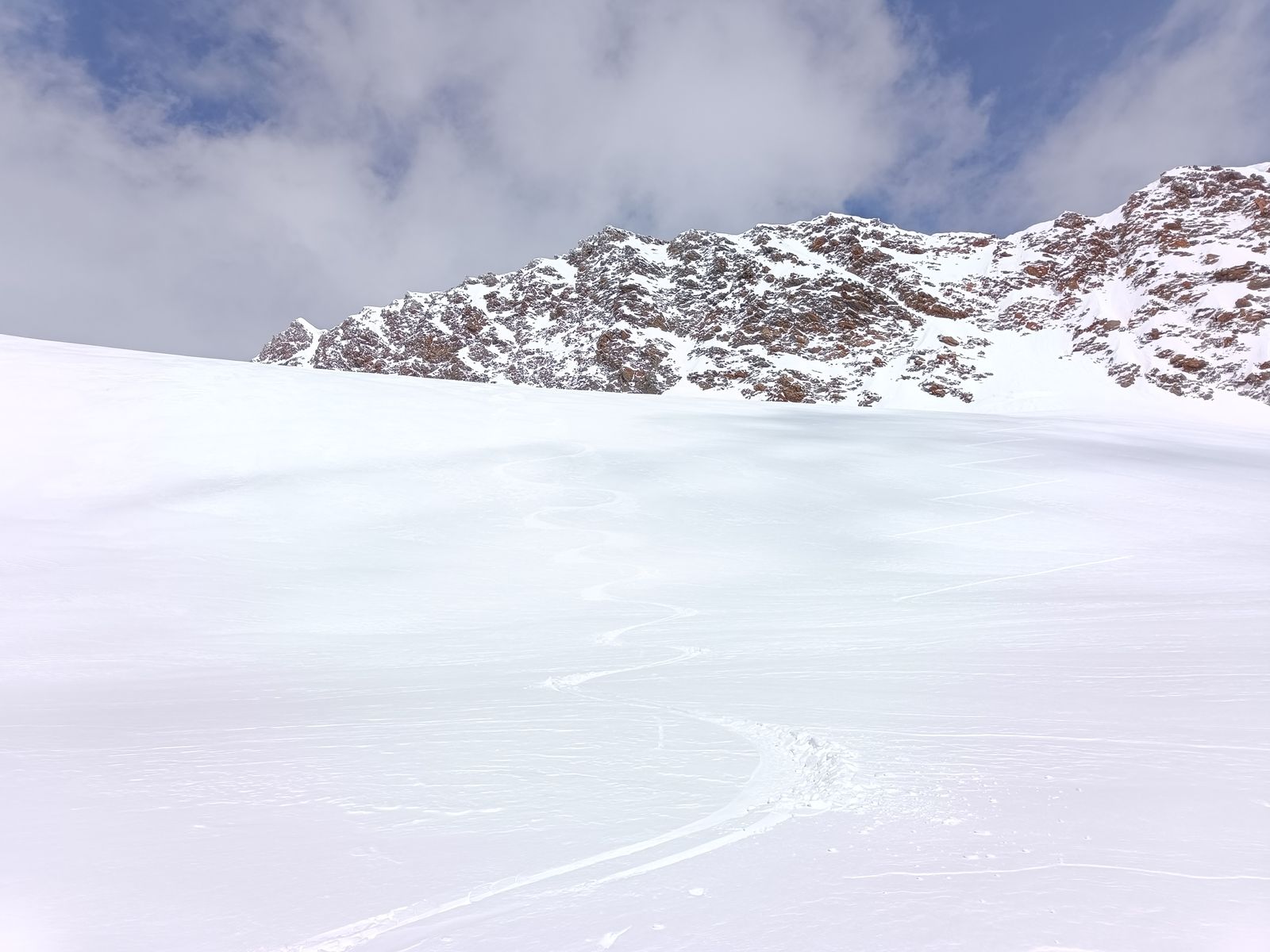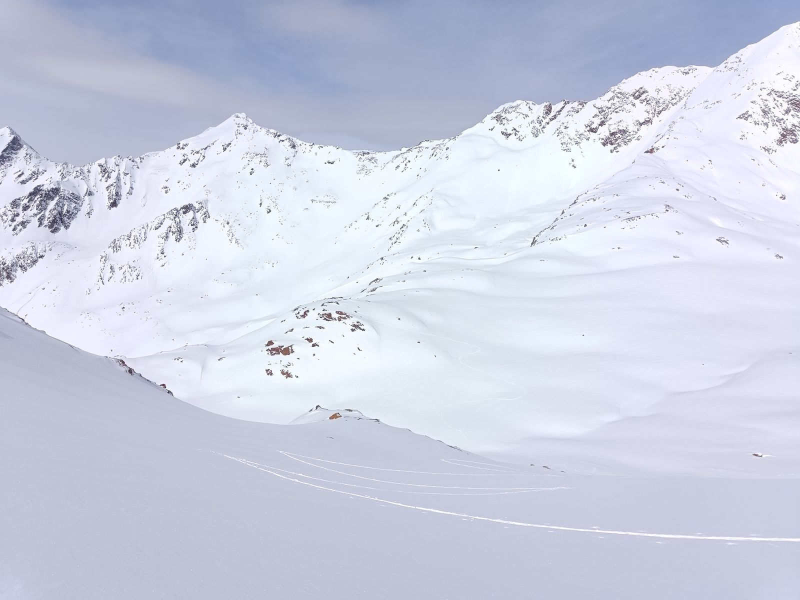 Zurück am Törl beschloss ich nach kurzer Zwischenabfahrt in die Grube (geht nicht mit Fellen), nochmals zum Kotalmjoch aufzusteigen, weil die Hänge erstaunlicherweise auch um 15 Uhr noch nicht "durch" waren - zwar etwas sulziger, aber immer noch feste Unterlage und kein einziger Durchbrecher.