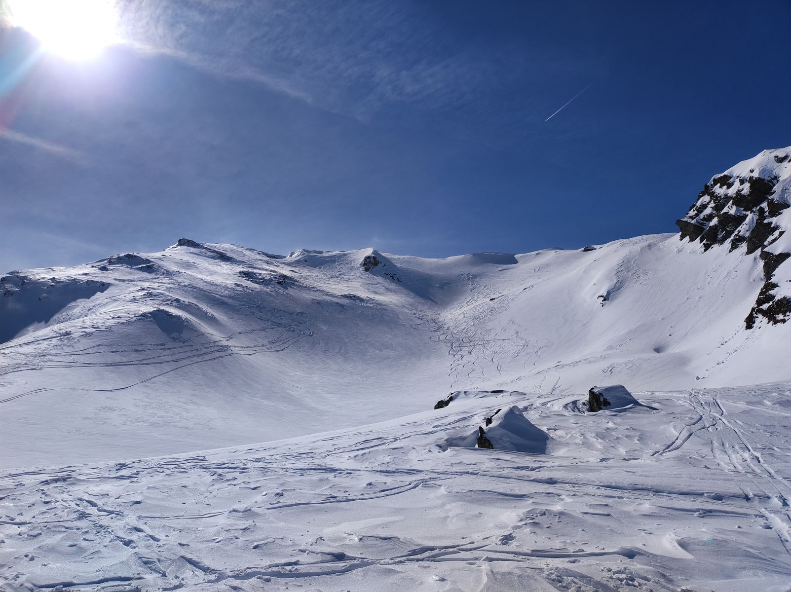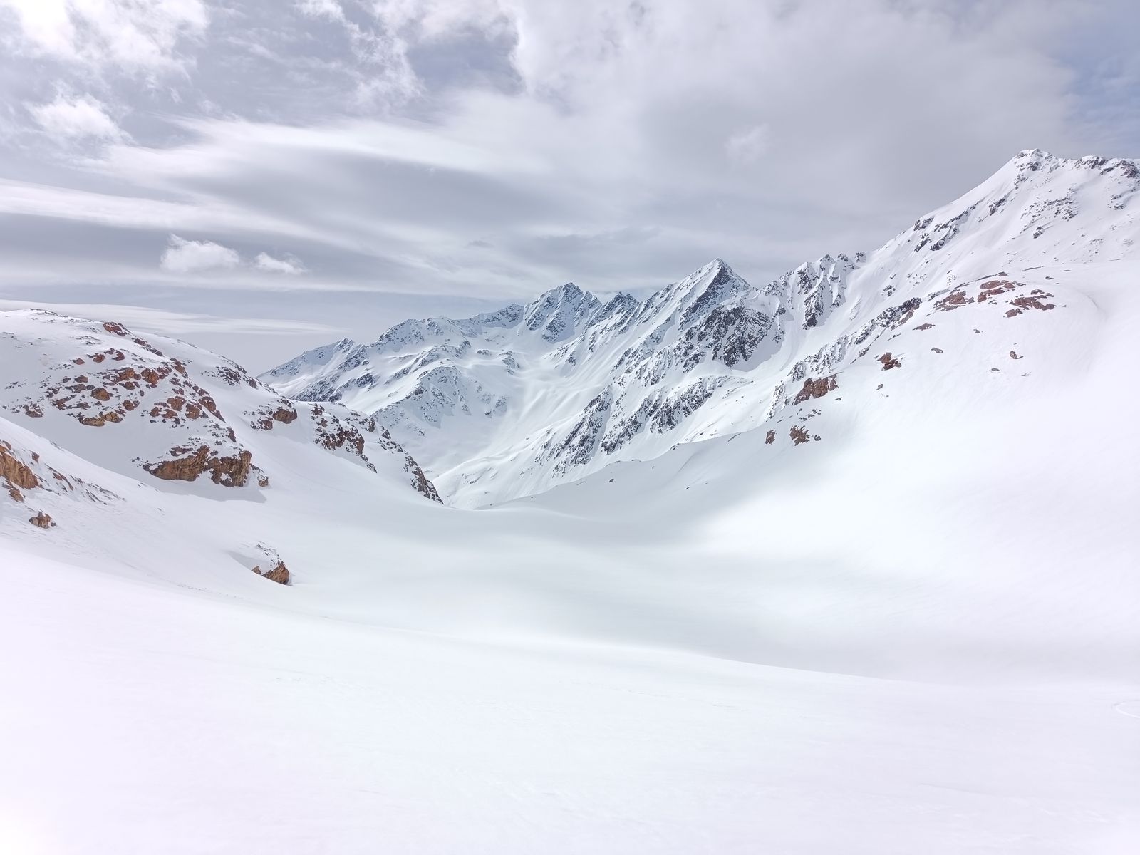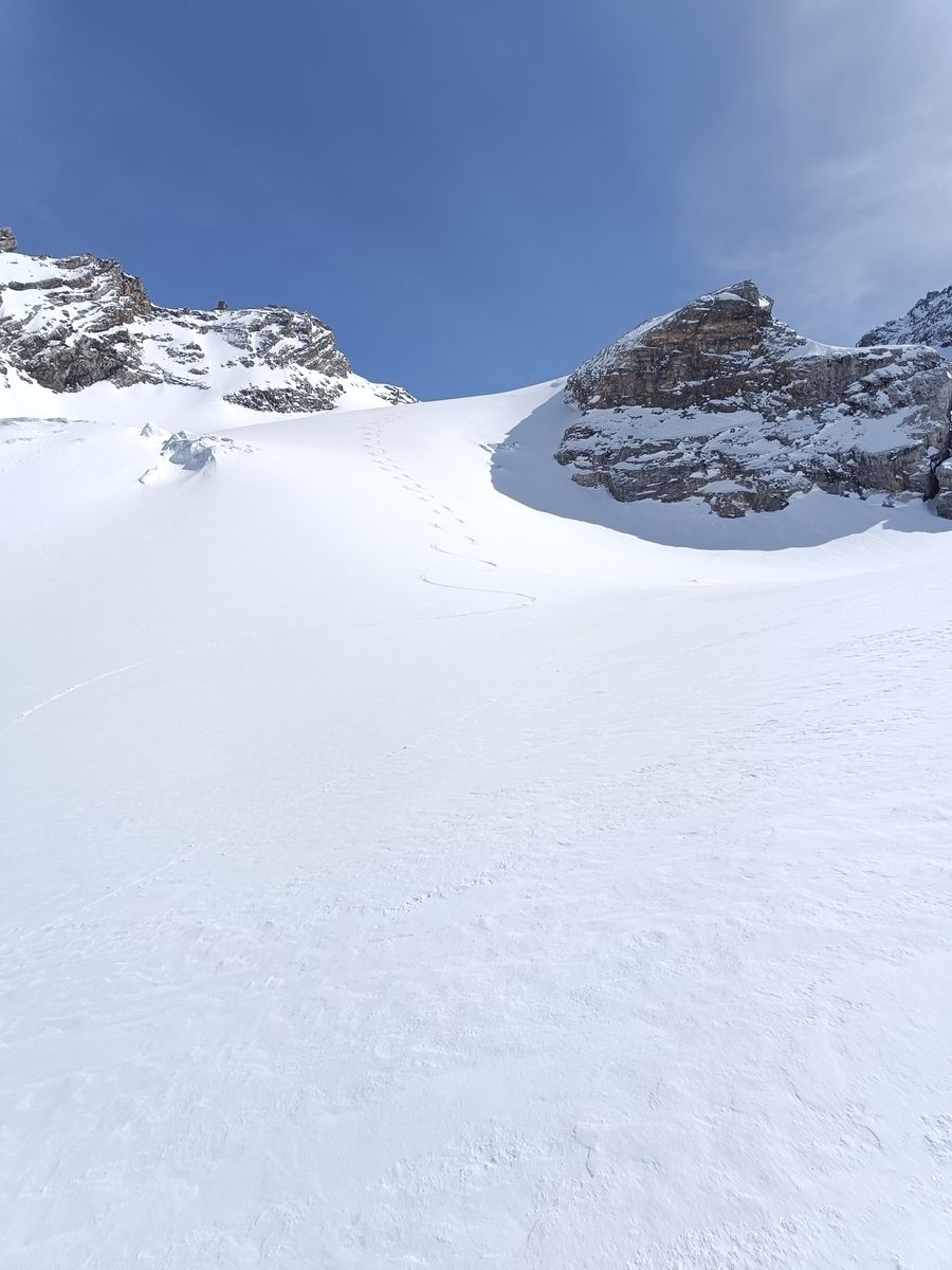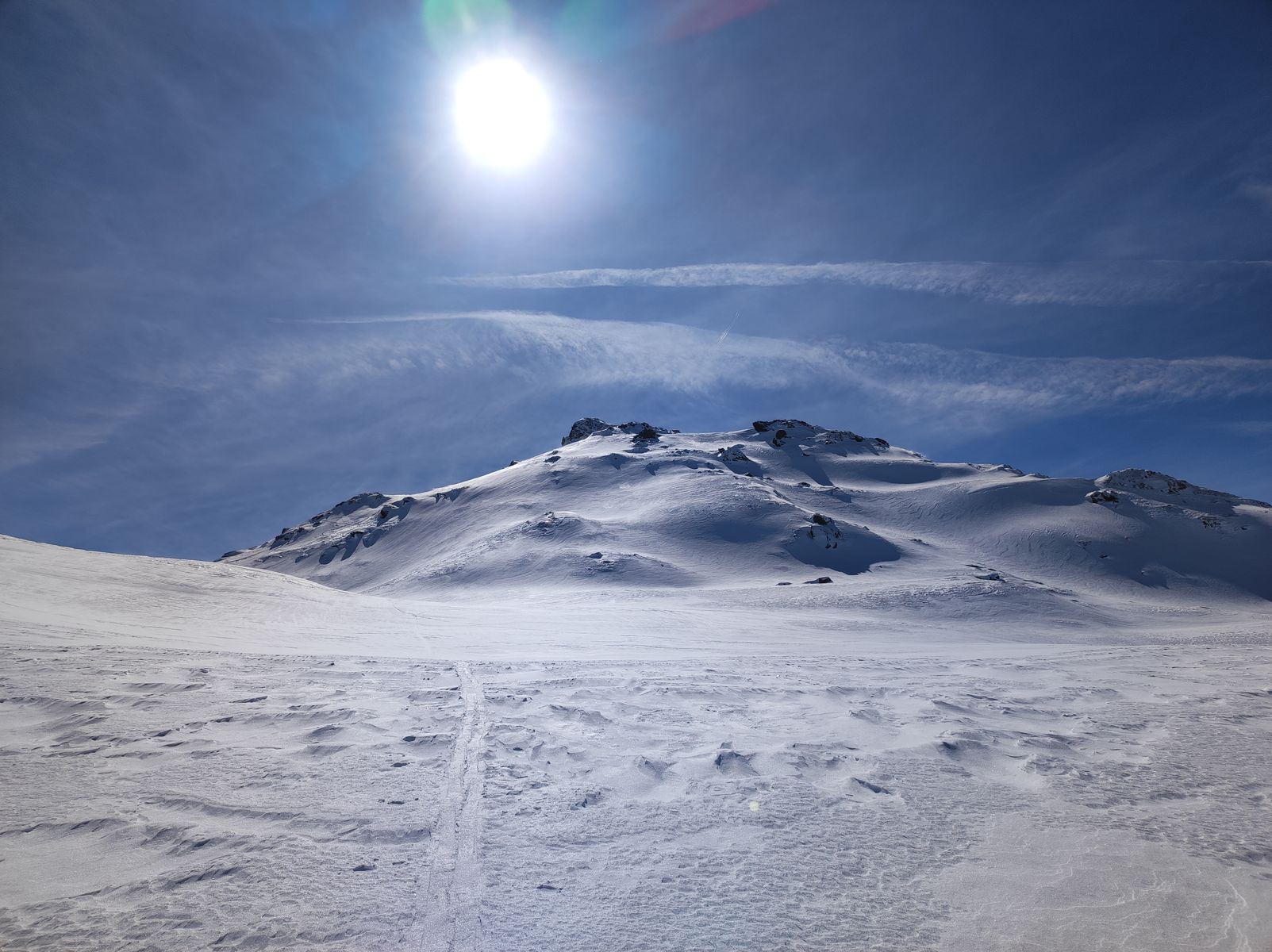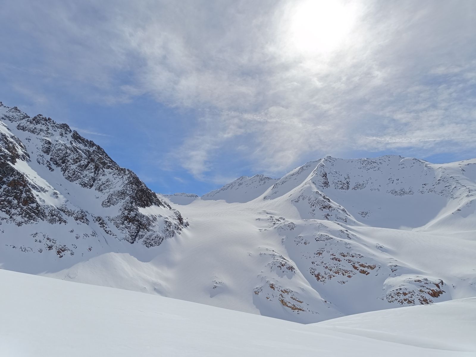 Zurück am Törl beschloss ich nach kurzer Zwischenabfahrt in die Grube (geht nicht mit Fellen), nochmals zum Kotalmjoch aufzusteigen, weil die Hänge erstaunlicherweise auch um 15 Uhr noch nicht "durch" waren - zwar etwas sulziger, aber immer noch feste Unterlage und kein einziger Durchbrecher.