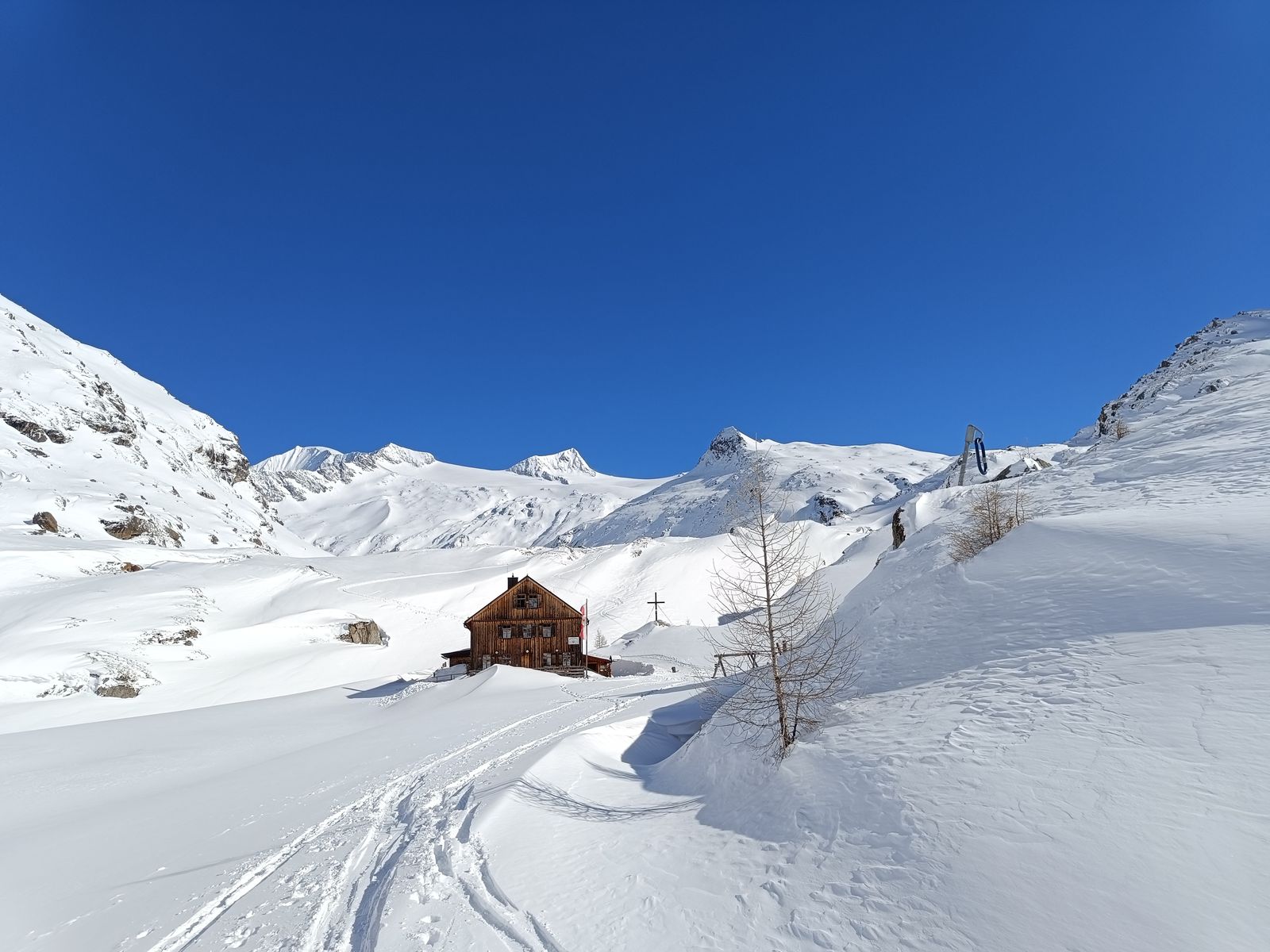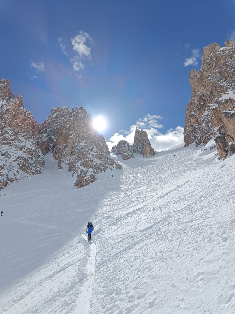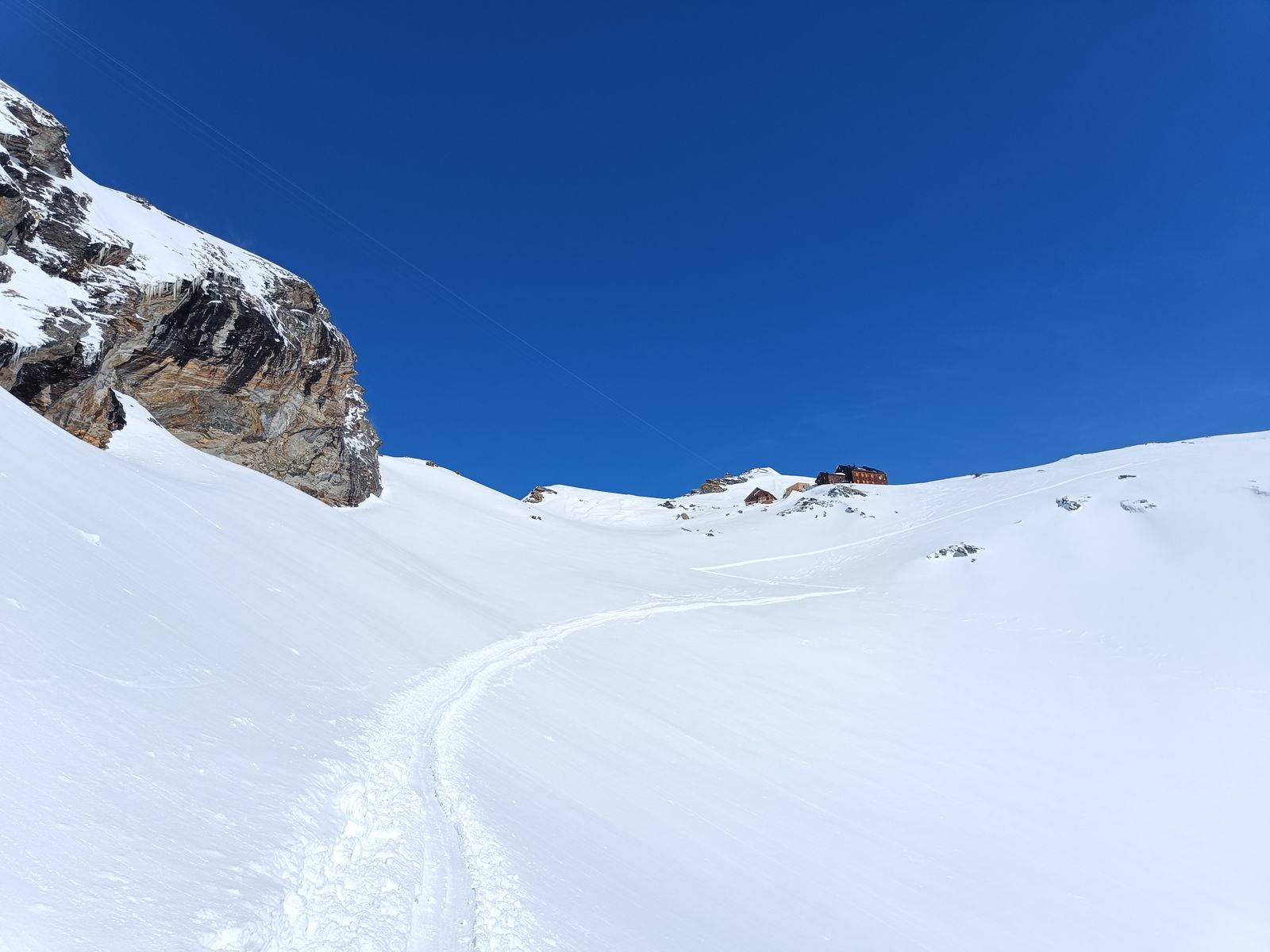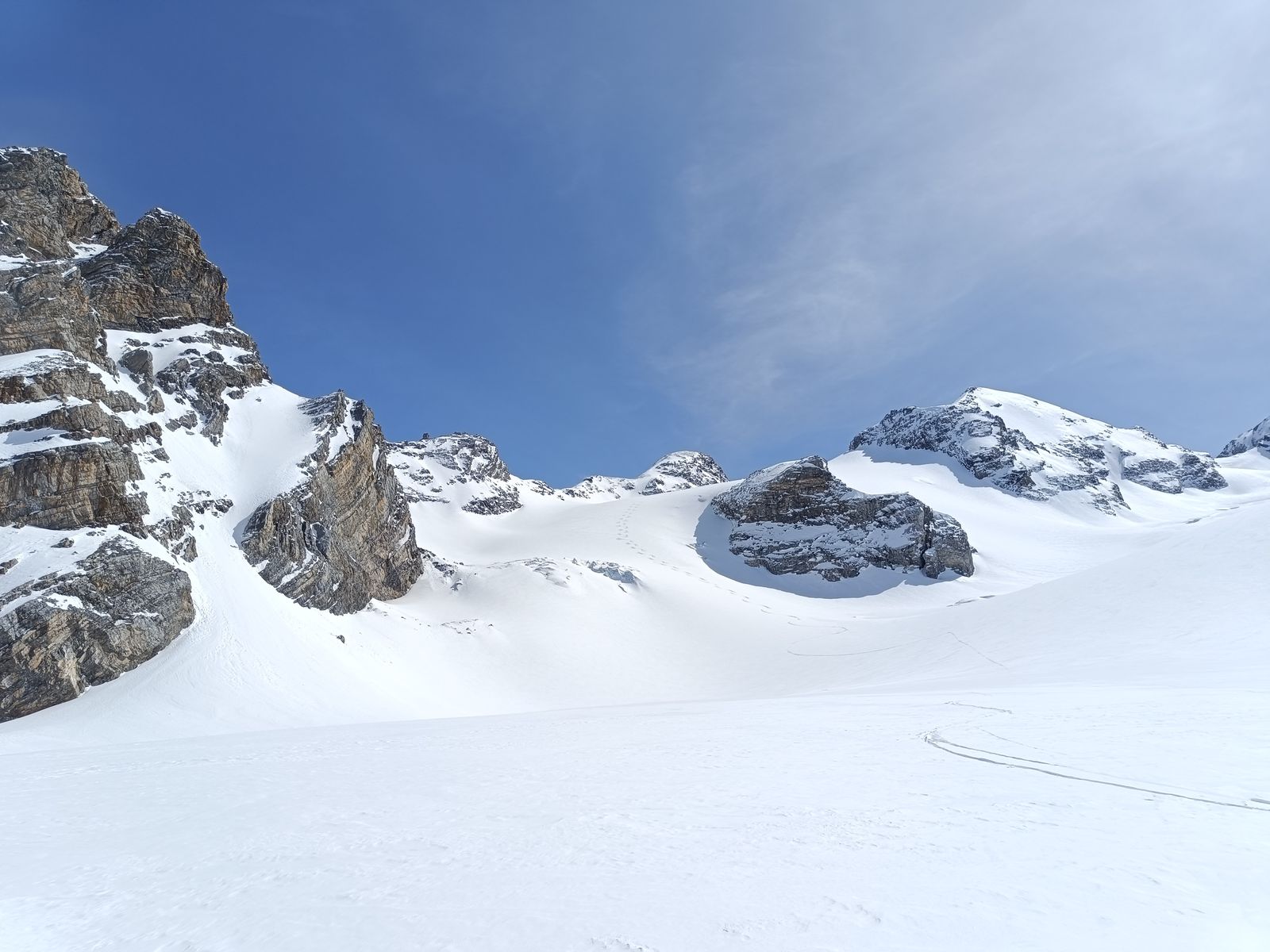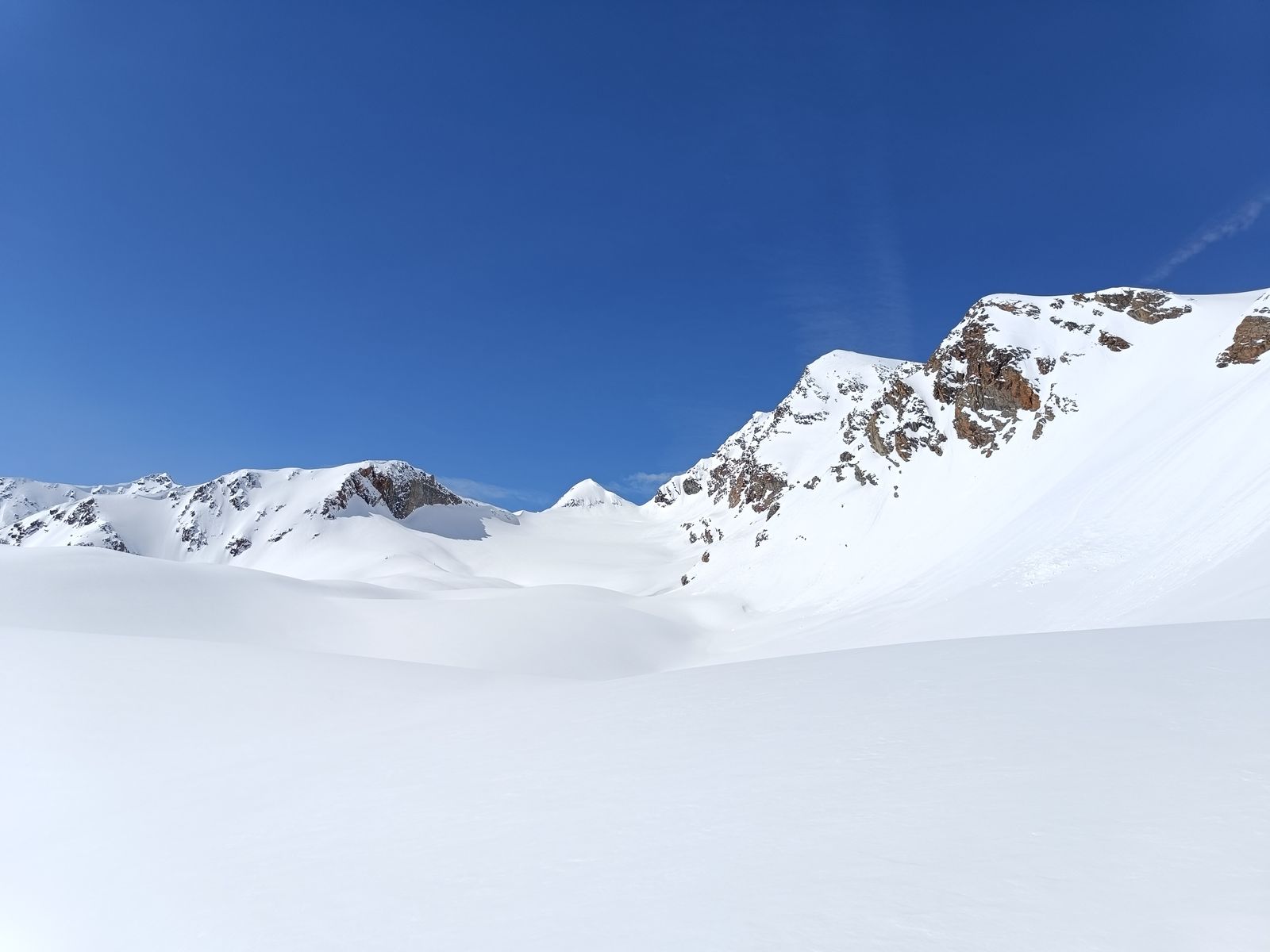Zurück am Törl beschloss ich nach kurzer Zwischenabfahrt in die Grube (geht nicht mit Fellen), nochmals zum Kotalmjoch aufzusteigen, weil die Hänge erstaunlicherweise auch um 15 Uhr noch nicht "durch" waren - zwar etwas sulziger, aber immer noch feste Unterlage und kein einziger Durchbrecher.