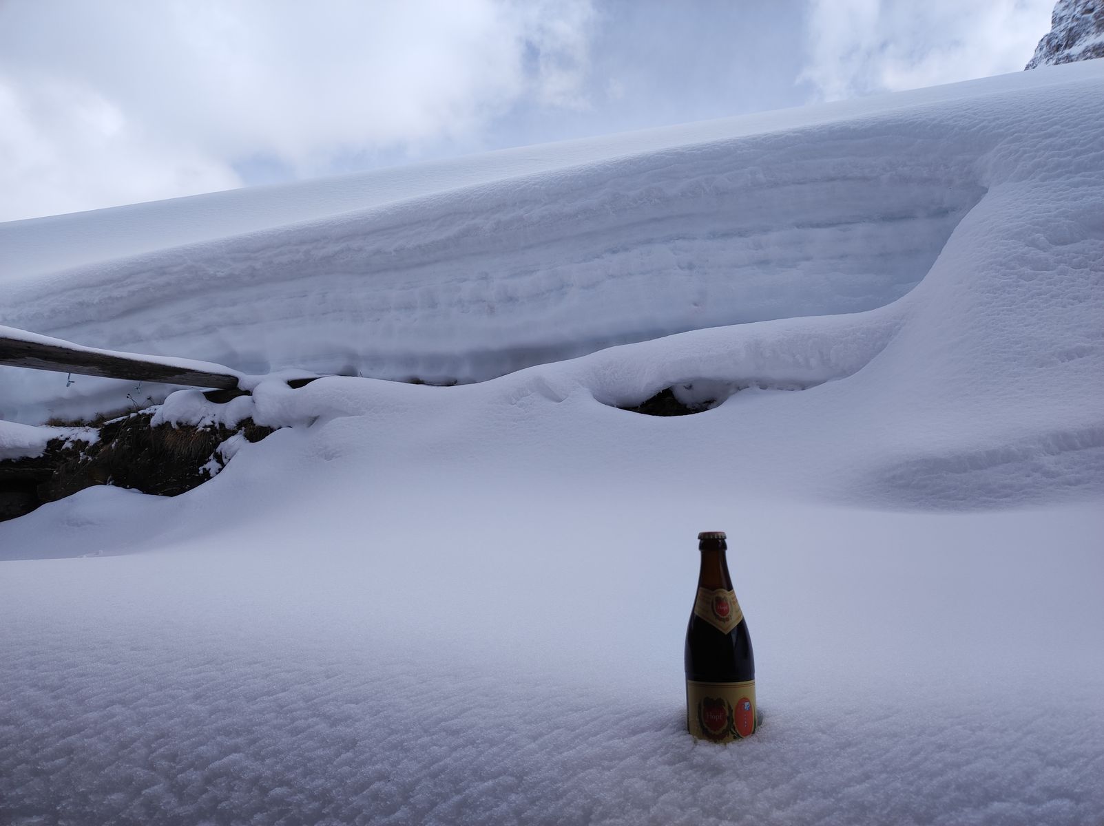 Tipp: Für die Abfahrt zum Mittelleger am besten nach dem Steilhang links halten und lieber genussvoll abfahren bis es an einem Bach nicht mehr weitergeht, als zu versuchen die Höhe zu halten und zur Alm zu schieben. Am Bach wieder anfellen, zur Alm und dann noch etwa 150 Hm die Hänge rechts der Alm hinauf. Das bringt einen netten Bonushang + tollen Karwendelblick. Ich trinke da oben dann immer mein Bier...