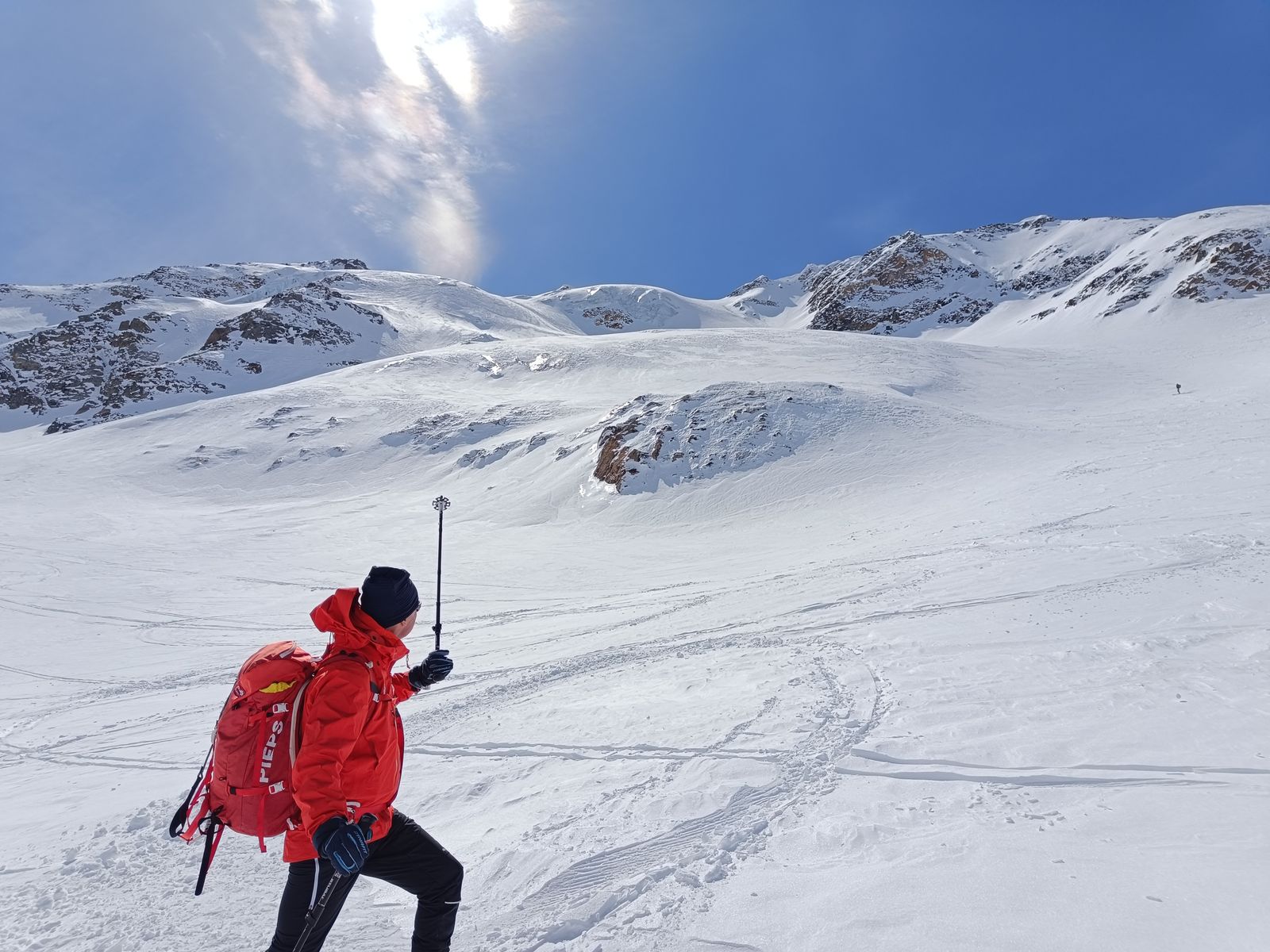 Ohje! Der Schnee ist harschig, trägt aber nicht. Das wäre jetzt ein Moment gewesen, wo man durchaus umdrehen hätte können. Aber was dann? Glei zum Wirt? Na, da probier ich es doch lieber noch ein bisserl. Und tatsächlich: Nach 300 Hm (auf ca. 2200m) trägt der Schnee, auch dank a Lawinenschnees. Ich habe mich im unteren Teil weit links entlang des gewaltigen Felskolosses gehalten, was kürzer ist als die übliche Route, aber nur gemacht werden sollte, wenn die Felsen schon vom Schnee entladen sind wie heute (siehe Bilder). Am Gletscher war ich froh, dass der Pulver ziemlich windgepresst war, da dies das Spuren sehr erleichterte. In der Abfahrt dennoch herrlich! Bis 2200 Meter Pulver und dann gut fahrbarer Sulz.