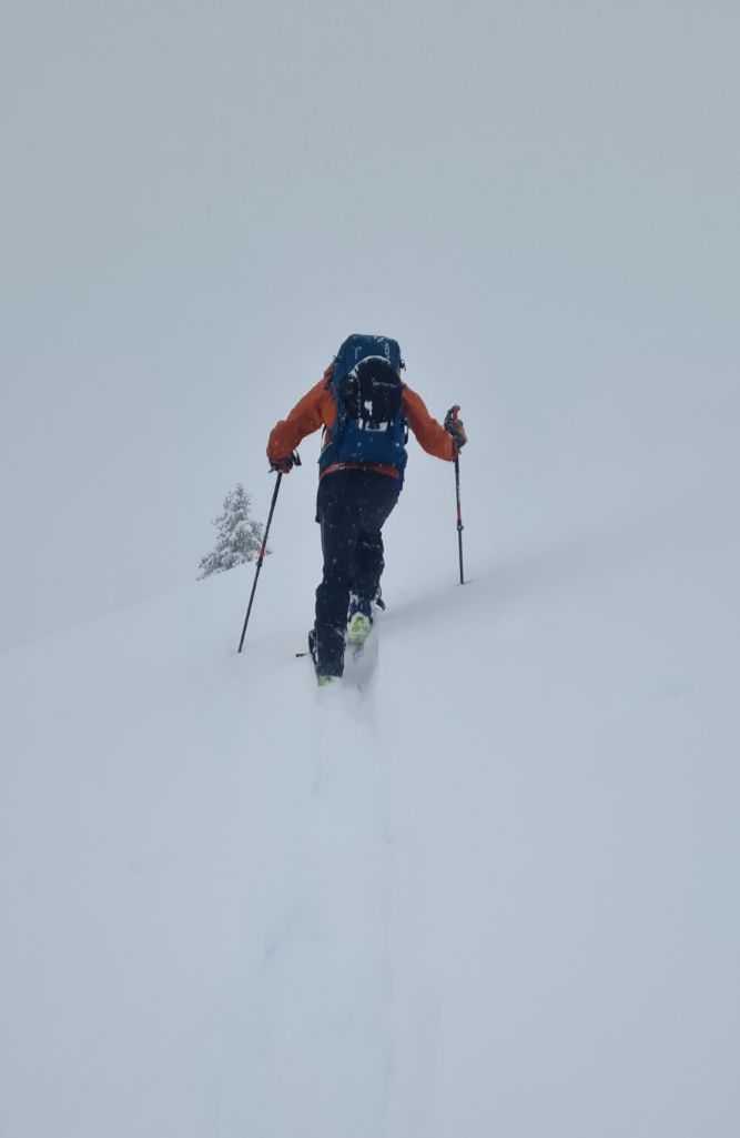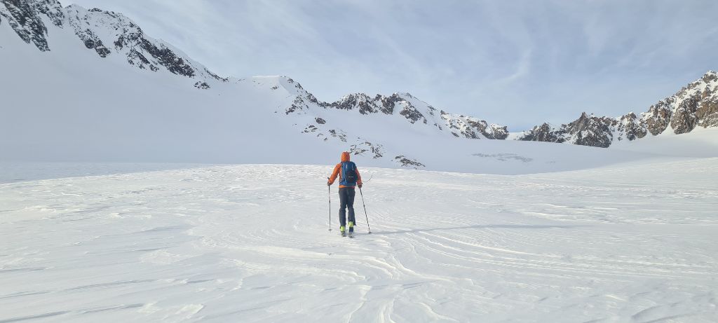 Irgendwie aber auch einfach ein eindrucksvolles Naturerlebnis! Im Anstieg zur SWS herrschte am Gletscher immer ein starker Wind (um 50km/h), der ständig die Richtung wechselte. Beim Blick zum Kamm hoch, konnte man dann in Form von mächtigen Schneewirbeln immer auch schon frühzeitig erkennen, dass die Söhne und Töchter des Aiolos sich wieder rüsten, um mit voller Gewalt über den Skitourengeher hereinzubrechen. Bei den Böen musste man einfach kurz stehenbleiben, damit es einen nicht umhaut...