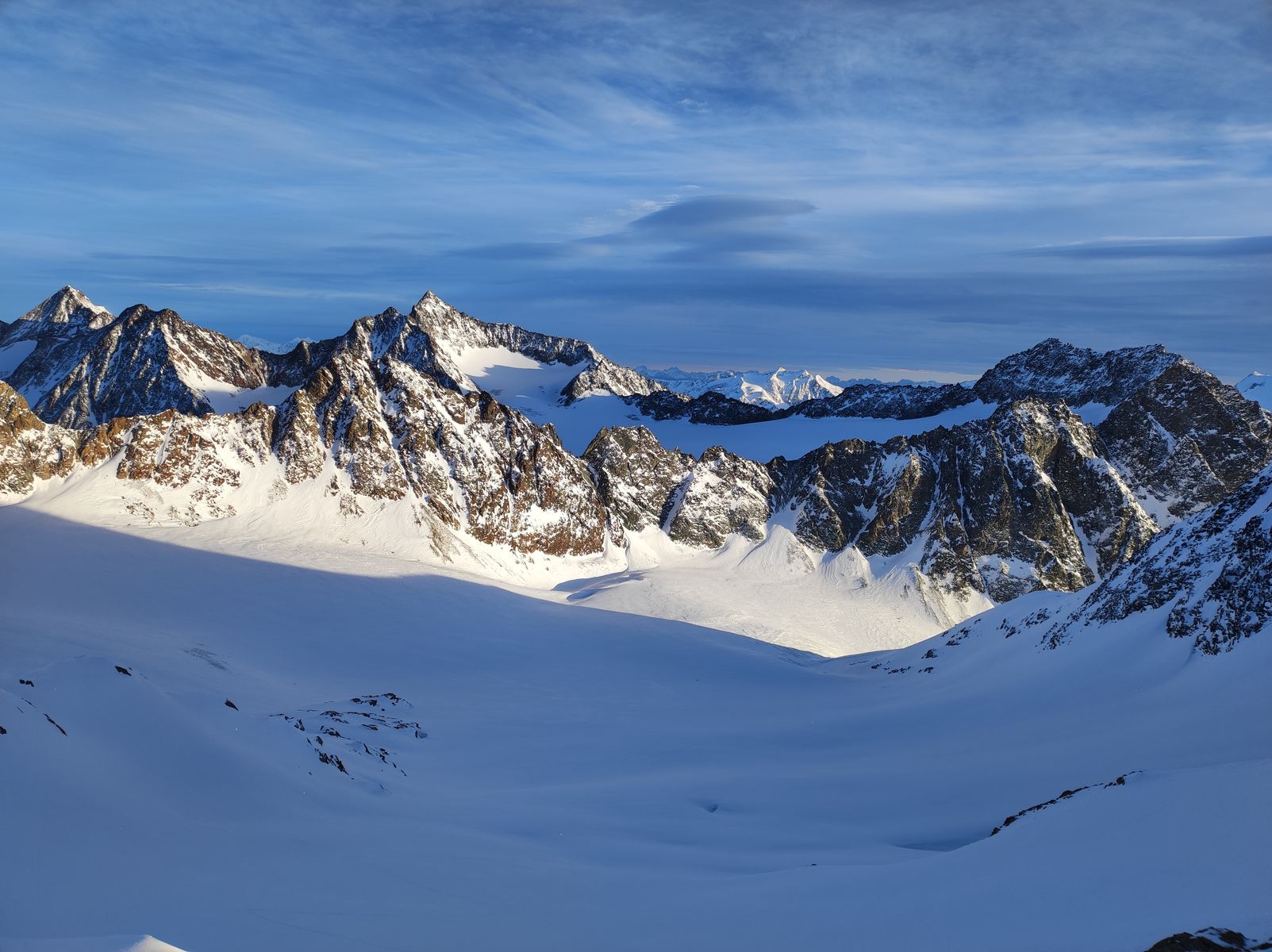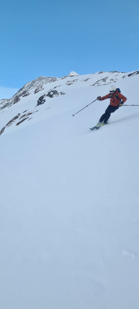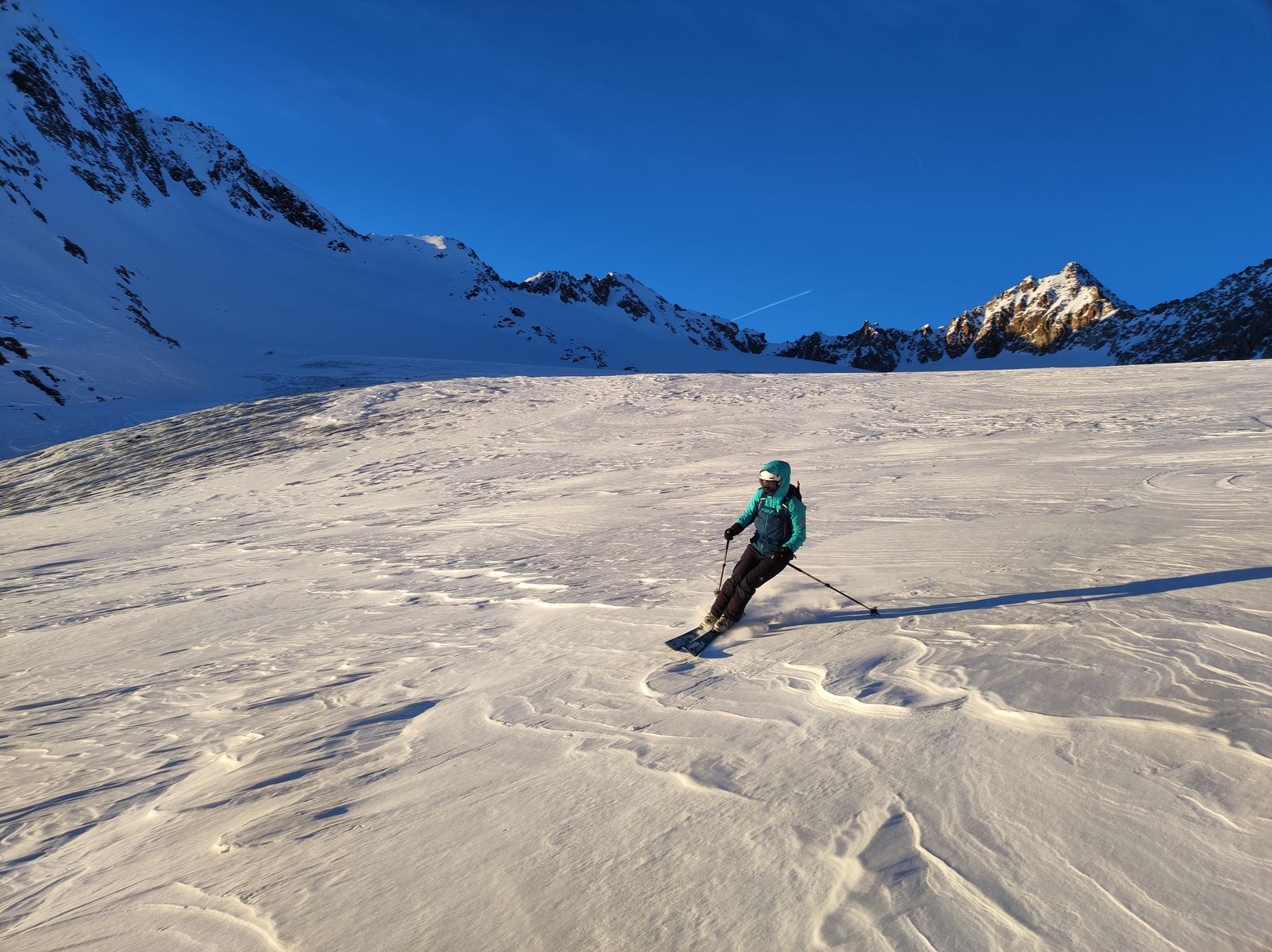 Gute, oberhalb von 2500 Metern sehr gute Schneelage. Der Wind hat den Schnee sehr kompakt gepresst und auf den Gletschern (,auf denen wir waren,) kann man daher ohne Seil unterwegs sein. Lawinengefahr in meinen Augen fast gegen Null tendierend: Es waren nicht einmal an klassischen Punkten (zB Aufstieg zur Martin Busch) Rutsche zu erkennen. Die Schneequalität war deutlich besser als man bei dem vielen Wind meinen würde. Verschiedene Formen von windgepresstem Schnee, die sich aber bei entsprechender Entschlossenheit wirklich gut fahren ließen.