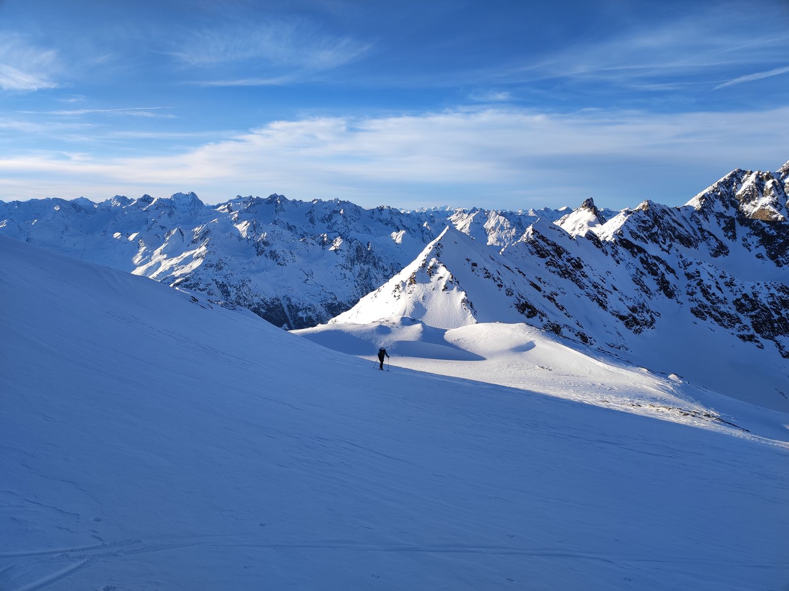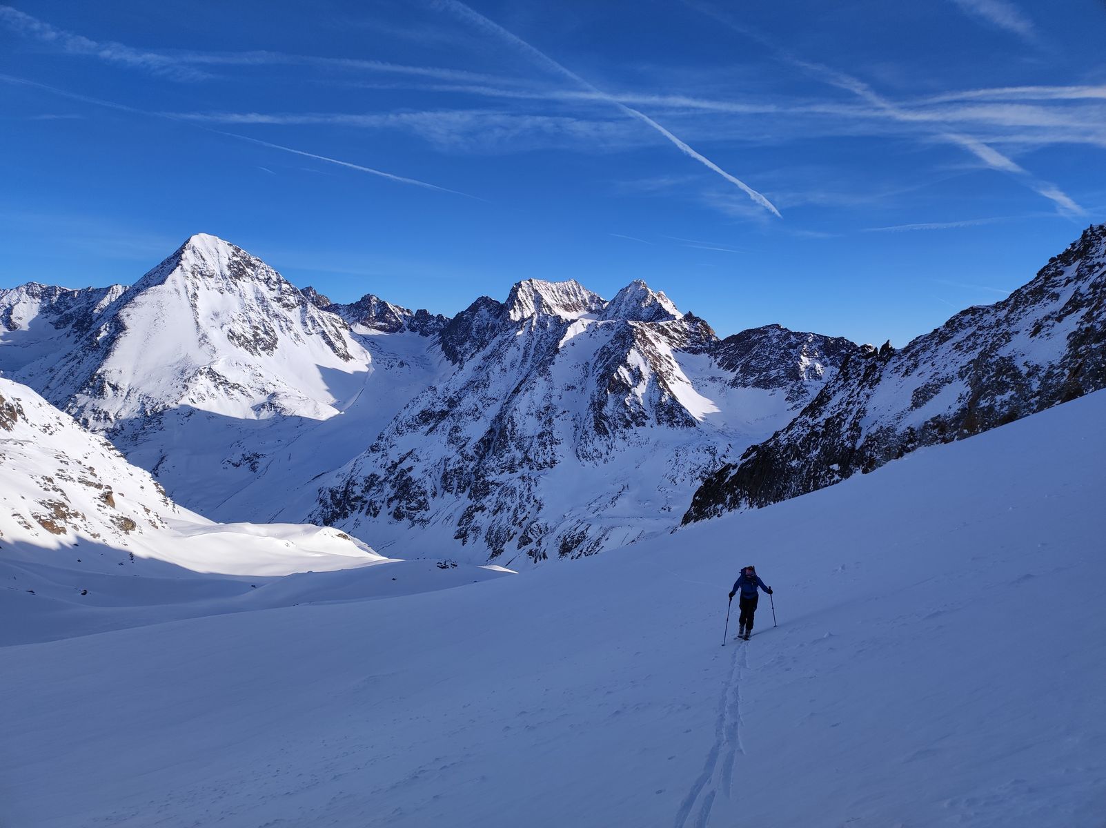 Wir hatten freilich die Hoffnung, dass sich der Wind etwas legen würde, aber das Gegenteil war der Fall. Während es gestern Abend auf der VH fast windstill war, fegte mir heute beim Öffnen der Tür schon gleich ein ordentlicher Schneestoß entgegen. Dennoch sind wir auf dem üblichen Weg noch zur Schwarzwandspitze. Auf die eigentlich zusätzlich geplante Hochvernagtspitze haben wir dann verzichtet und sind nach Vent abgefahren (Gegenanstieg nötig).