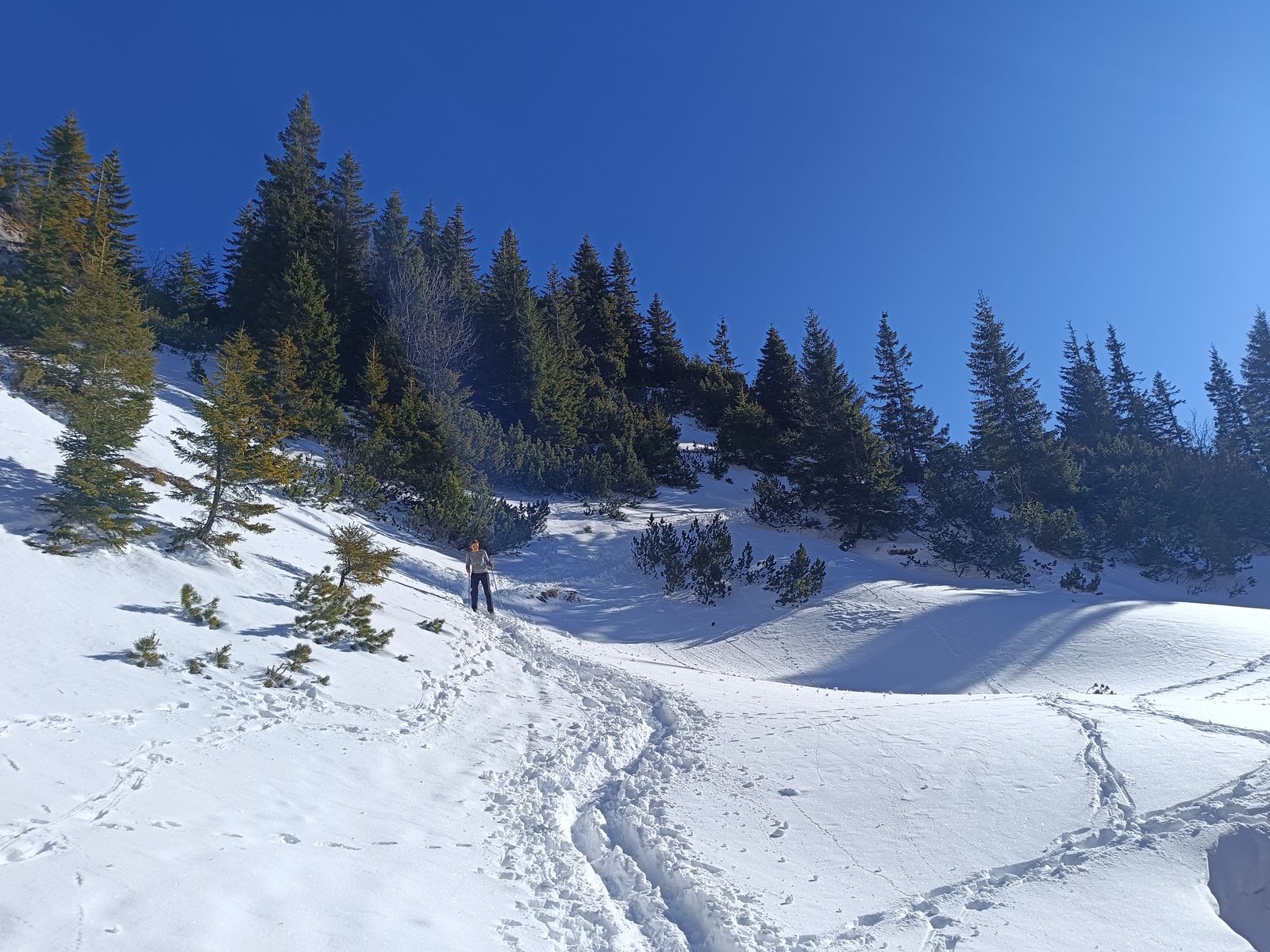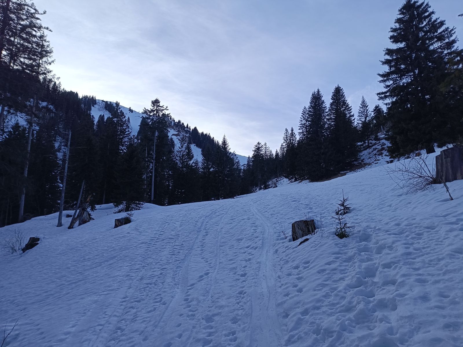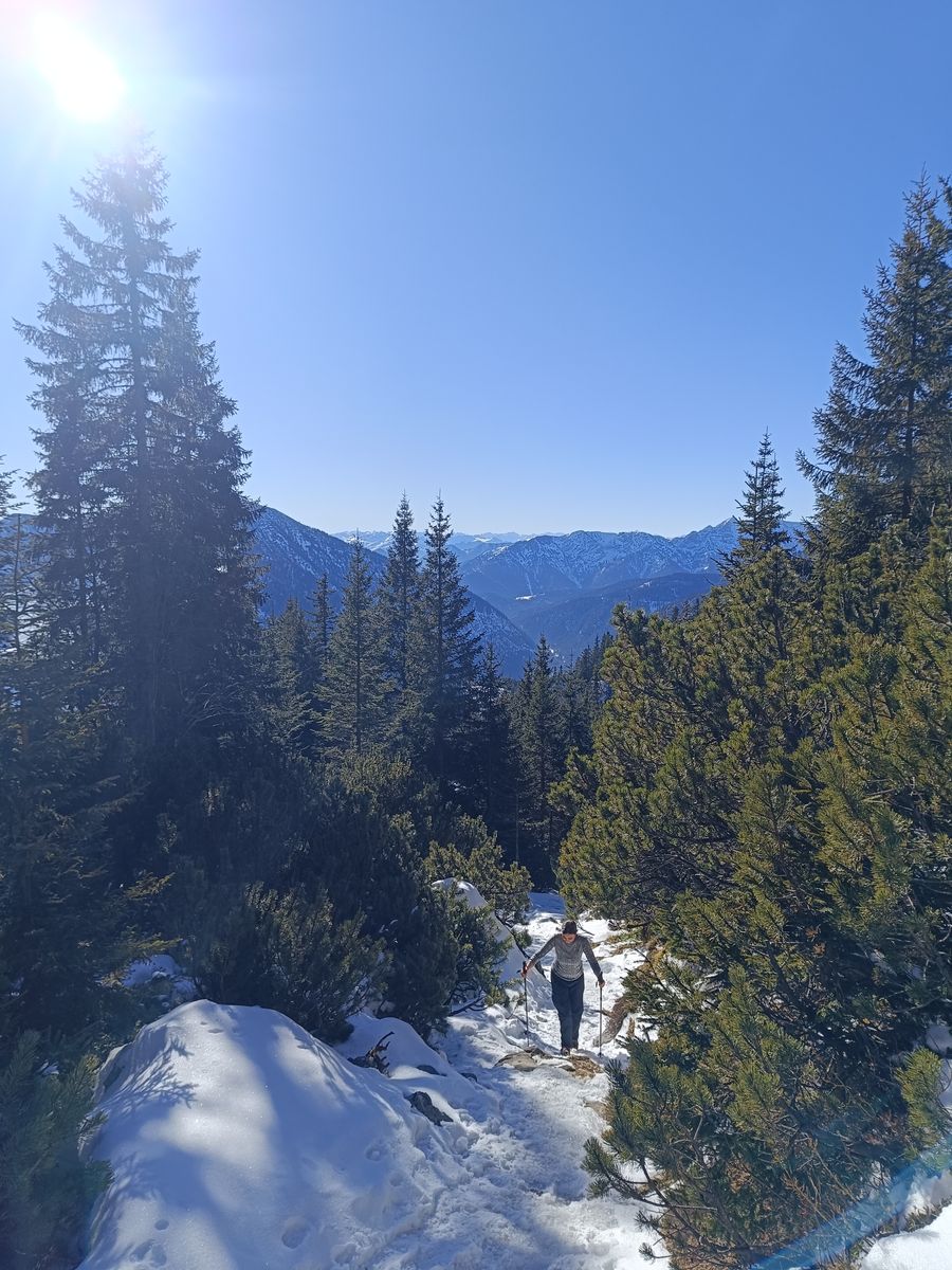 Zunächst bin ich auf der Normalroute zum Kreuzjöchl. Das schöne Waldstück ging heute auf der Route des Sommerwegs noch gut mit Skiern im Aufstieg, bald wird es aber besser sein, länger auf der Forststraße zu bleiben. Für die Talabfahrt sollte man aber auf jeden Fall die Seebless-Route nehmen, weil's im Wald ja nicht gescheit auffirnt.