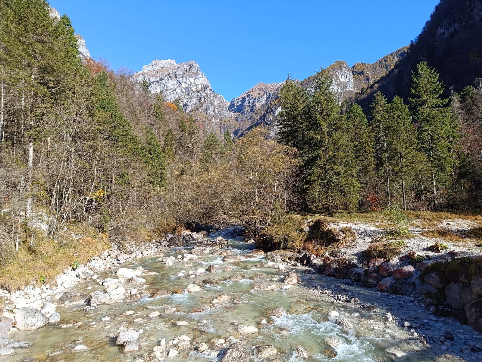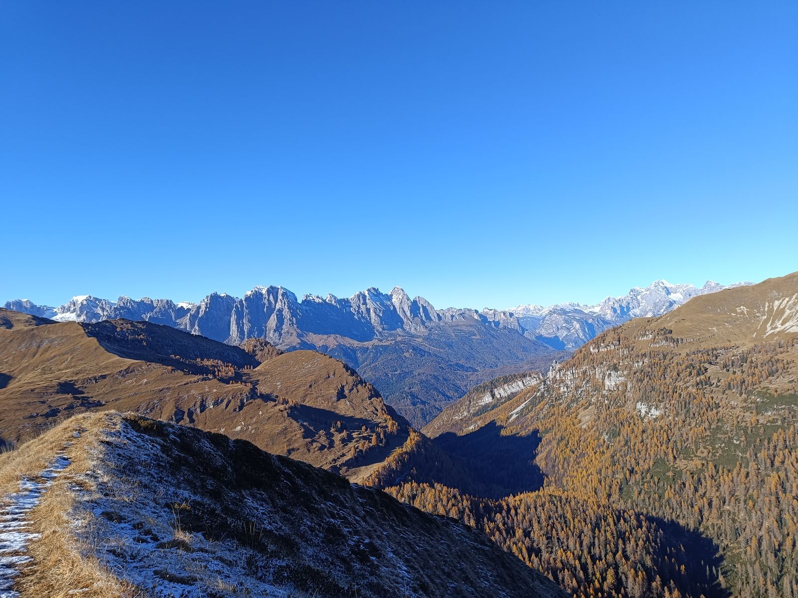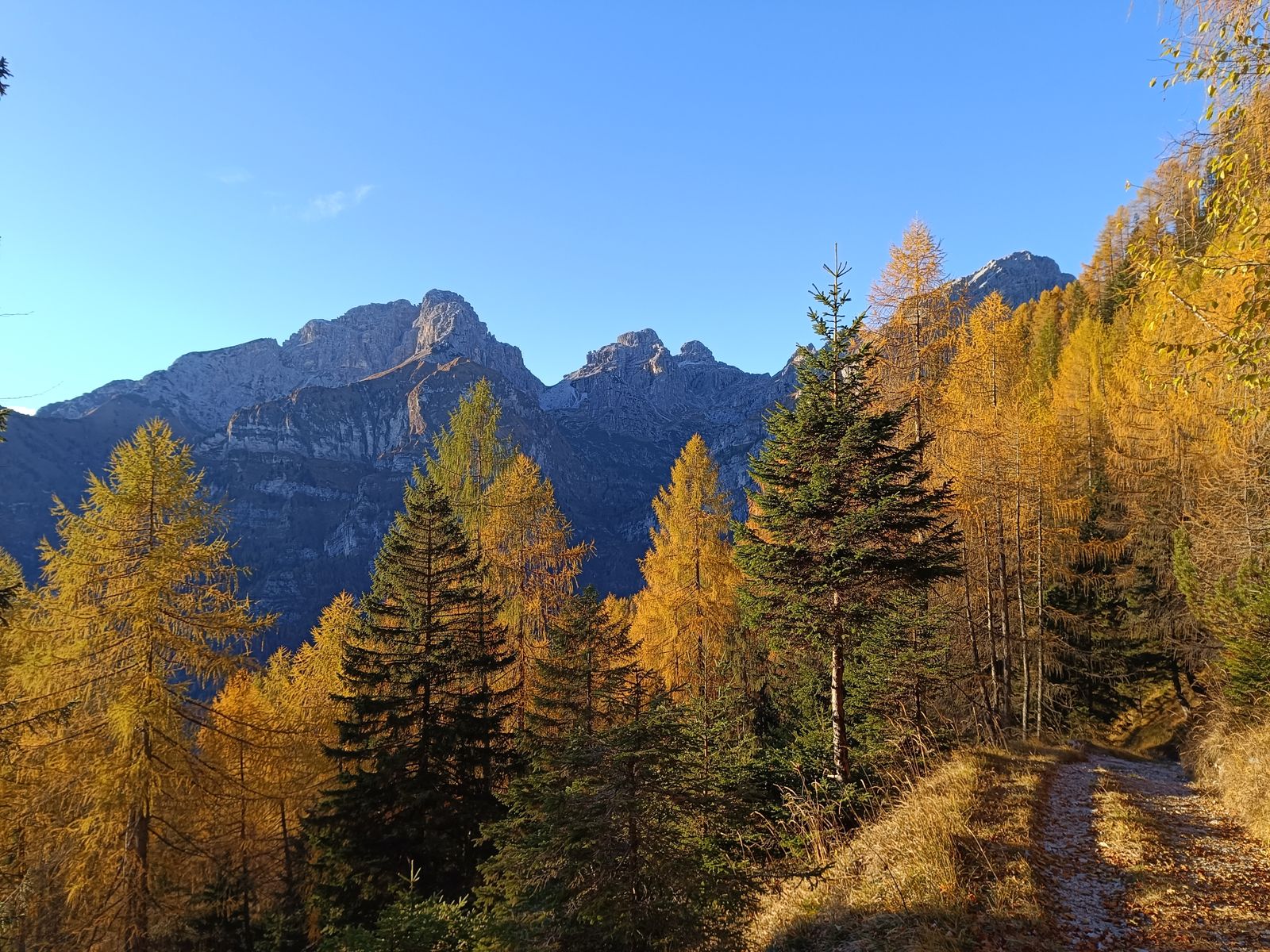 Anmerkung: Der Spätherbst ist die beste Zeit für die südlichsten Dolomiten-Gruppen, weil hier im Sommer oft der Dunst aus der Poebene hängt. Und auch wenn die Gipfelhöhen geringer sind als in den zentralen Dolomiten, ist der Höhenunterschied von den Ausgangspunkten oftmals größer als dort. Von meinem Schlafplatz zum Gipfel des Sass de Mura, dem höchsten Berg der Cimonega, sind es 2000 Hm!