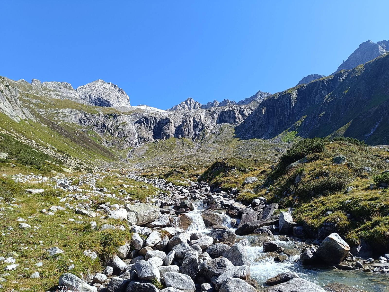 Mit persönlich gefällt der Weg durch das malerische Pfossental zur Stettiner deutlich besser als der Anstieg von Pfelders, den ich immer als ziemlich karg empfunden habe. Zwar ist dieser lang und oft flach, aber landschaftlich sehr abwechslungsreich; vor allem die spektakulären Berge der Texelgruppe auf der nördlichen Talseite sind einfach beeindruckend. Außerdem kommt man am wunderschönen, bewirtschafteten Eishof vorbei, der früher der höchstgelegene dauerhaft bewohnte Hof (2050m) in Südtirol war. Neben einer sehr großen Herde Tiroler Grauviehs haben sie hier Haflinger, Schafe und Ziegen.