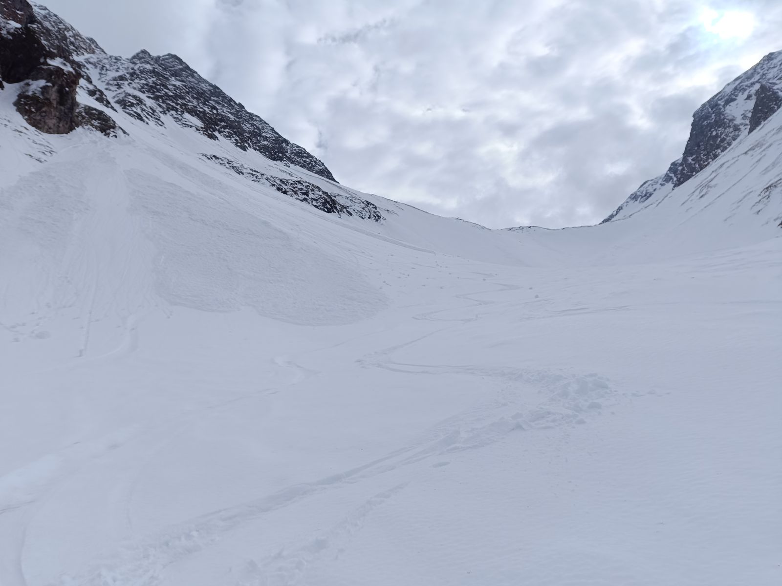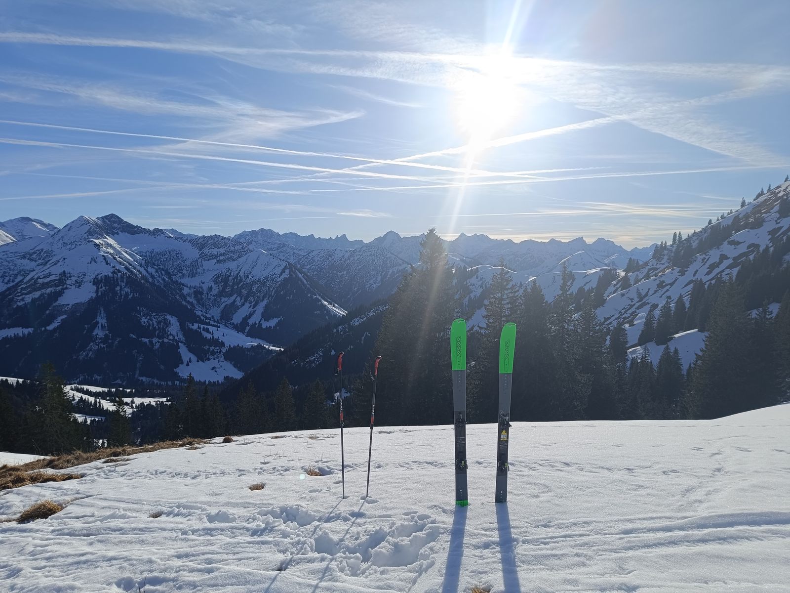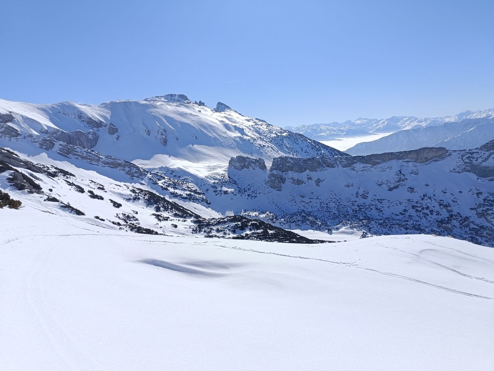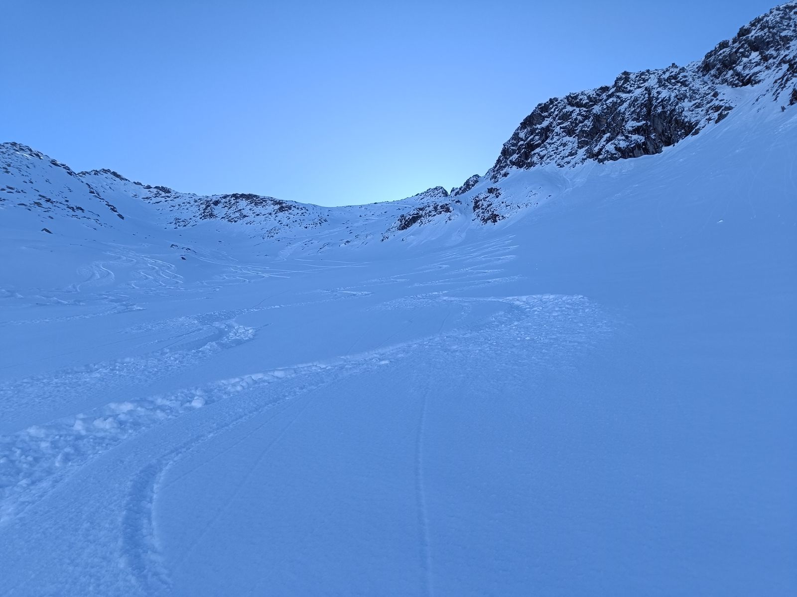 Ausblick: Die Nord- und Ostabfahrten der beiden Gipfel sind schon sehr verspurt; der Kenner wird vor allem am Schwarz aber schon noch unberührtes Gelände finden. Ansonsten sollte man viel befahrenes, sonniges Gelände in den nächsten Tagen tunlichst meiden, weil es da üblen Bruchharsch haben wird - war heute in einen kurzen Teilstück der Talabfahrt (südost) am Nachmittag schon so. Wenig befahrene sonnige Hänge können aber bei entsprechenden Timing durchaus sehr fein sein.