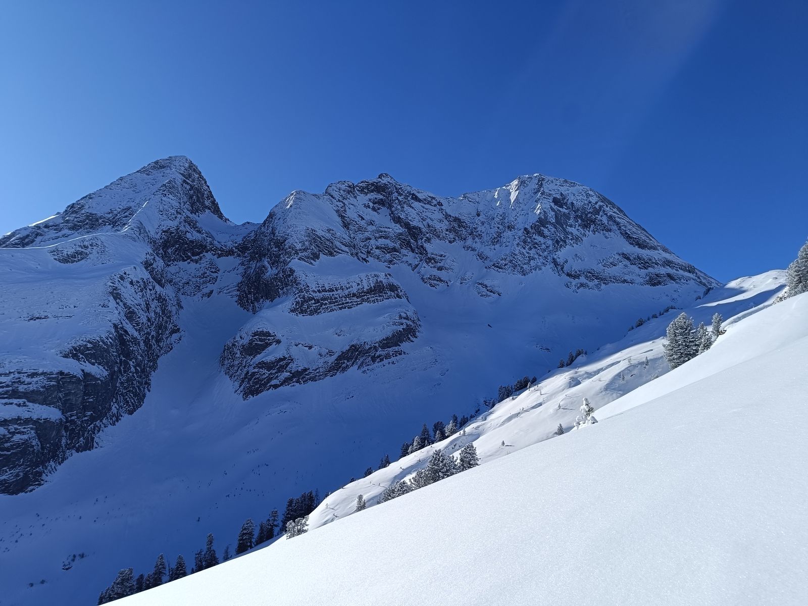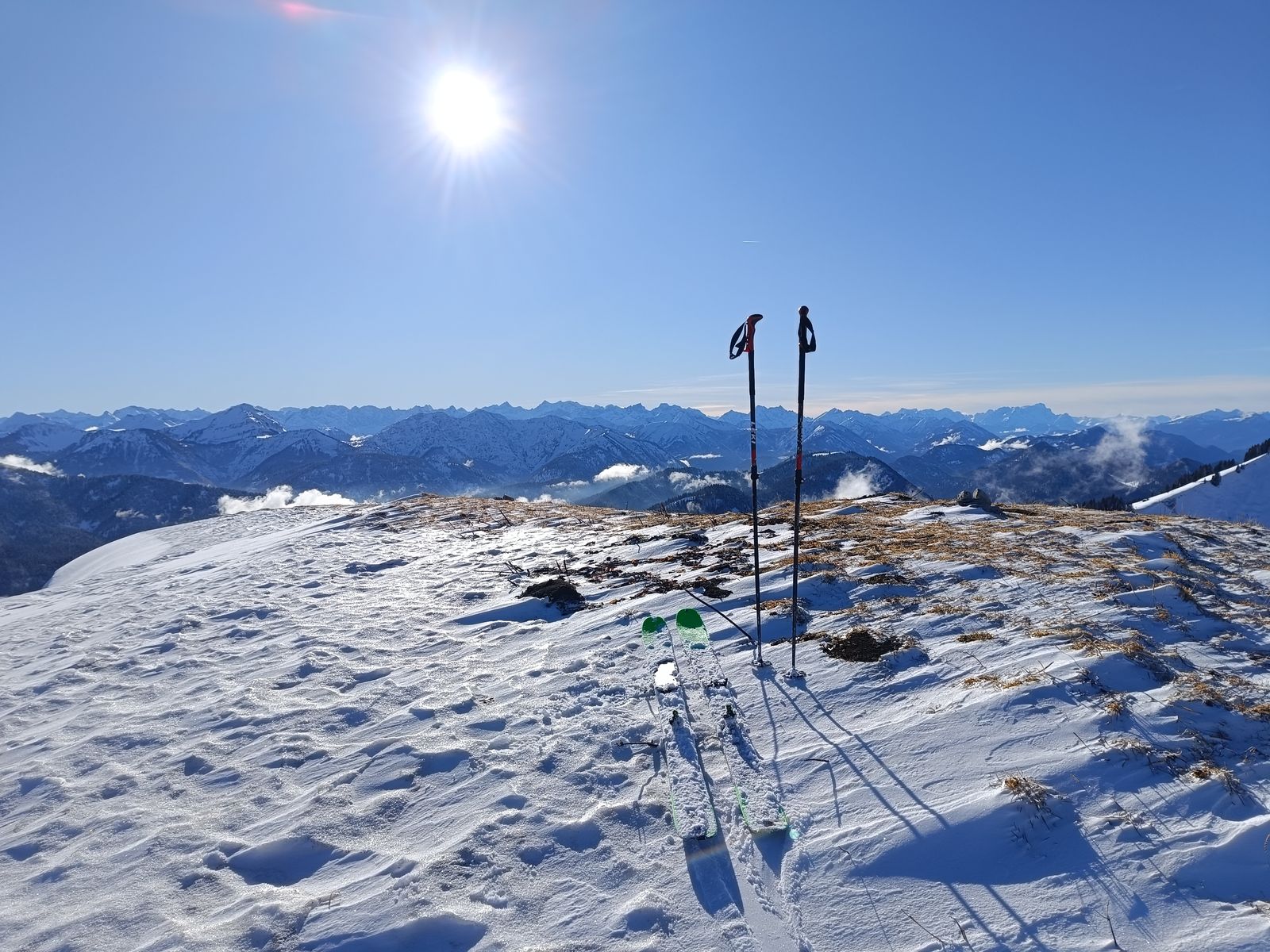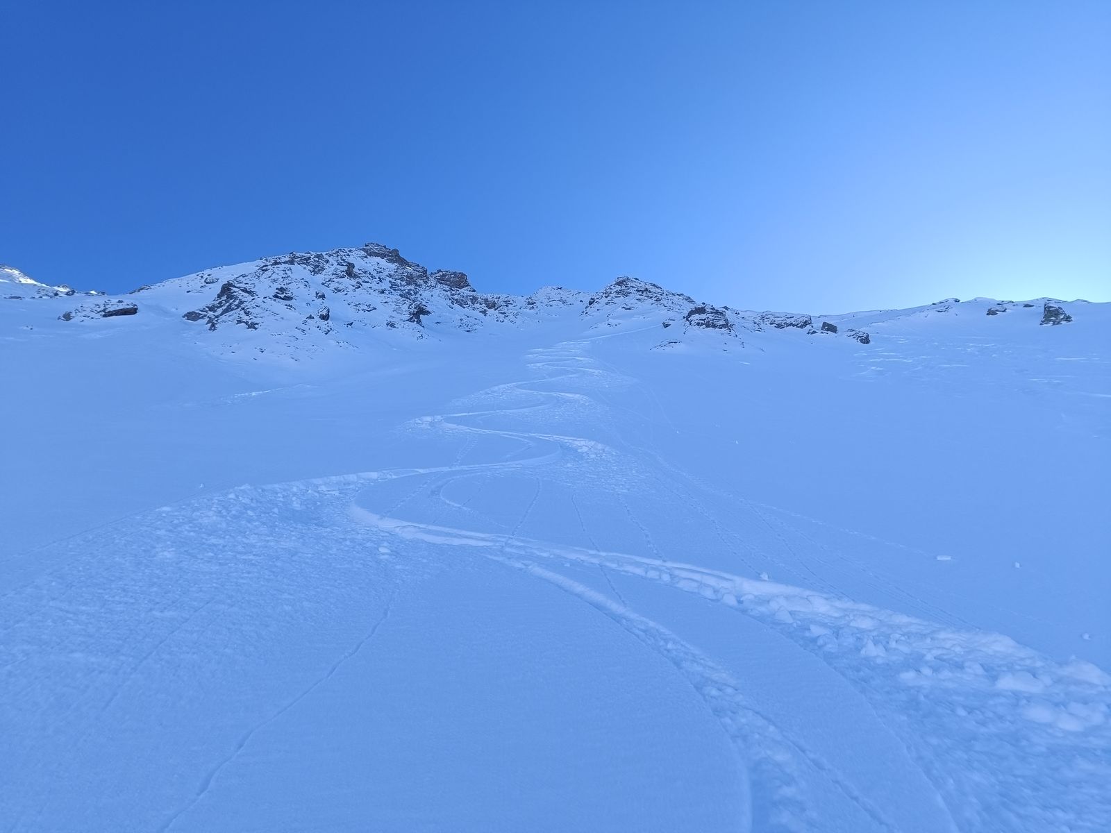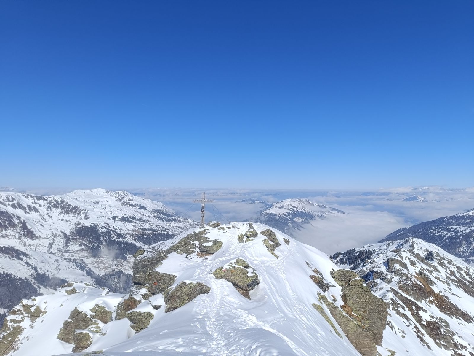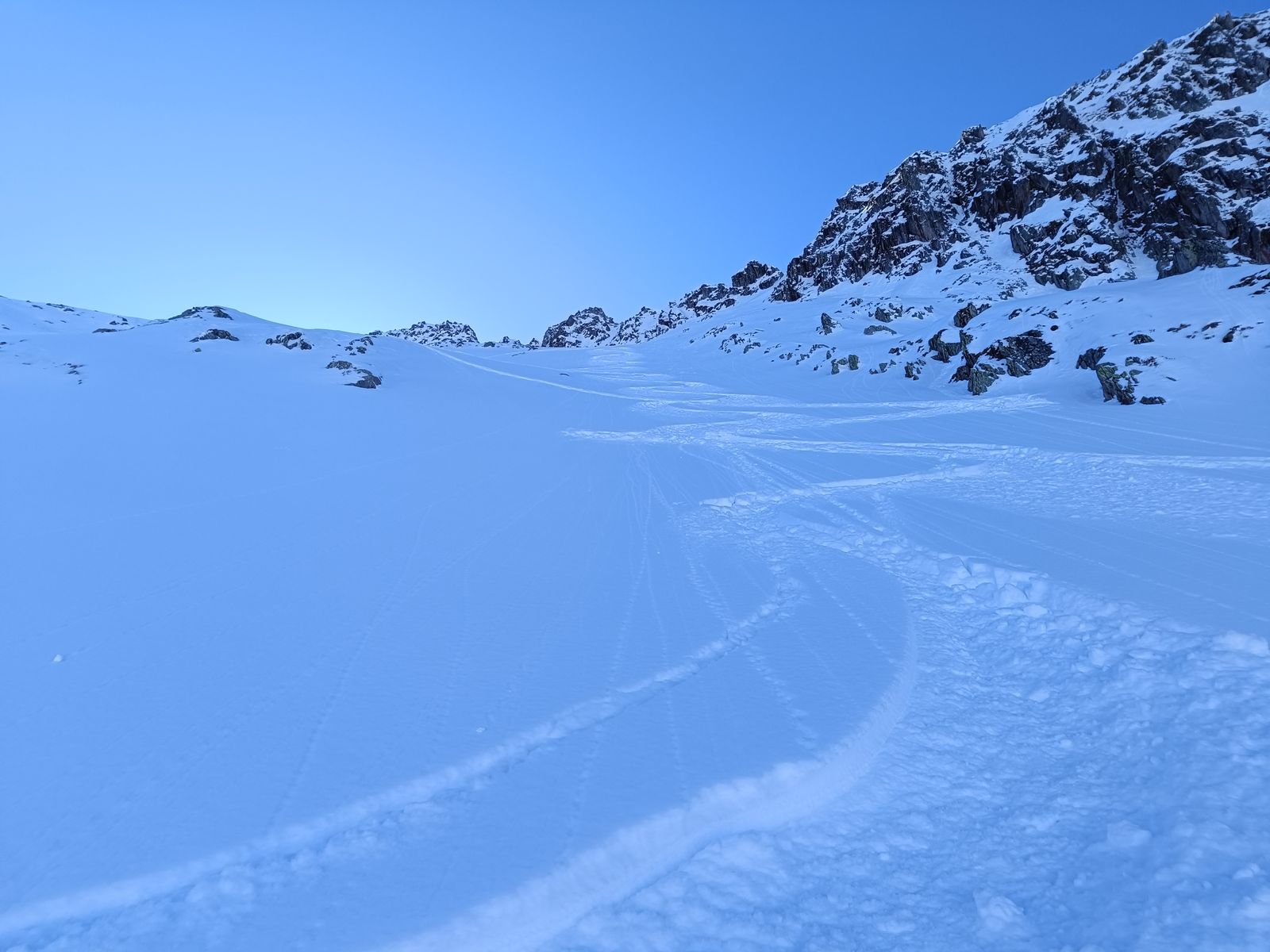 Ausblick: Die Nord- und Ostabfahrten der beiden Gipfel sind schon sehr verspurt; der Kenner wird vor allem am Schwarz aber schon noch unberührtes Gelände finden. Ansonsten sollte man viel befahrenes, sonniges Gelände in den nächsten Tagen tunlichst meiden, weil es da üblen Bruchharsch haben wird - war heute in einen kurzen Teilstück der Talabfahrt (südost) am Nachmittag schon so. Wenig befahrene sonnige Hänge können aber bei entsprechenden Timing durchaus sehr fein sein.