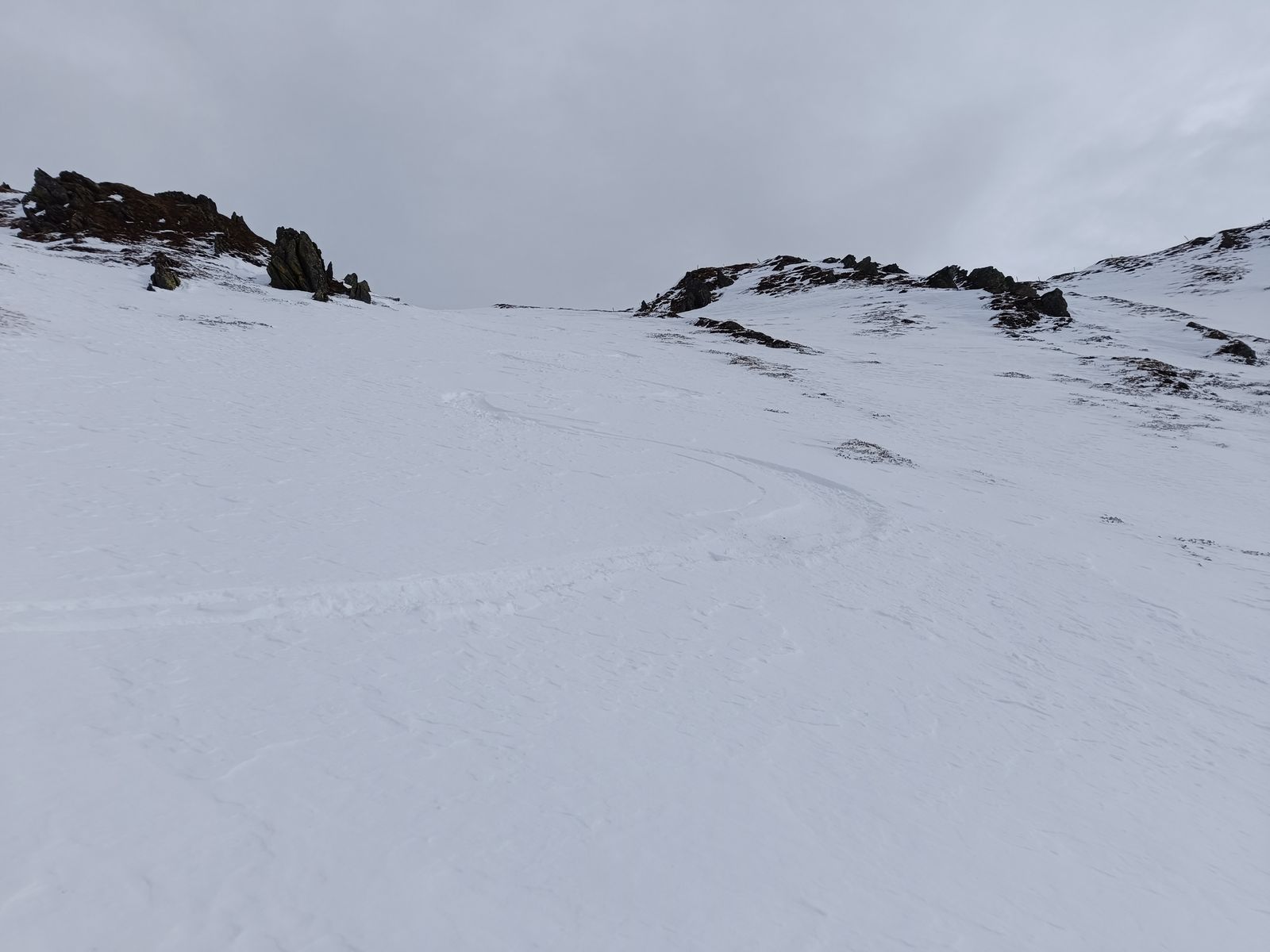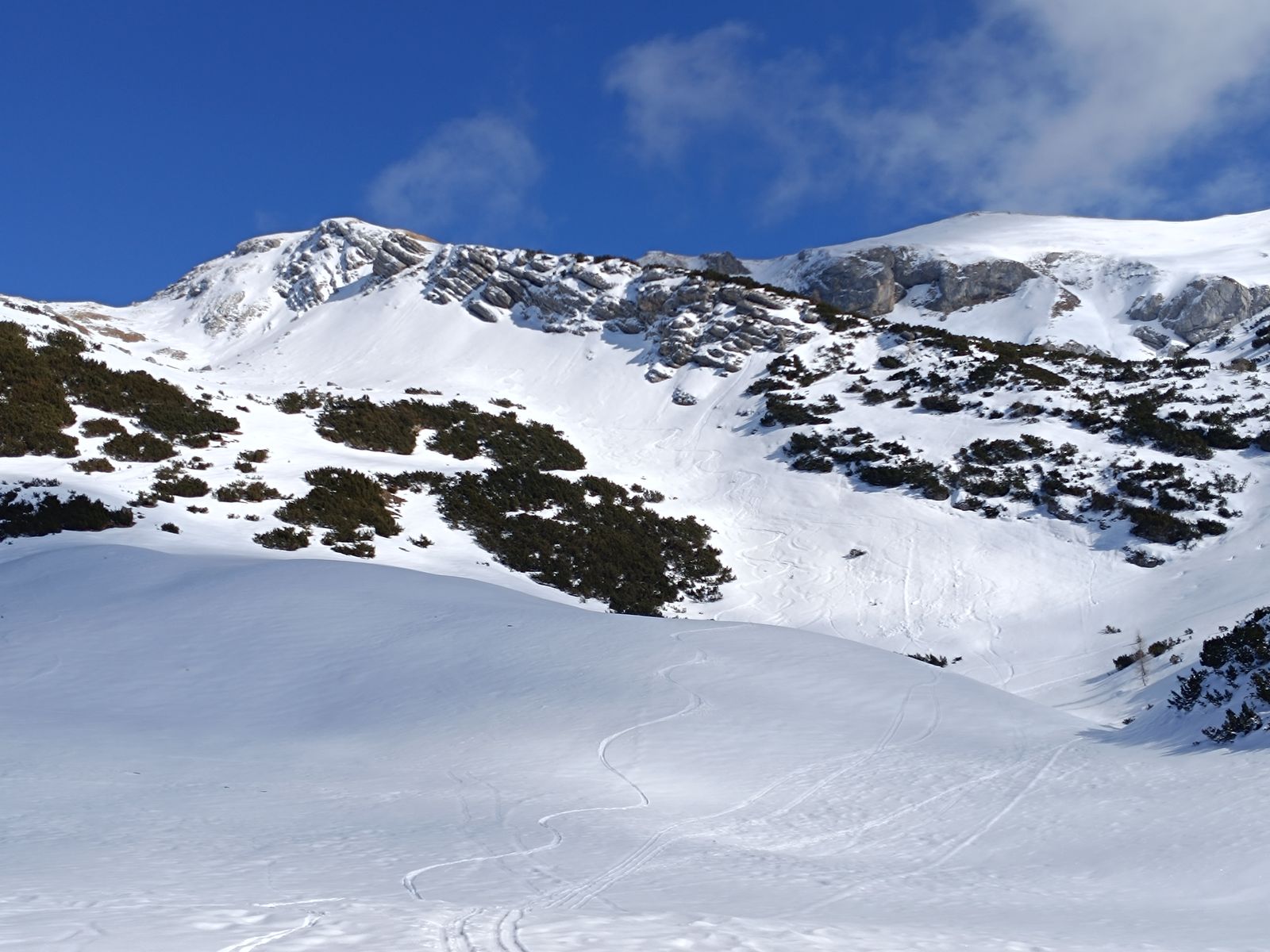 Lawinengefahr: Gering, aber die direkte Nordabfahrt vom Gipfel des Tanzkogels zeigt massiven Windeinfluss und wurde heute anscheinend nicht gemacht.