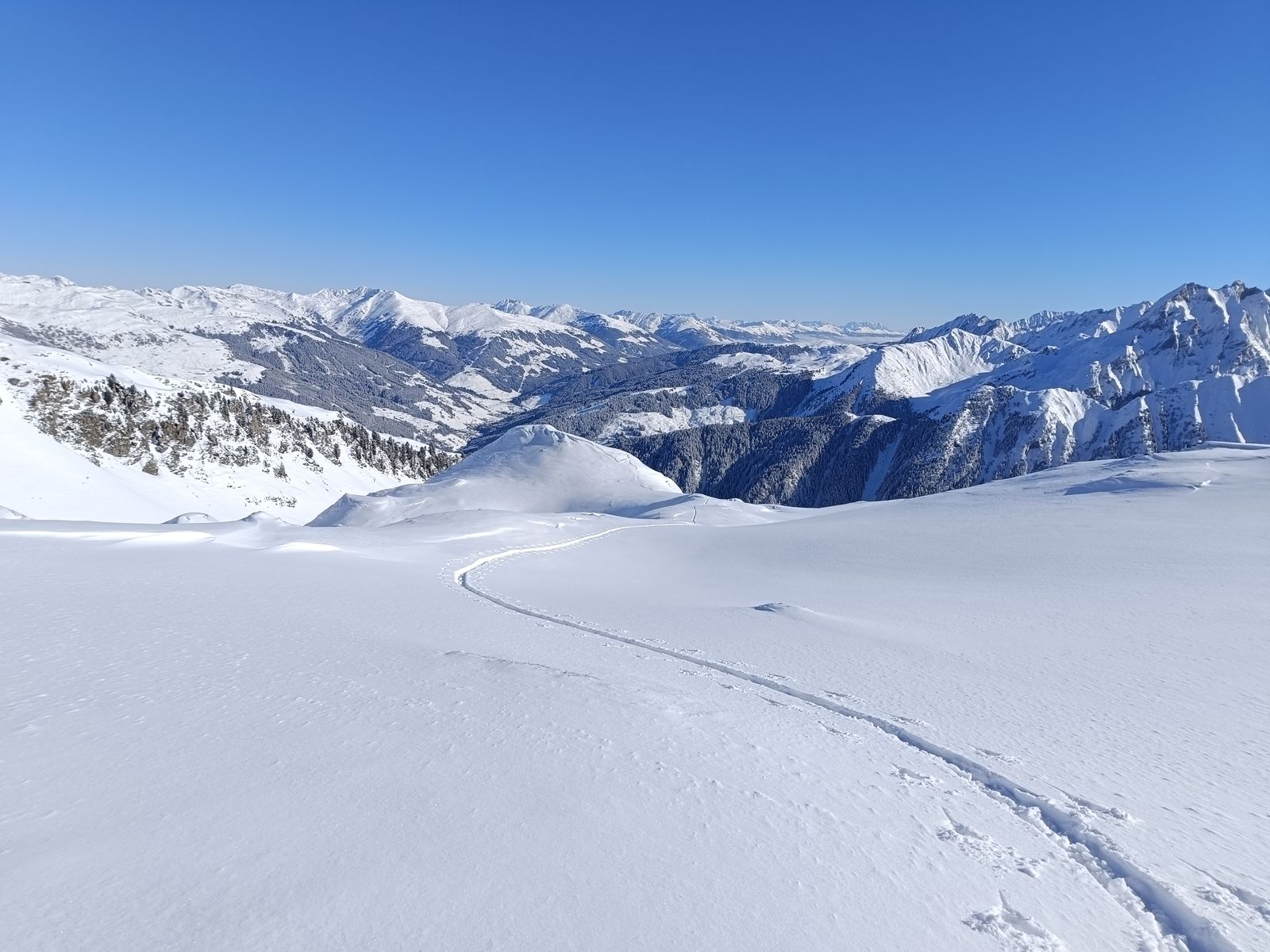 Ich bin zunächst der Route zum Gerstinger Joch gefolgt und dann auf den Anstieg zum Tanzkogel abgezweigt. Die nervige Querung der Gräben nach der Stockeralm ging heute noch, aber morgen wird man da teilweise schon tragen müssen (südexponiert). Tipp: Viel lohnender erreicht man den Tanzkogel, indem man auf das Gerstinger Joch steigt und von dort kurz über einen Südhang in die Senke vor dem Kleinen Tanzkogel abfährt. Über diesen dann zum Hauptgipfel (tolle Kammwanderung). Das mache ich sonst immer, aber heute wollte ich mir mal die Standardroute anschauen. Nach dem Wald ging der Anstieg schön von der Hand und vom Gipfel bin ich gleich wieder bis zum Wald hinunter gewedelt. Im obersten Hang (Südost) Firn und danach Edelpulver im Nordhang. Schnell wieder anfellen und weiter geht der Spaß! Dieses Mal bin ich kurz vor dem Gipfel nach links zum Schwarzkarkogel abgezweigt. Dieser an sich unbedeutende Gupf ist meiner Meinung nach einer der besten Skiberge in den Kitzbühelern mit vielen, auch steilen Abfahrtsvarianten. Ich habe mich zunächst für eine der steilen nordseitigen (über 35 Grad) "Engmulden" - "Rinne" wäre jetzt wegen fehlender Felsbegrenzungen vielleicht übertrieben - entschieden. Einfach herrlich! Zwar ganz leichter Winddeckel, aber mit Schwung super zu fahren. Nach etwa 500 Hm Abfahrt ging es wieder zum Schwarz hoch und dort sah ich am Gipfel zu meiner Freude, dass mittlerweile auf der Westseite eine Aufstiegsspur von der Miesenbachalm angelegt worden war. Ohne diese wäre ich da nicht abgefahren, weil mir das Hochspuren nach dem gestrigen Tag doch ein bisserl arg anstrengend gewesen wäre. Die Abfahrt hatte ich dann exklusiv für mich, weil die Leute, die gespurt haben (DANKE), offensichtlich auf einer Rundtour waren und hier nicht abgefahren sind. Obwohl der Hang westexponiert ist und sehr viel Sonne bekommt, war es mit ein bisserl Auge für's Gelände möglich, in bestem Pulver zur Alm hinabzuschwingen. Nach dem letzten Aufstieg zum Schwarz habe ich eine andere Engmulde für die finale Abfahrt gewählt - wieder genial zu fahren.