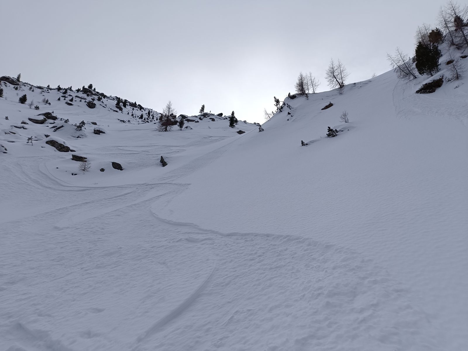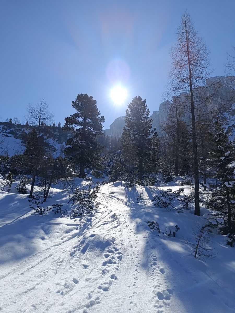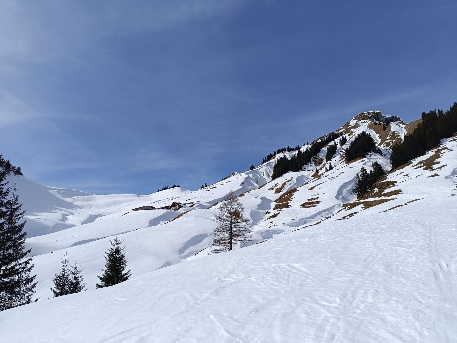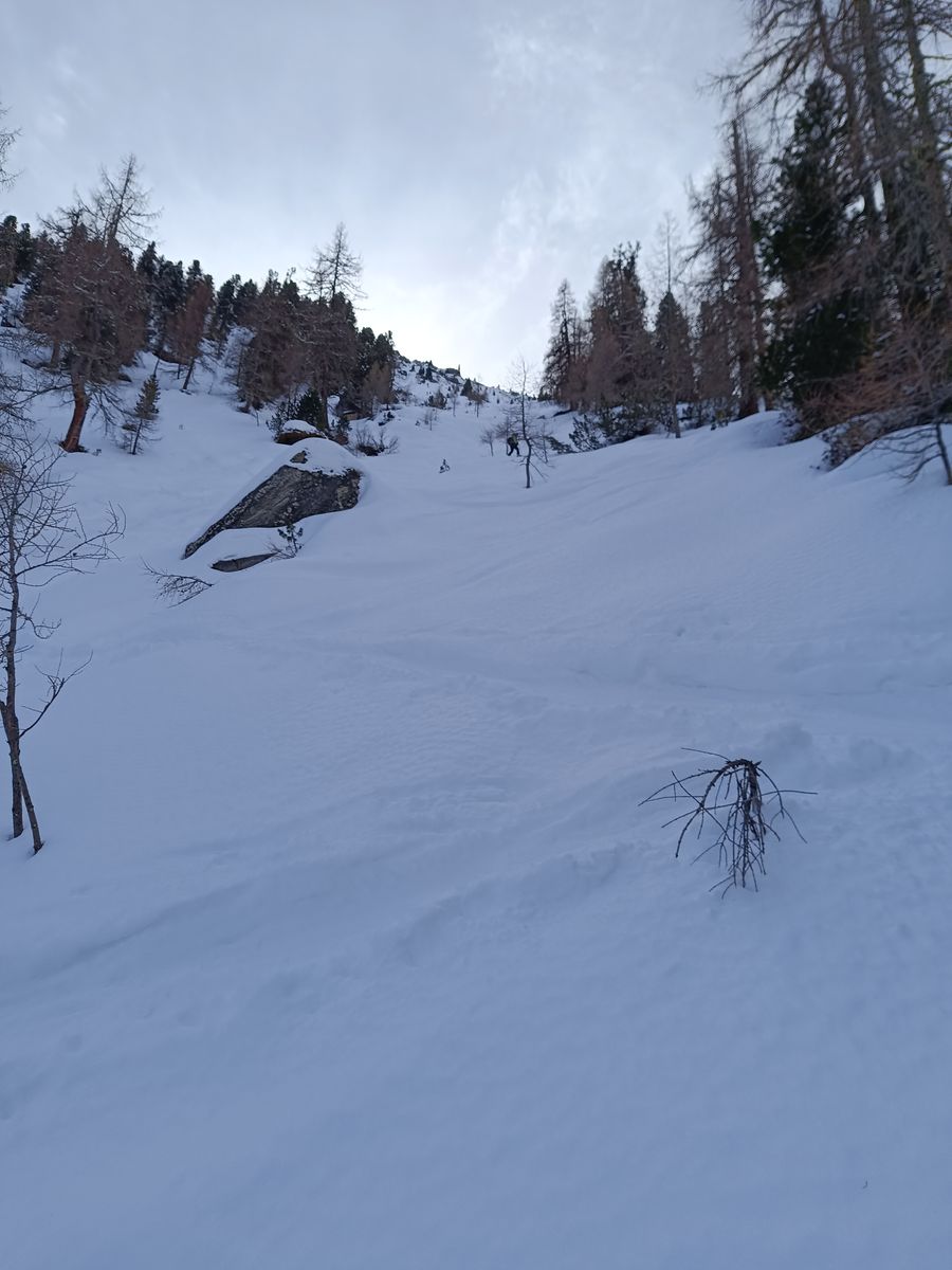 Talabfahrt: Normalerweise ist es üblich vom Tanz- bzw. Schwarzkarkogel über eine der steilen Waldschneisen zur Karalm abzufahren, aber die haben unten raus nur sehr wenig Schnee. Daher ist es momentan besser, sich nach dem Gipfelhang weit rechts zu halten und über die Karhochalm in der Unteren Grund zu gelangen (man passiert dabei den Abzweig zum Westeracherkogel).
