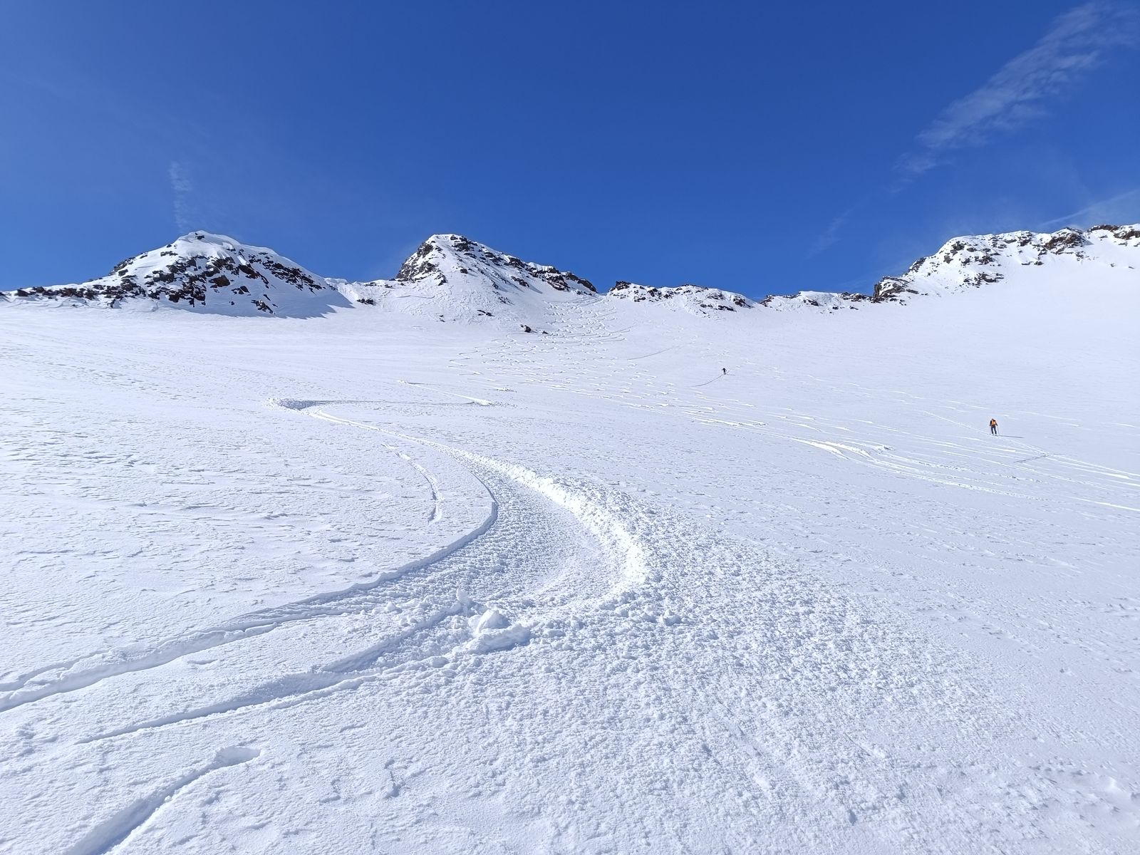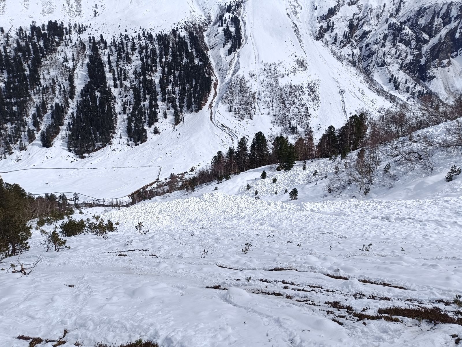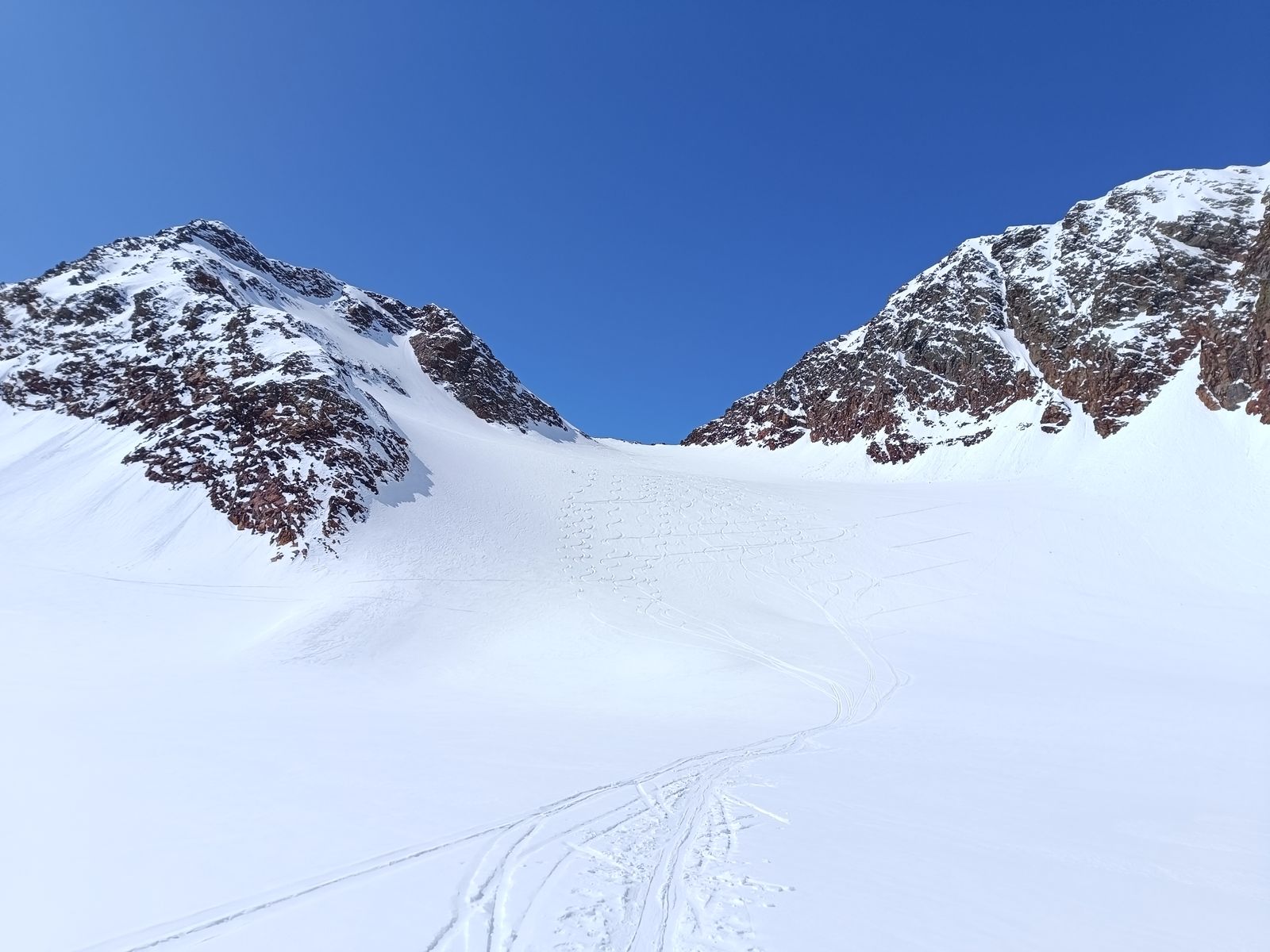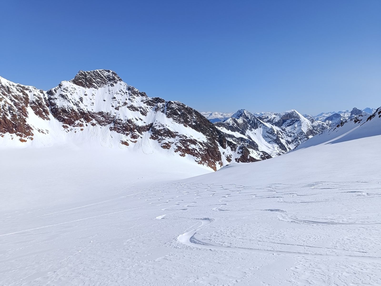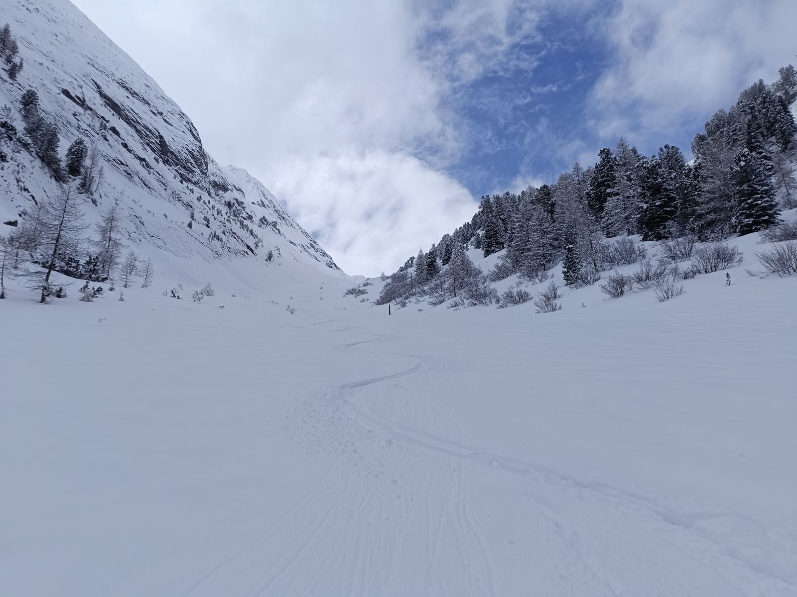 Schneeverhältnisse: Auf dem Gletscher pulvrig, aber windbeeinflusst und zerfahren, danach hart und griffig. Es hat auch weiter unten im Wald so gut wie nicht aufgefirnt. Da muss man auf der engen, steilen Trasse schon sehr gut auf den Skiern stehen, da bei Stürzen hohes Verletzungspotenzial gegeben ist und auch Abstürze im steilsten Teil (da hat der Hang - aber nicht die Trasse - locker 50 Grad. Diese Passage ist für mich auch der Grund, den Magerstein nicht als "Einsteiger-Skihochtour" zu klassifizieren - außer es ist nicht so hart wie heute oder man hat Steigeisen dabei.