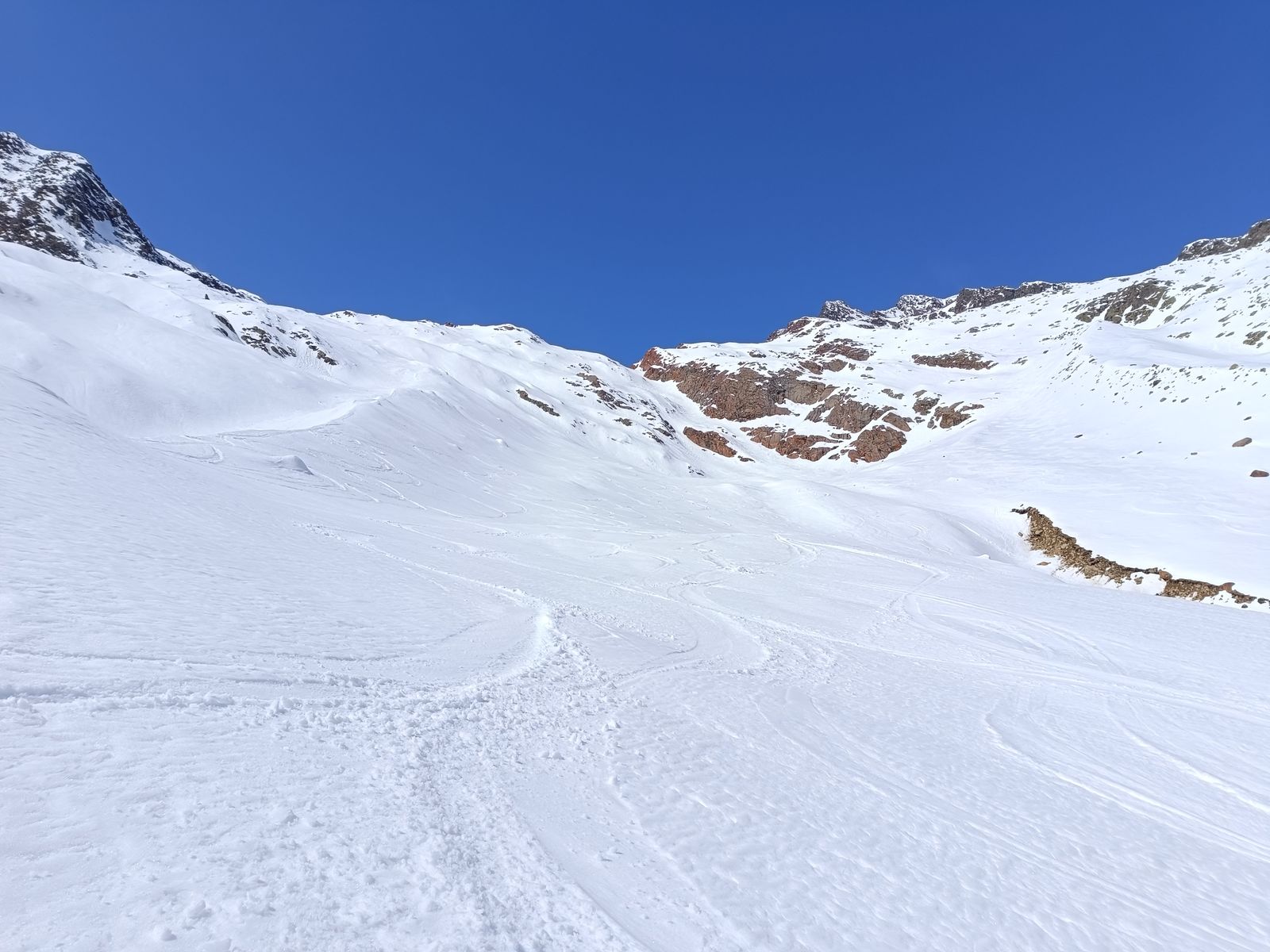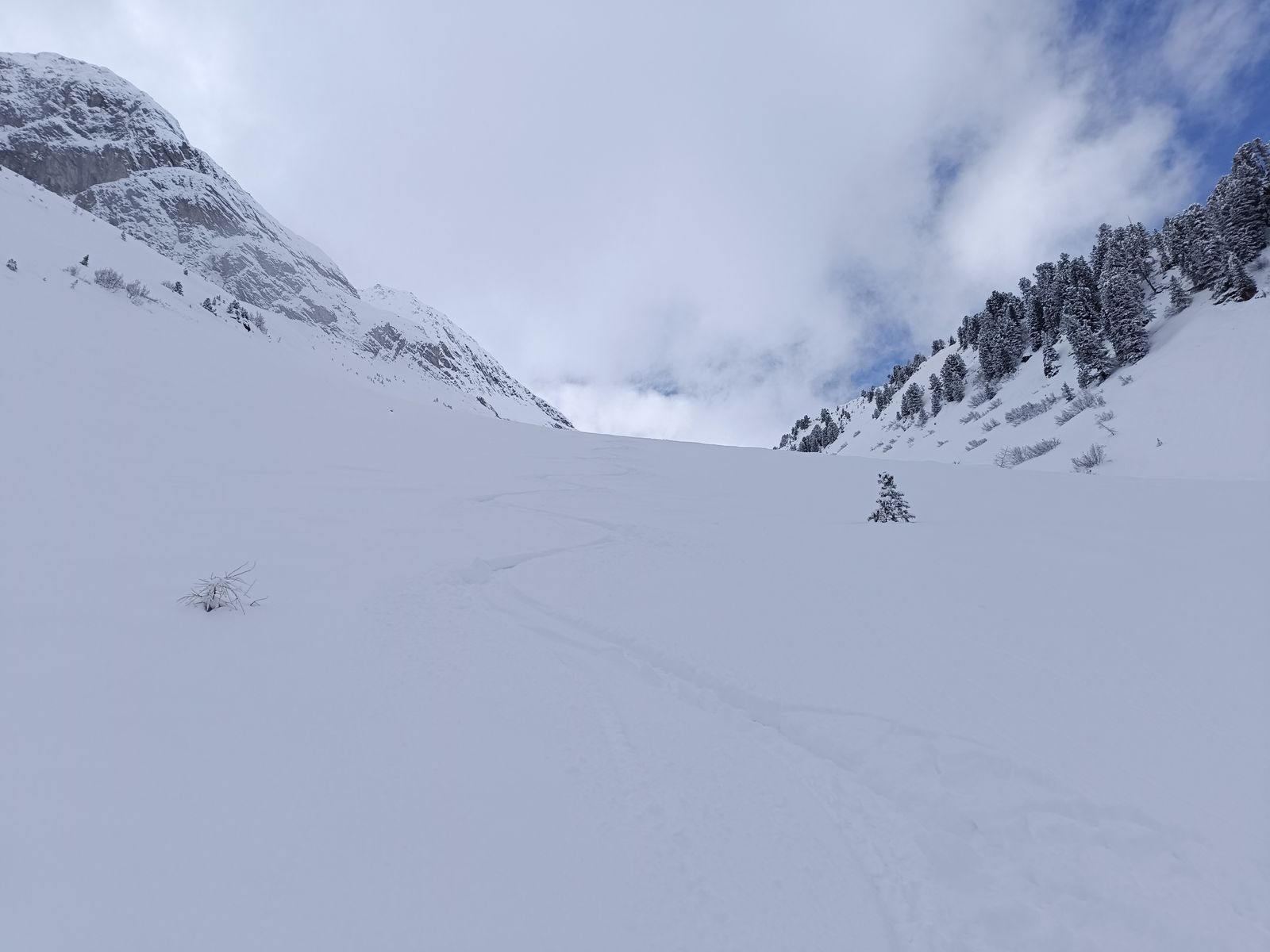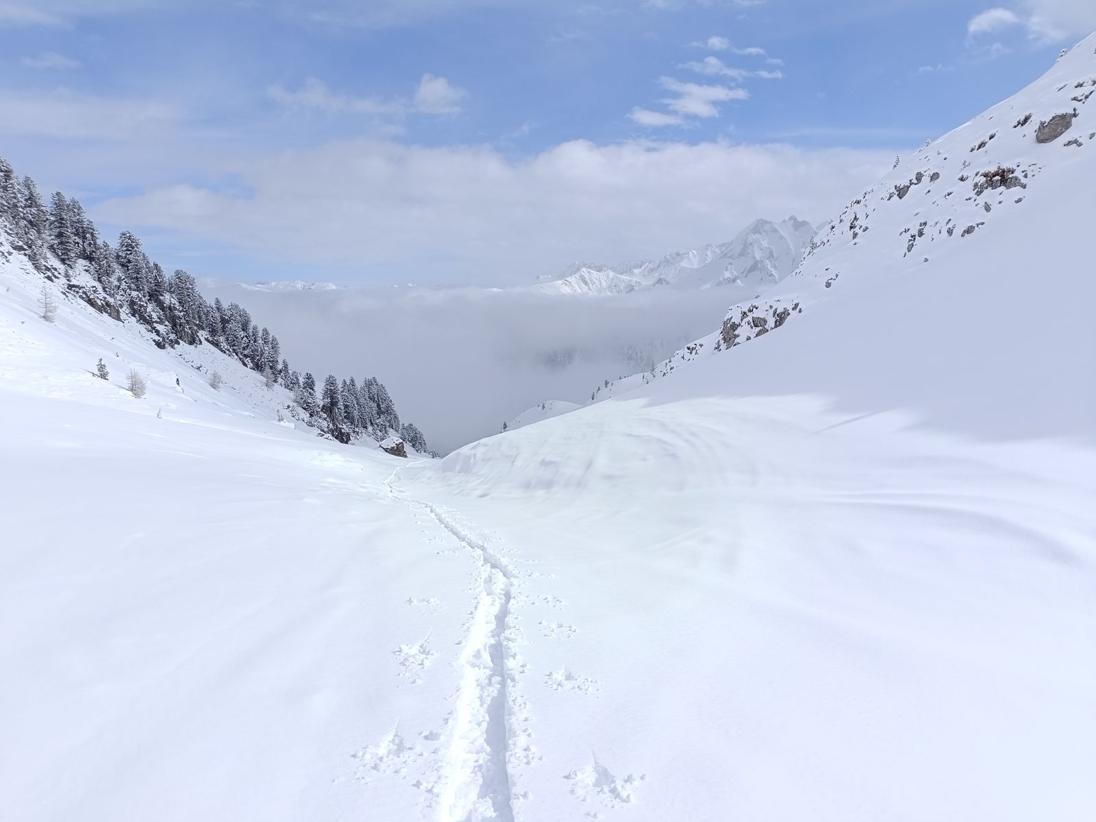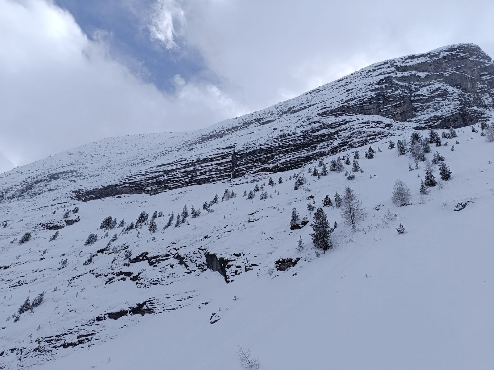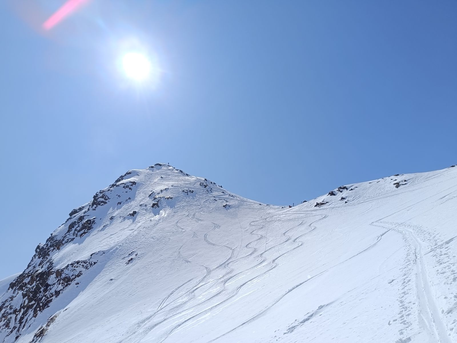 Schneeverhältnisse: Auf dem Gletscher pulvrig, aber windbeeinflusst und zerfahren, danach hart und griffig. Es hat auch weiter unten im Wald so gut wie nicht aufgefirnt. Da muss man auf der engen, steilen Trasse schon sehr gut auf den Skiern stehen, da bei Stürzen hohes Verletzungspotenzial gegeben ist und auch Abstürze im steilsten Teil (da hat der Hang - aber nicht die Trasse - locker 50 Grad. Diese Passage ist für mich auch der Grund, den Magerstein nicht als "Einsteiger-Skihochtour" zu klassifizieren - außer es ist nicht so hart wie heute oder man hat Steigeisen dabei.