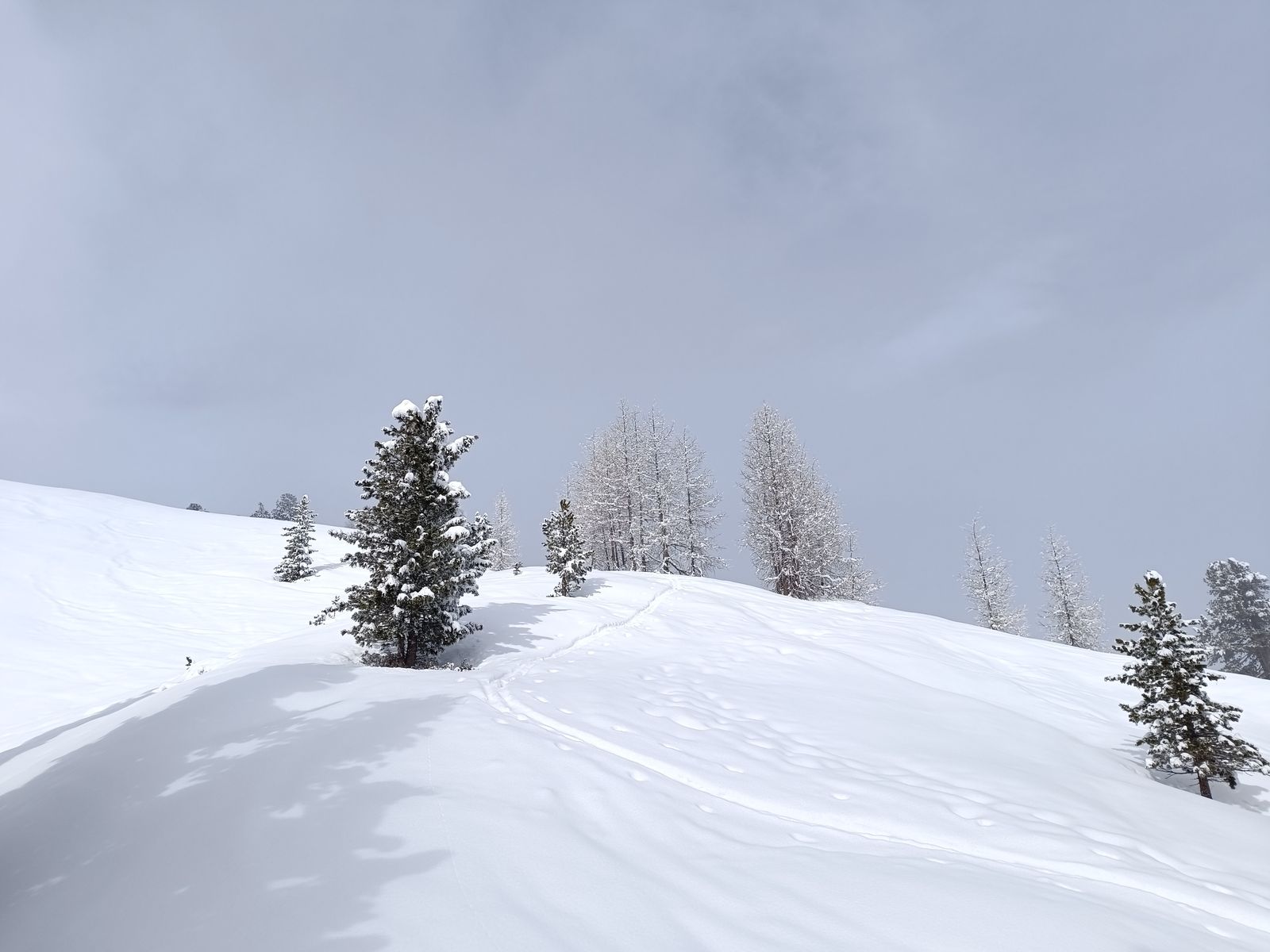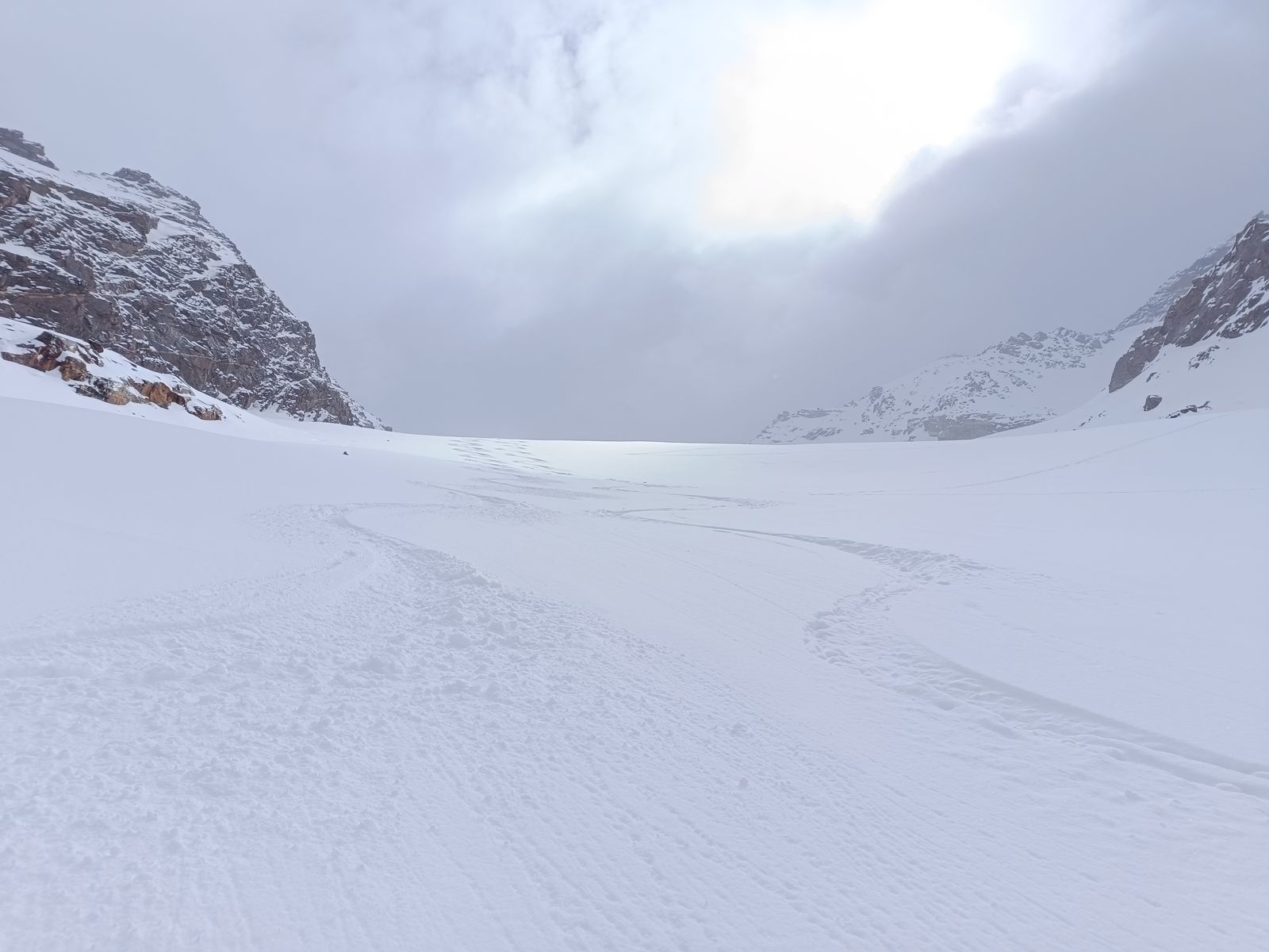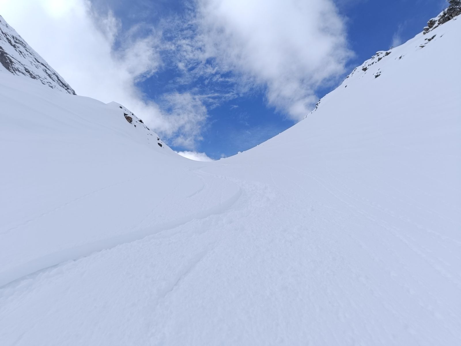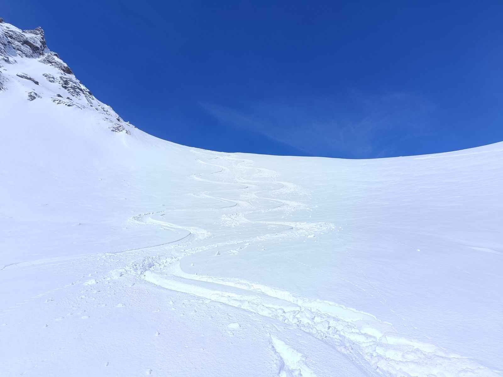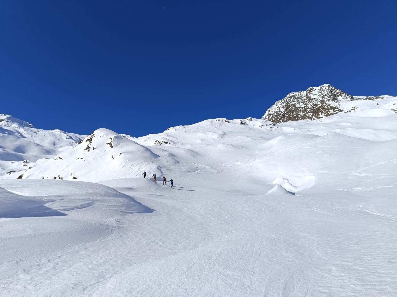 Schneeverhältnisse: Auf dem Gletscher pulvrig, aber windbeeinflusst und zerfahren, danach hart und griffig. Es hat auch weiter unten im Wald so gut wie nicht aufgefirnt. Da muss man auf der engen, steilen Trasse schon sehr gut auf den Skiern stehen, da bei Stürzen hohes Verletzungspotenzial gegeben ist und auch Abstürze im steilsten Teil (da hat der Hang - aber nicht die Trasse - locker 50 Grad. Diese Passage ist für mich auch der Grund, den Magerstein nicht als "Einsteiger-Skihochtour" zu klassifizieren - außer es ist nicht so hart wie heute oder man hat Steigeisen dabei.