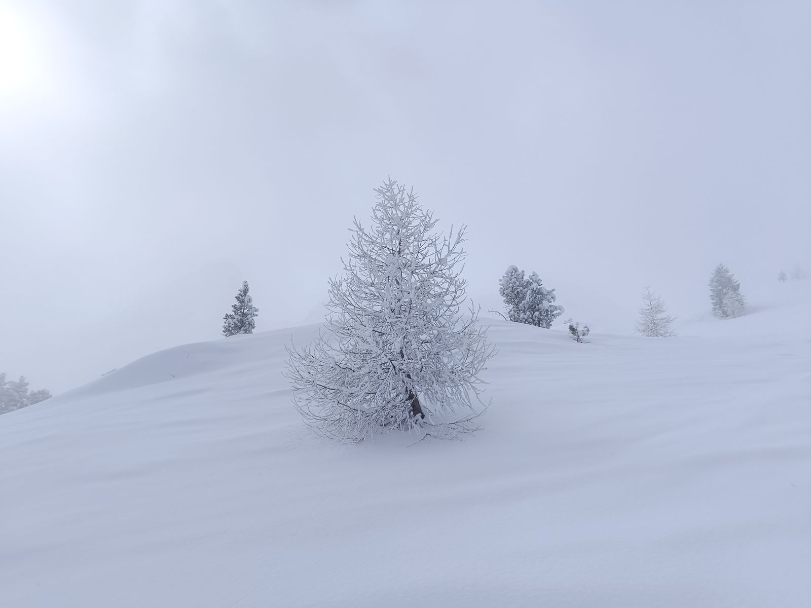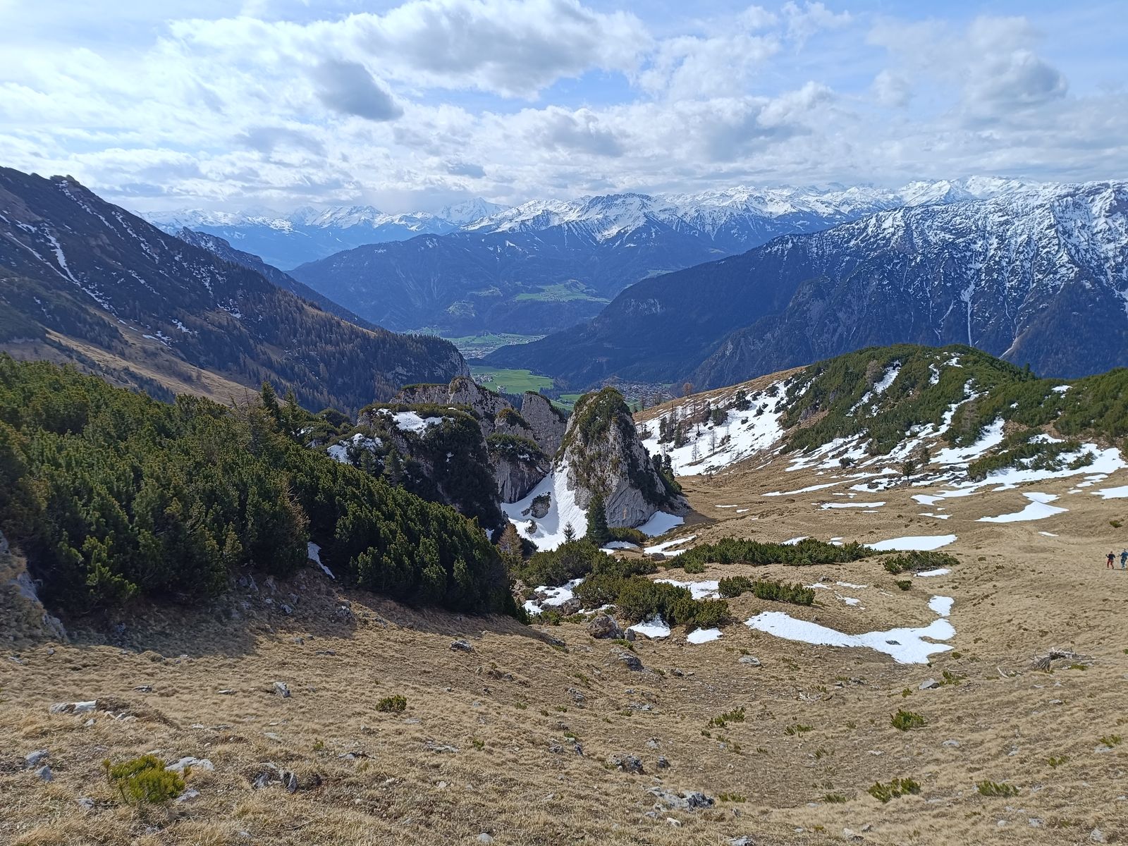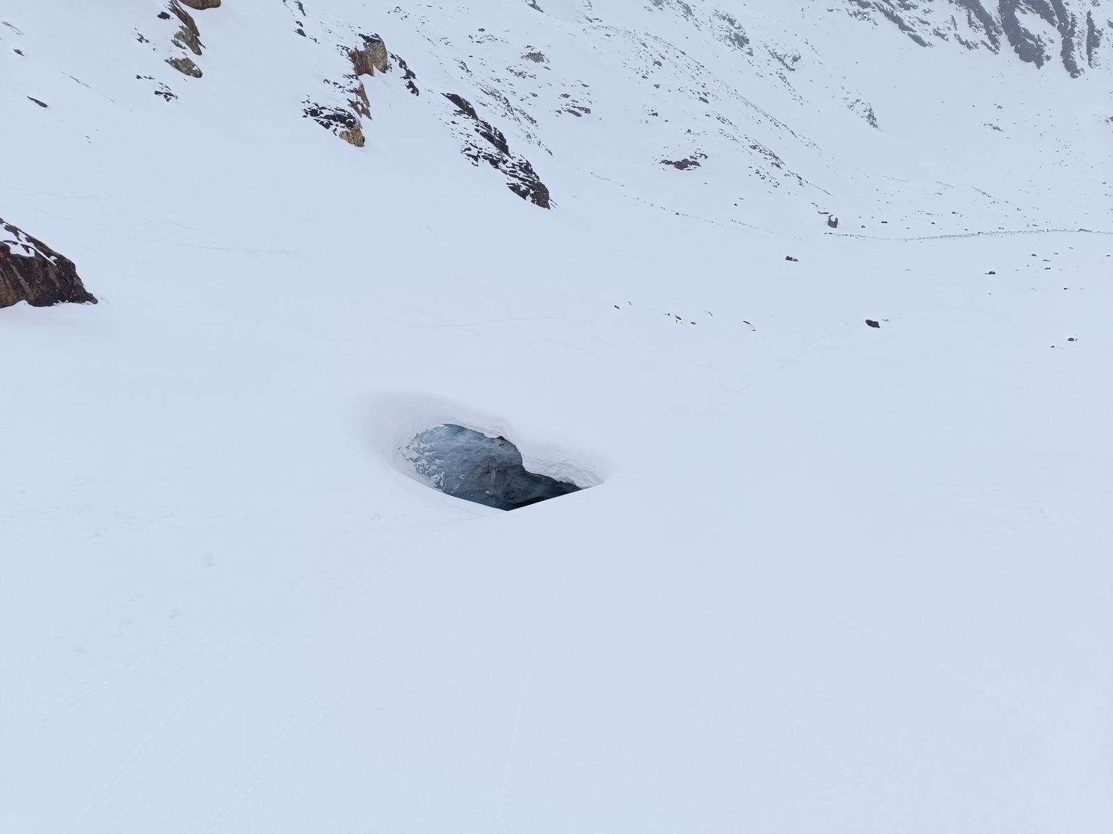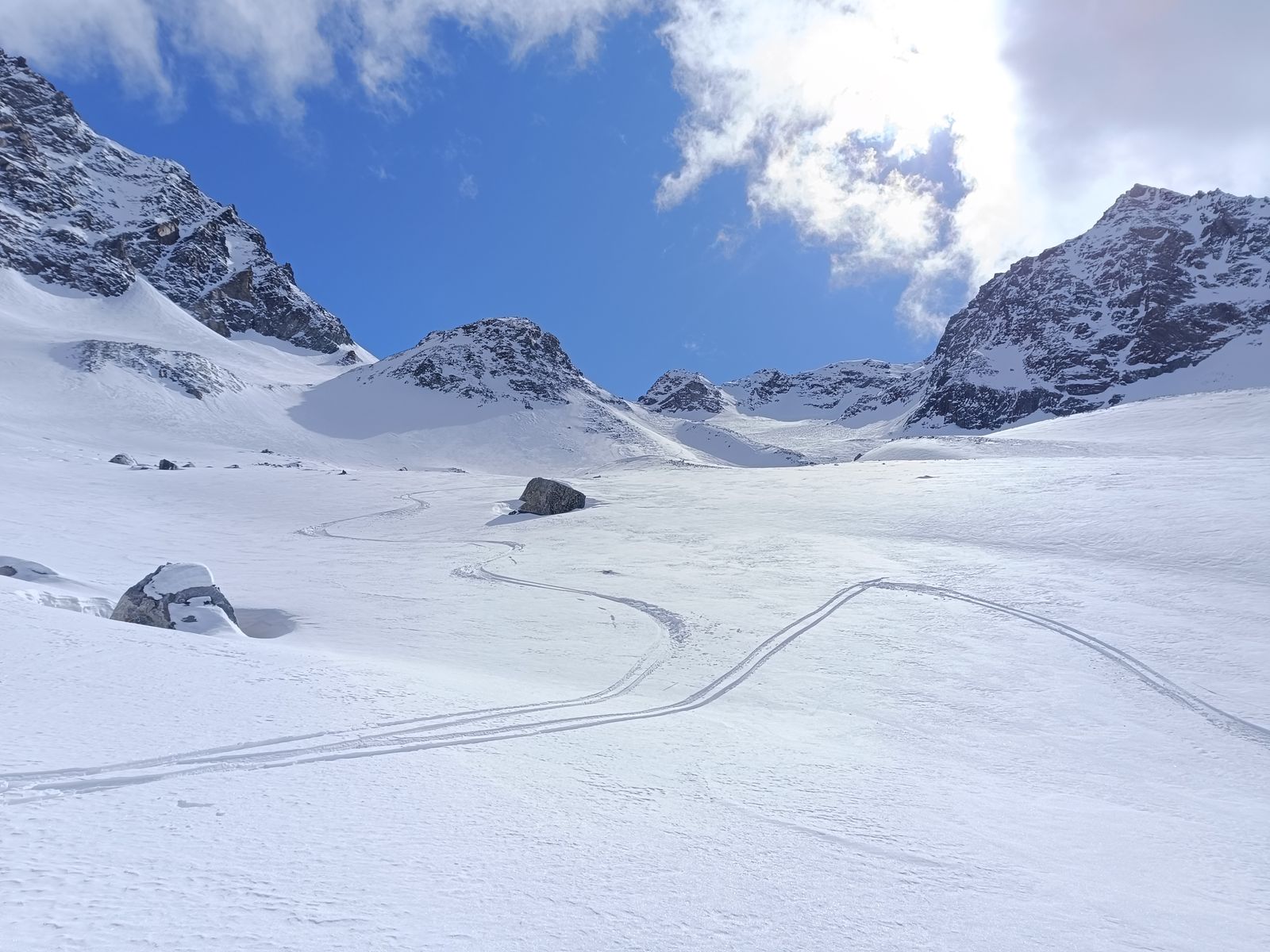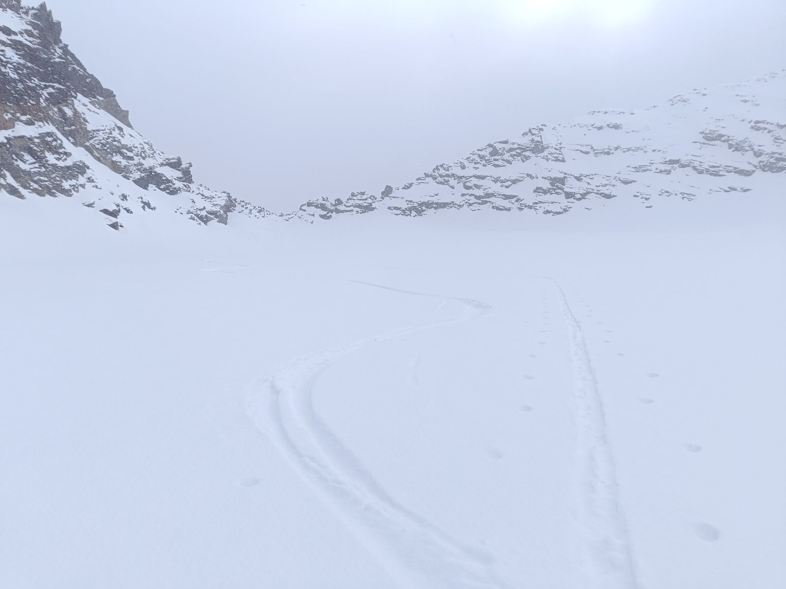 Schneeverhältnisse: Auf dem Gletscher pulvrig, aber windbeeinflusst und zerfahren, danach hart und griffig. Es hat auch weiter unten im Wald so gut wie nicht aufgefirnt. Da muss man auf der engen, steilen Trasse schon sehr gut auf den Skiern stehen, da bei Stürzen hohes Verletzungspotenzial gegeben ist und auch Abstürze im steilsten Teil (da hat der Hang - aber nicht die Trasse - locker 50 Grad. Diese Passage ist für mich auch der Grund, den Magerstein nicht als "Einsteiger-Skihochtour" zu klassifizieren - außer es ist nicht so hart wie heute oder man hat Steigeisen dabei.