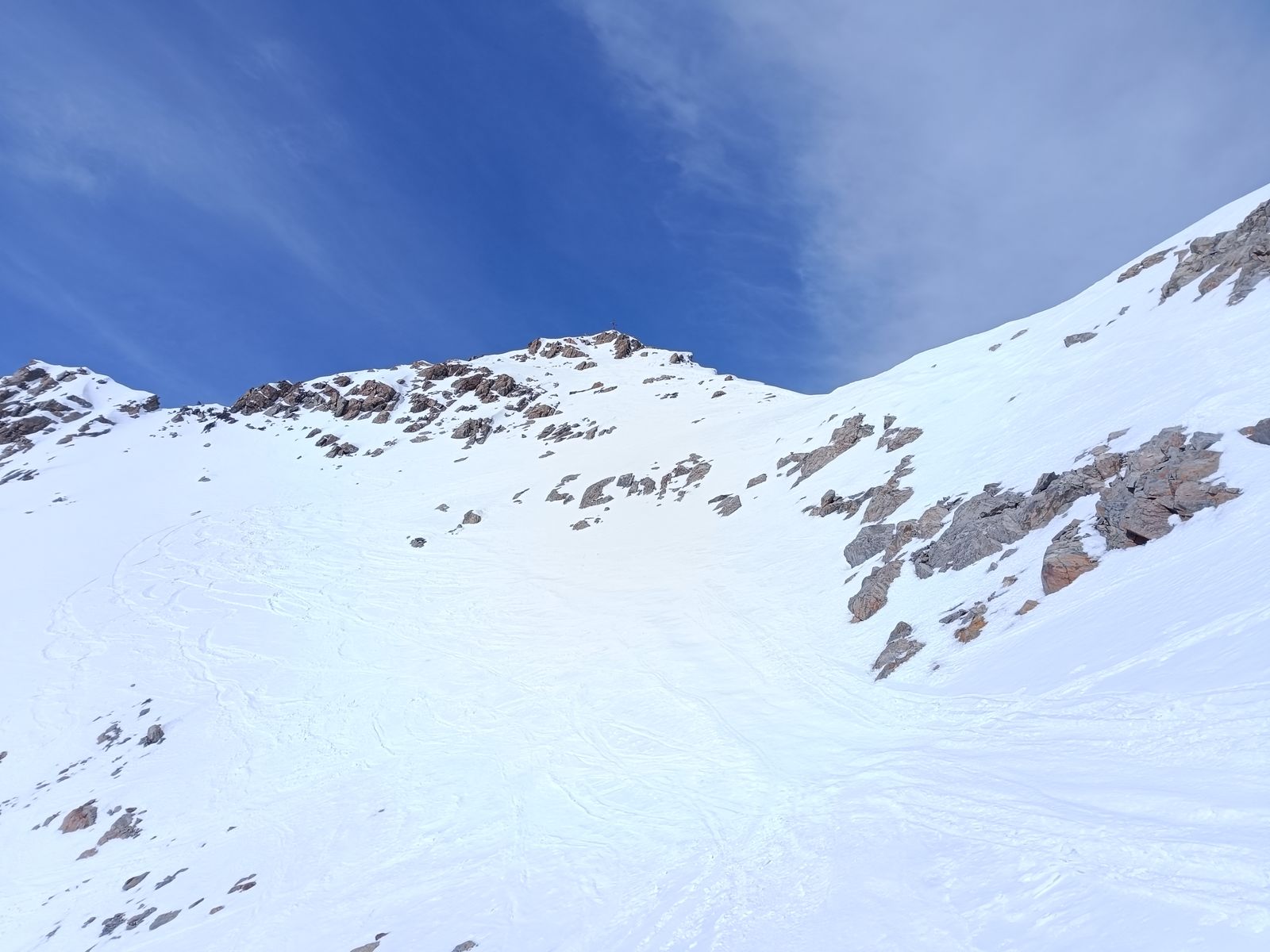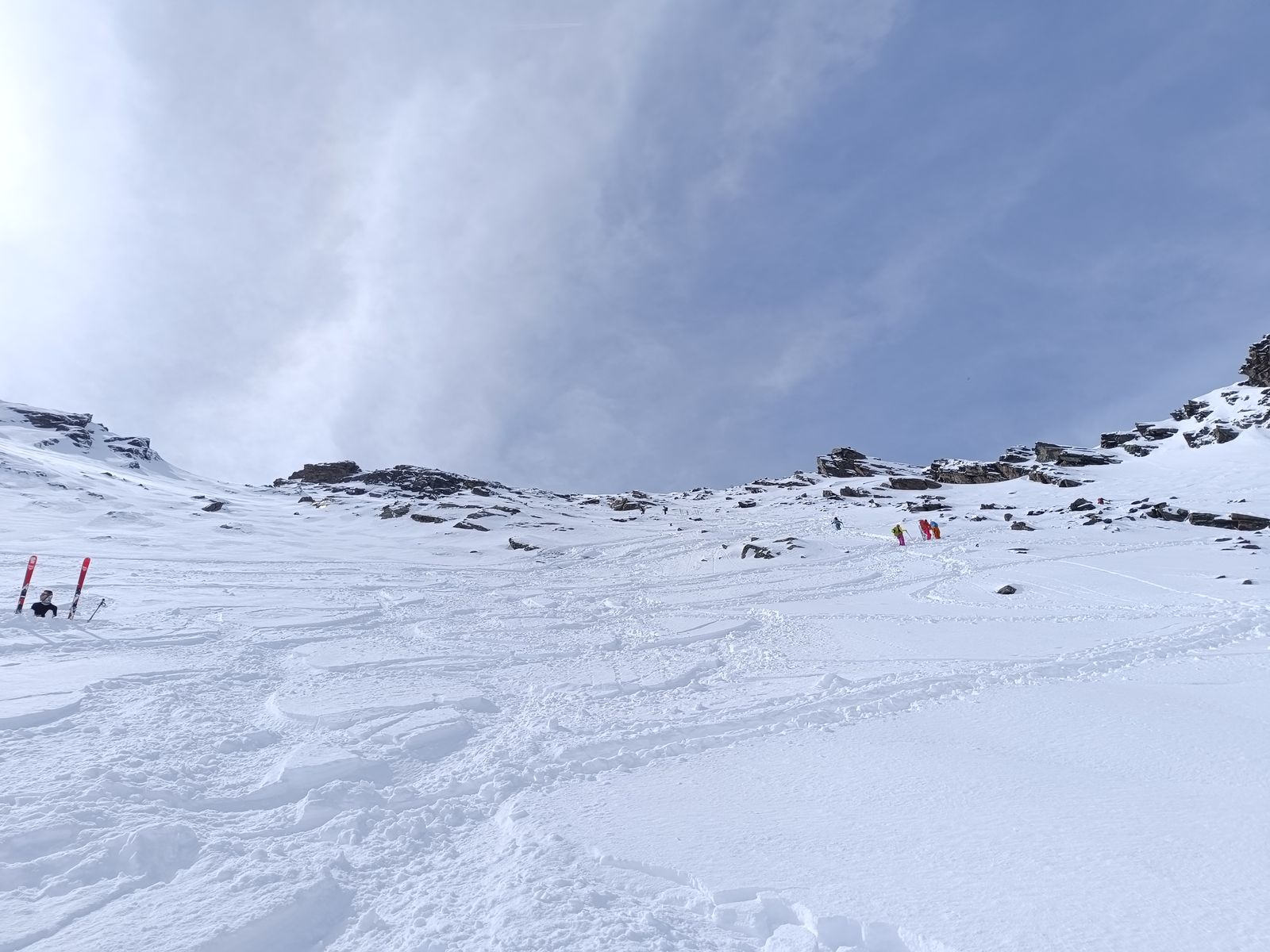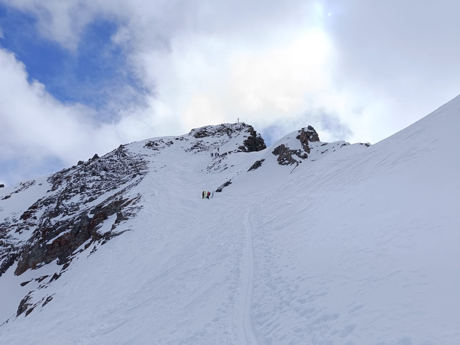 Vom PP geht es zunächst gemütlich los bis zum Steilstück auf dem Sommerweg der Kasseler Hütte (hat offen). Zunächst mit Harscheisen und im steilsten Stück mit Steigeisen werden etwa 250 Hm überwunden, bis es wieder gemütlicher wird. Es geht auch mit Skiern komplett hoch, aber ich hab auf so kraft- und nervenraubendes Herumgeeiere einfach keine Lust und ich war mit den Steigeisen auch schneller als die Leute mit Ski - trotz An- und Ausziehen.