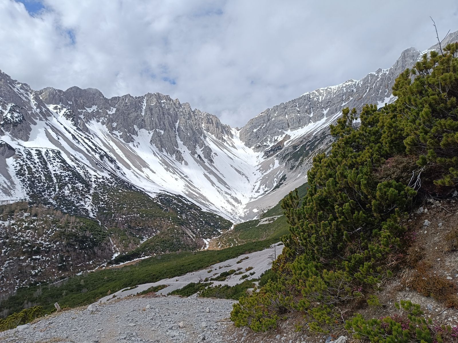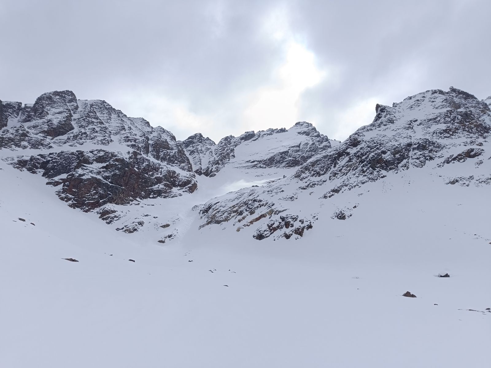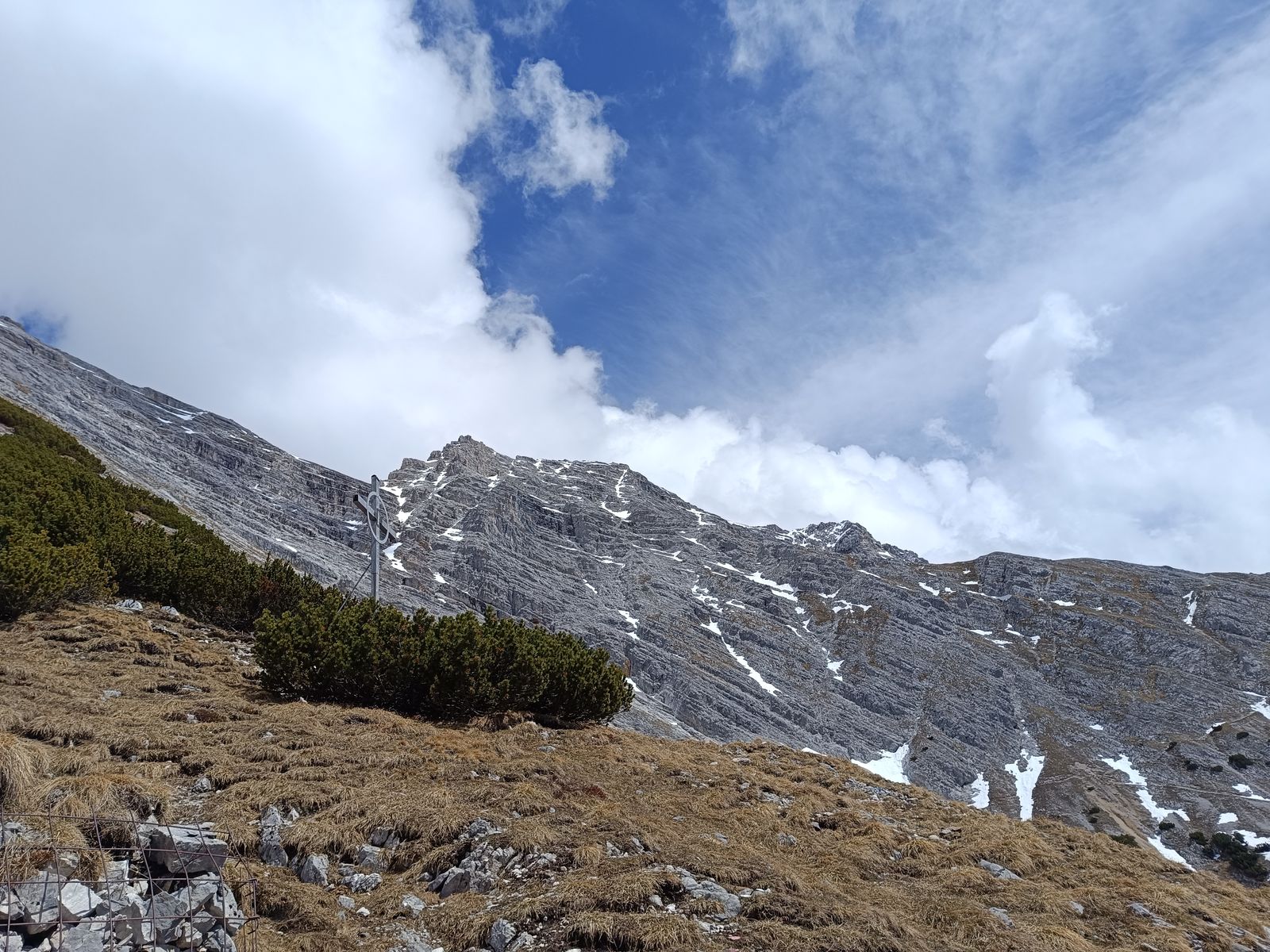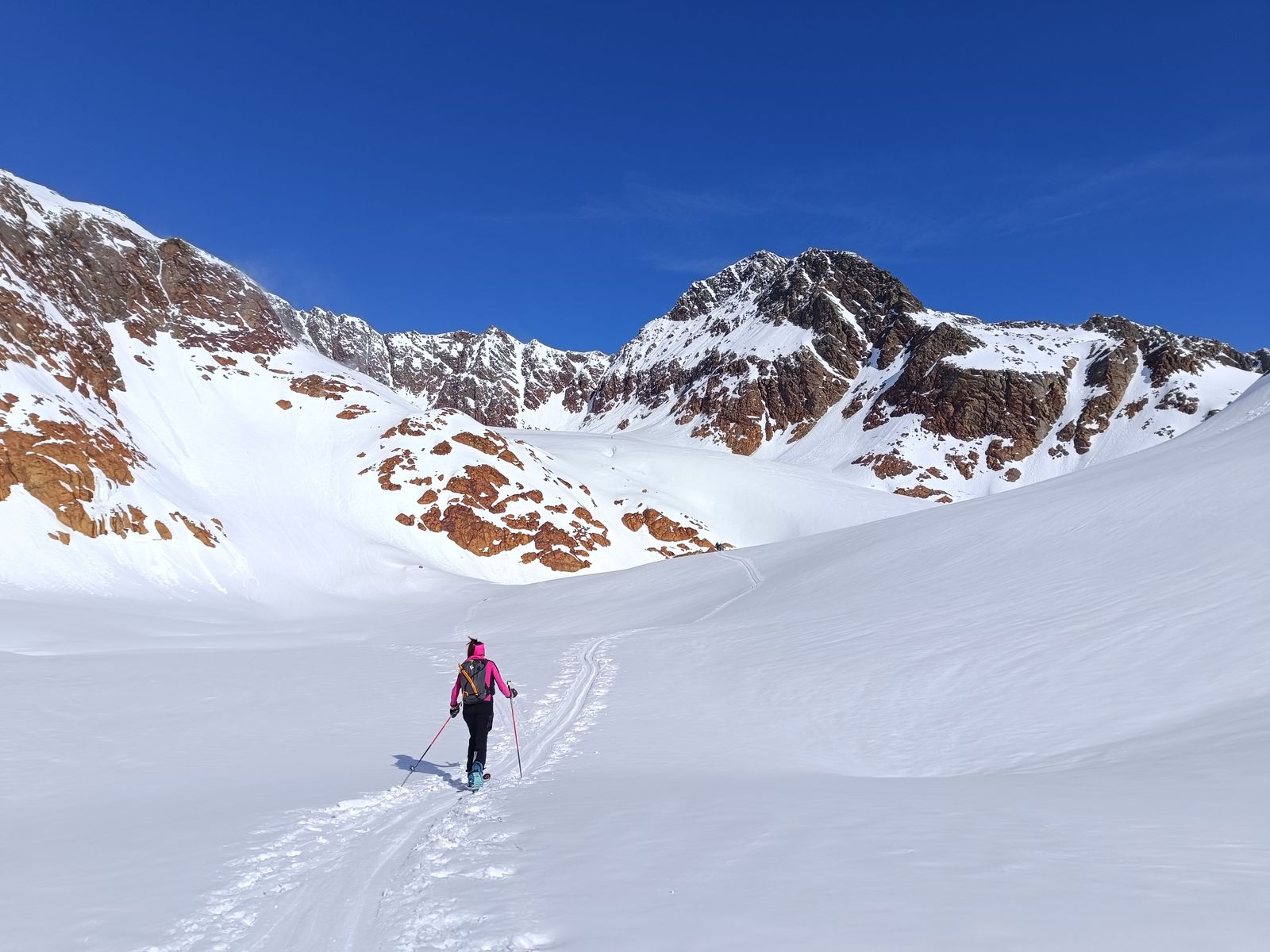 Vom PP geht es zunächst gemütlich los bis zum Steilstück auf dem Sommerweg der Kasseler Hütte (hat offen). Zunächst mit Harscheisen und im steilsten Stück mit Steigeisen werden etwa 250 Hm überwunden, bis es wieder gemütlicher wird. Es geht auch mit Skiern komplett hoch, aber ich hab auf so kraft- und nervenraubendes Herumgeeiere einfach keine Lust und ich war mit den Steigeisen auch schneller als die Leute mit Ski - trotz An- und Ausziehen.