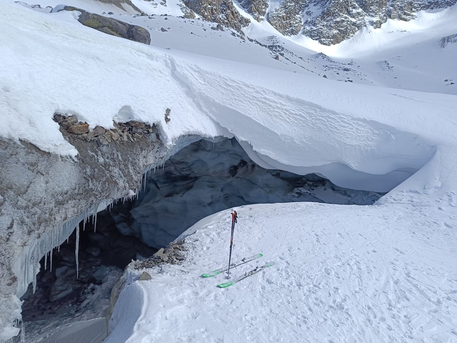 Der Rest der Tour ist dann einfach: Kasseler Hütte und über den Gletscher zum Magerstein. Ich bin allerdings zunächst zum Fernerköpfl abgezweigt, weil am Magerstein Massenauflauf war. Nach einer Abfahrt über den westlichen Ast des Rieserferners bis zu dessen Ende bei etwa 2600 Metern, hab ich wieder aufgefellt und bin dieses Mal zum Magerstein, wo nur noch ein Pärchen mit einem wunderschönen und sehr braven Husky war. Abfahrt auf der Standardroute.