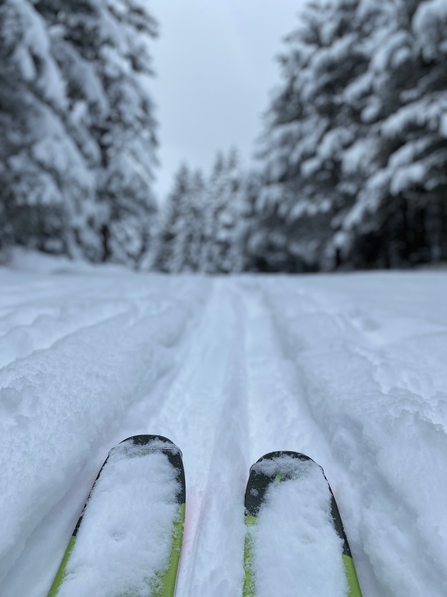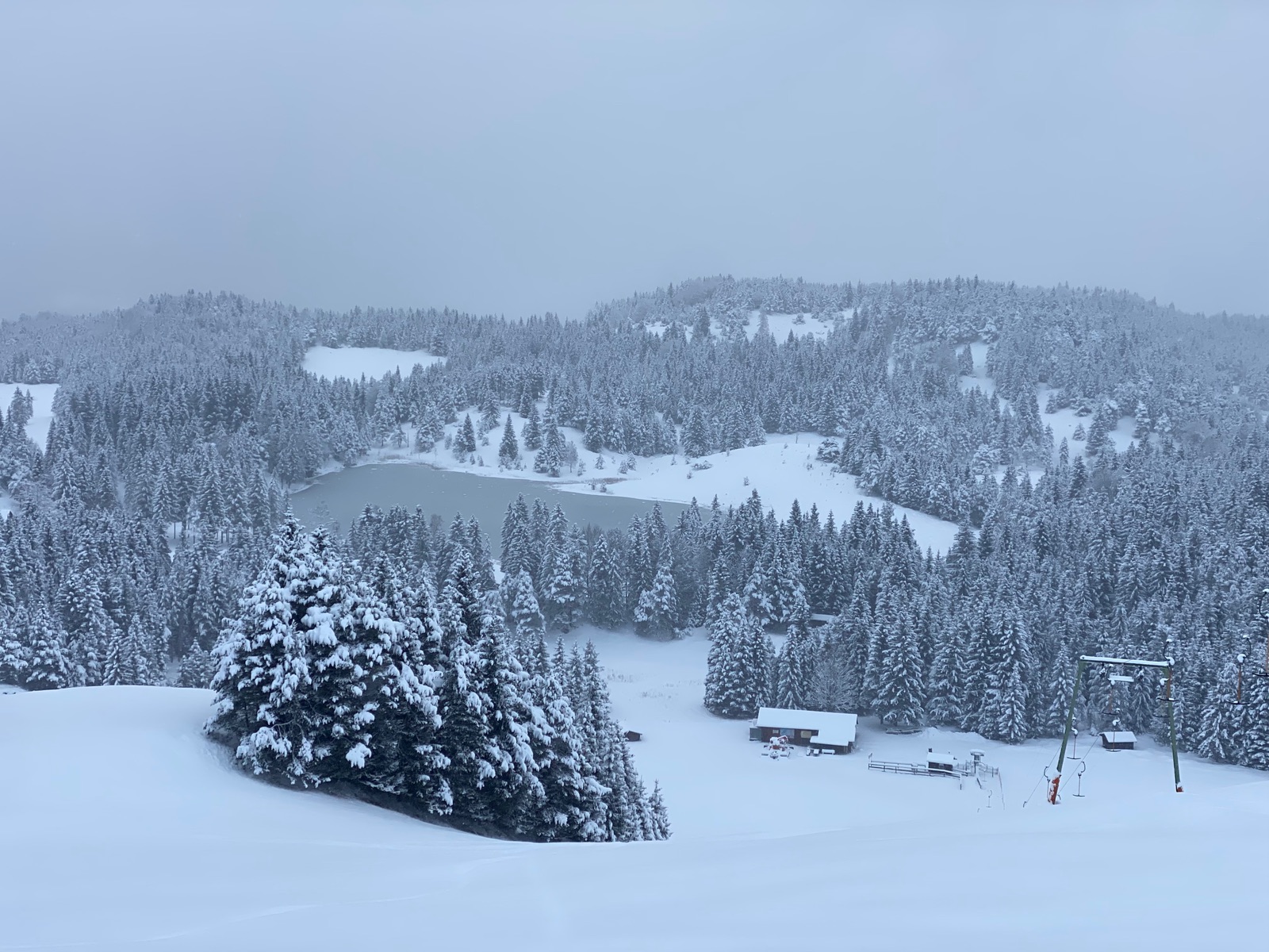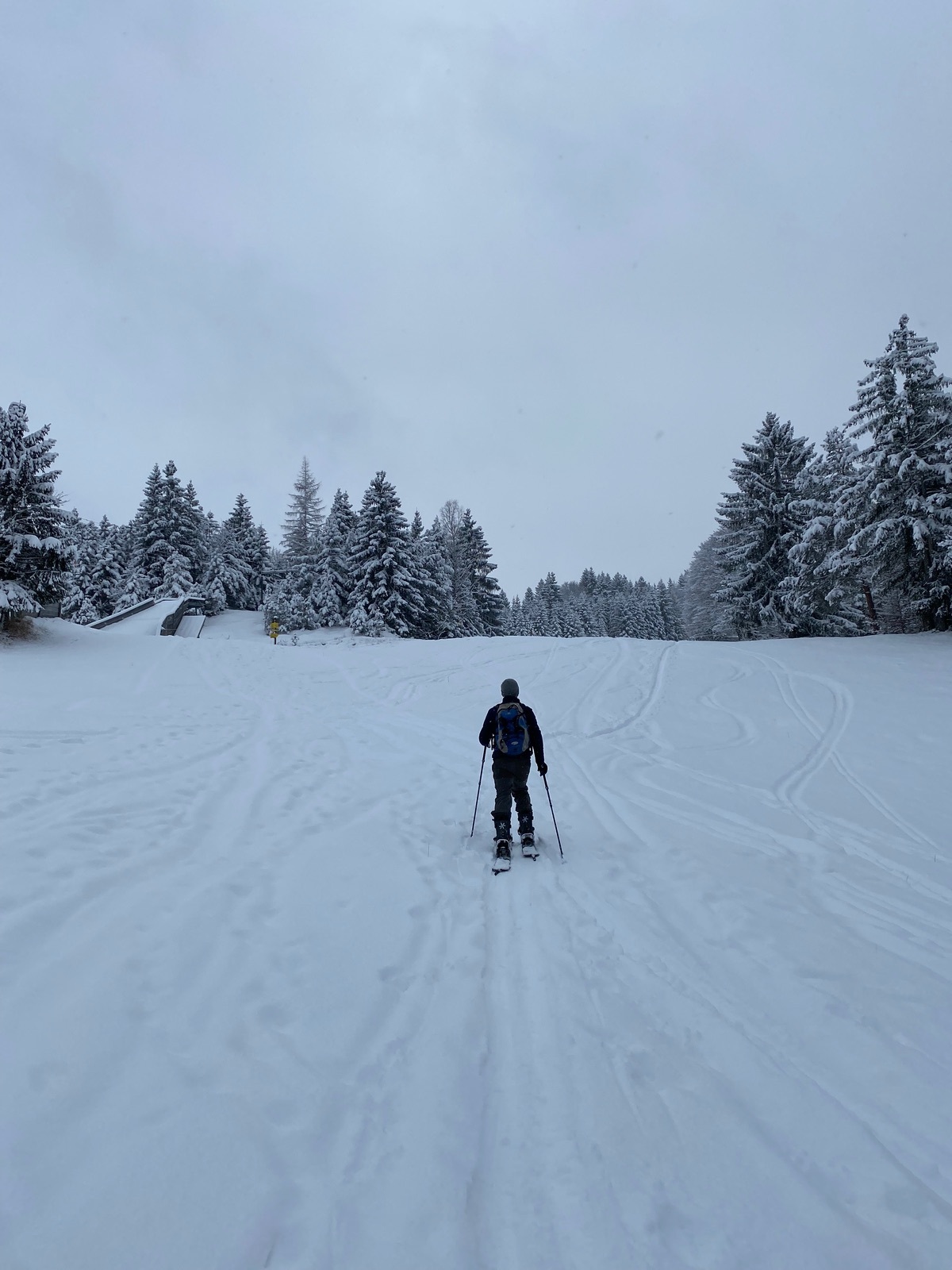 Wir haben heute ein kleines Abenteuer gewagt. Wir waren uns nicht sicher, ob es vom Schnee her für eine Abfahrt reichen würde. Aber wir waren überwältigt! Unten am Parkplatz schaute hier und da noch ein bisschen Gras raus, aber die Pistenraupen haben heute angefangen, die Piste zu walzen. An der Höhe nach dem ersten Schlepplift war es dann Winterwonderland pur