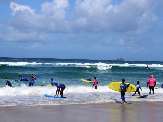 Kosten: Anfängerkurse (2,5 bis 3 Std.) kosten etwa 30 Pfund, wobei das Equipement inbegriffen ist. Wagt man sich in den Folgetagen alleine in die Wellen, betragen die Leihgebühren für ein Surfboard und ein Wetsuite pro Tag um 20 bis 25 Pfund. In den Sommermonaten sind die vergleichsweise niedrigen Wellen für Anfänger ideal.