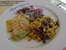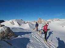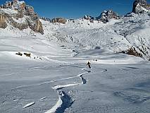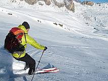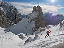 Doch der Ort hat noch mehr Geheimnisse zu bieten. Hier oben am Mondeval hat man eine 7000 Jahre alte Mumie gefunden. Sie ist also älter als Ötzi, wenn auch nicht so berühmt. Begutachten kann man sie in einem Museum im kleinen Ort Selva di Cadore. Aber nicht nur für Skitourengeher, auch für Variantenfahrer und Freerider ist Cortina ein Paradies. Ein landschaftlich fast nicht endender Genuss ist zum Beispiel die 12 km lange Abfahrt vom Lagazuoi. Steht man an der Gipfelhütte, dem Rifugio Lagazuoi, kommt man zudem aus dem Staunen nicht mehr heraus. So ein Panorama rechtfertigt sogar einmal eine Fahrt mit der Seilbahn. Dass man hier oben auch noch aufs Beste kulinarisch versorgt wird, versteht sich von selbst. Und genau das ist ebenfalls typisch für Cortina: eine gute Küche gehört in Italien bei Genuss-Skitouren einfach mit dazu!
