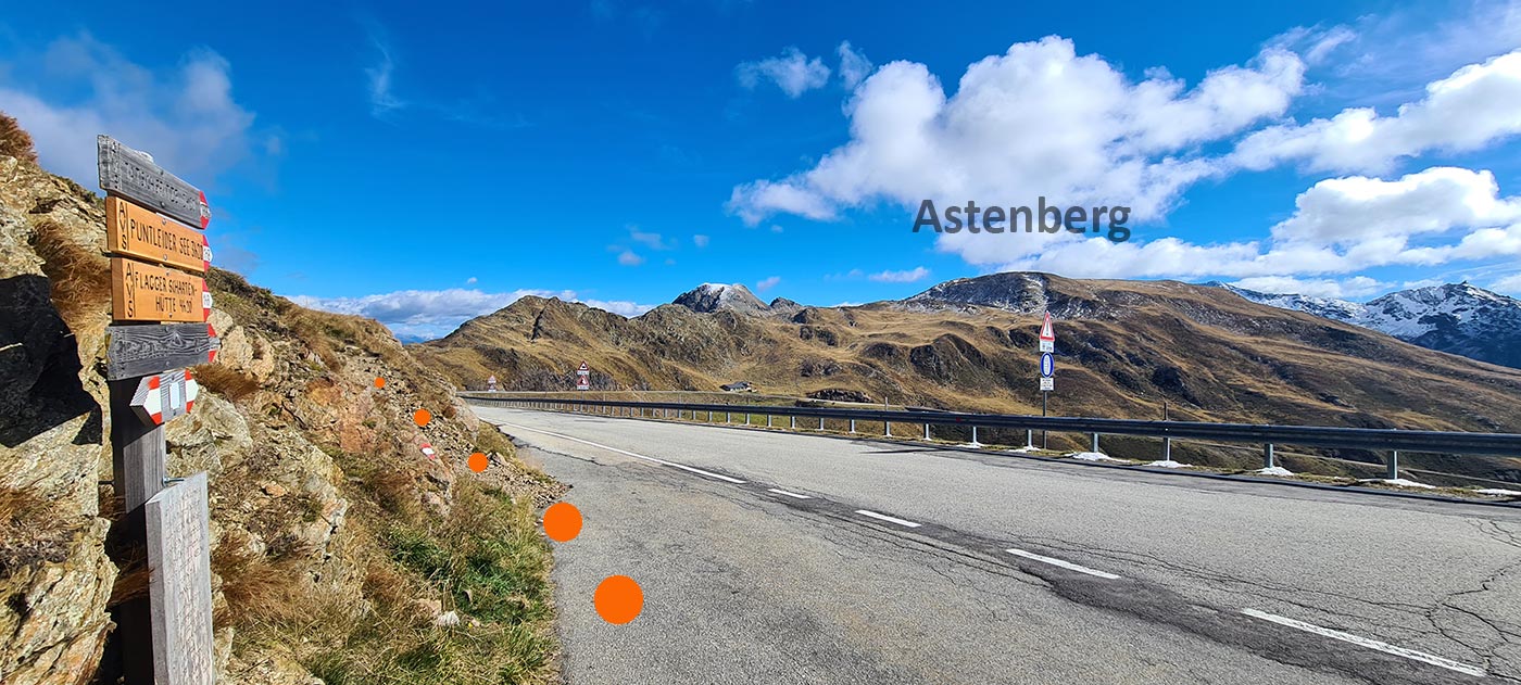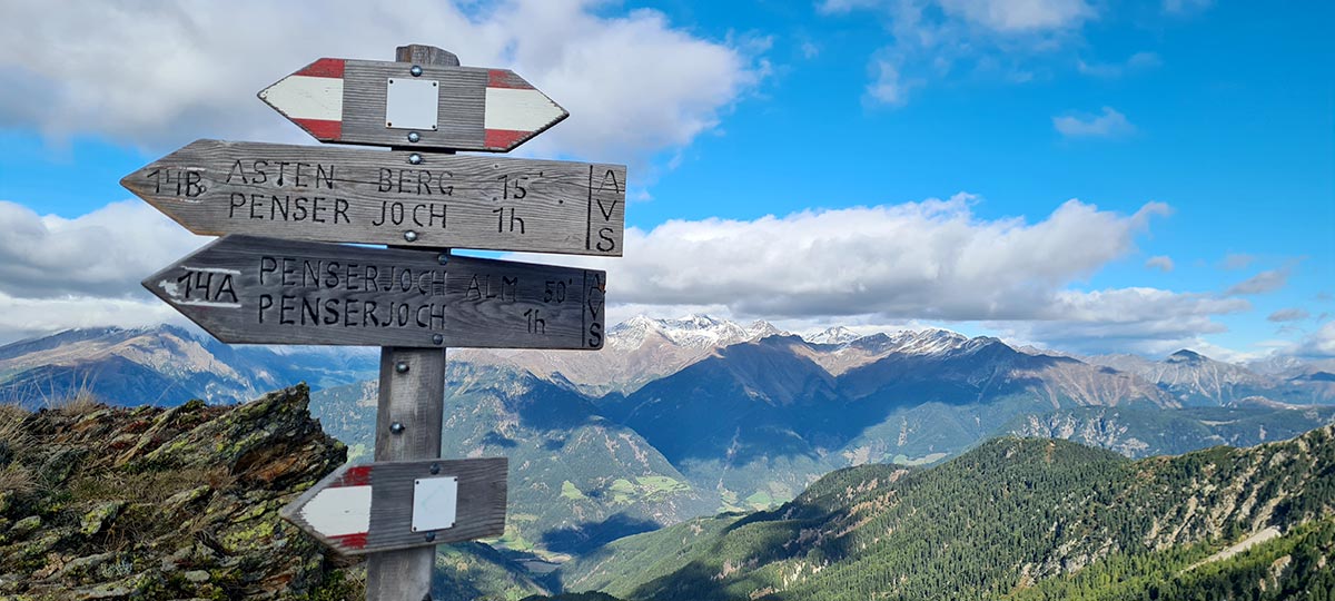 Abstieg: Man überschreitet den Gipfel nach Süden, dann dreht der Weg links ab und führt entlang des grasigen Ostrückens zu einem Wegweiser. Hier ist erneut das Penser Joch ausgeschildert. Man folgt dem Wegweiser scharf nach rechts und hat nun steile Grashänge nach Südwesten zu queren. Danach dreht der Weg 14 A nach Norden ein (führt also um den Astenberg herum). Immer auf dem Steig nach Norden bis man die Penser Joch Alm (2129 m) erreicht und somit die Passstraße. Auf ihr etwa 700 Meter und 80 Hm hinauf zum Ausgangspunkt.