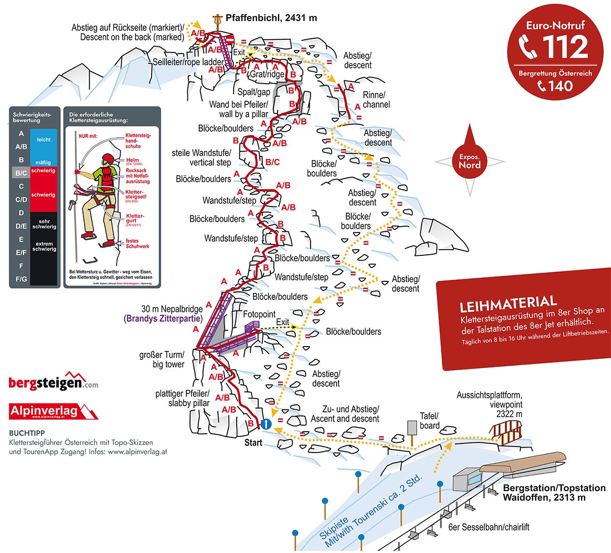Ausrüstung: Volle Klettersteigausrüstung mit Gurt, KS-Set, Helm, geeigneten Handschuhen. Bei Vereisung auch Steigeisen. Leihmaterial ist im 8er Shop (Talstation 8er Jet) erhältlich. Öffnung täglich von 8 bis 16 Uhr.