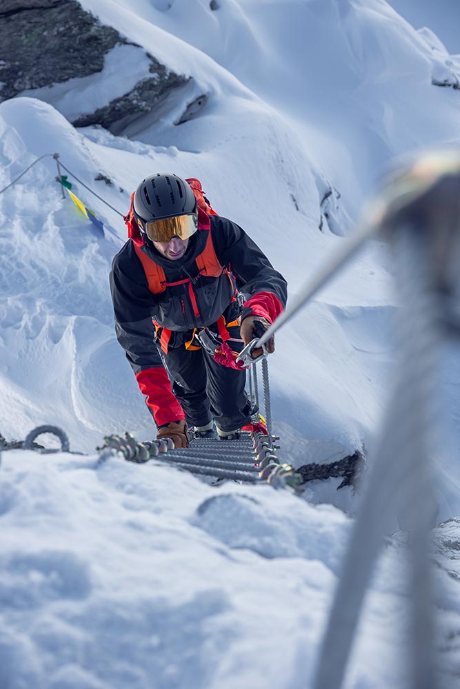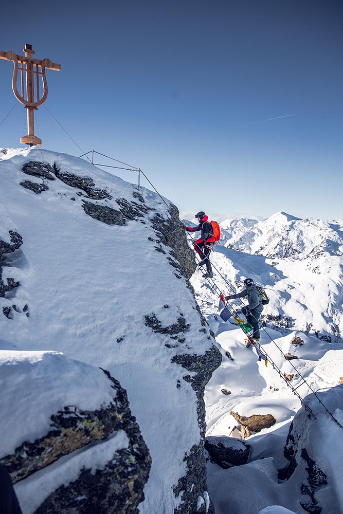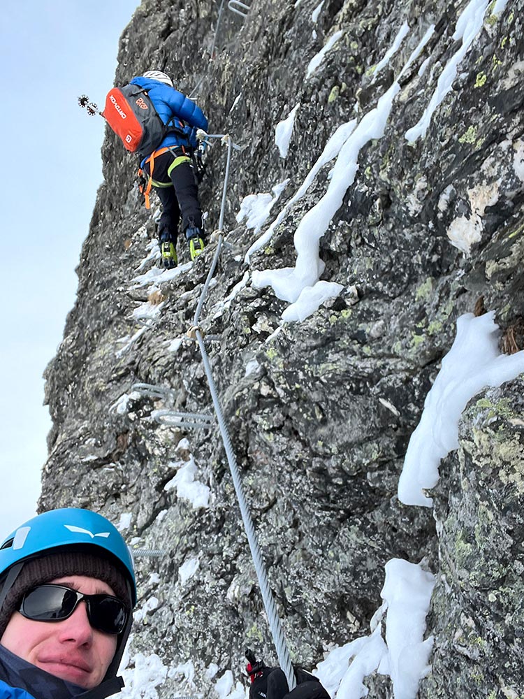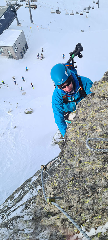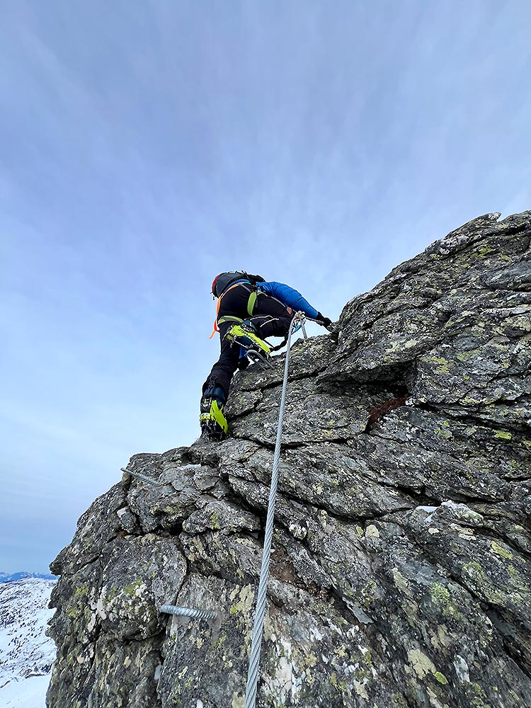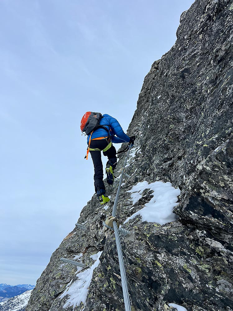 Charakter/Schwierigkeit: Mäßig schwieriger, sehr gut mit Drahtseil und Eisenkrampen gesicherter, kurzer Klettersteig mit A- und B-Stellen. Mit Skistiefel ist aber auch das nicht ganz einfach; ebenso ist der Steig bei Vereisung deutlich schwieriger zu bewerten. Bei normalen Verhältnissen sind Steigeisen eher hinderlich, bei Vereisung können sie aber auch obligatorisch sein. Ca. 280 Meter Kletterlänge und 115 Höhenmeter. Und auch beim Abstieg muss man noch einmal kurz kräftig hinlangen.